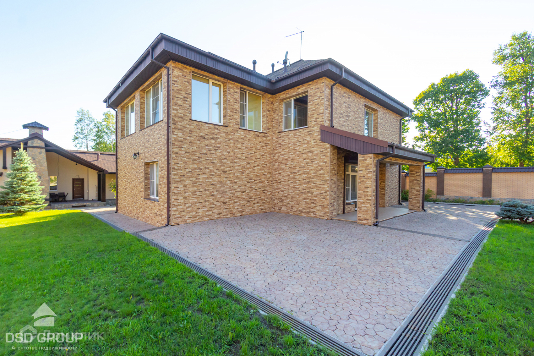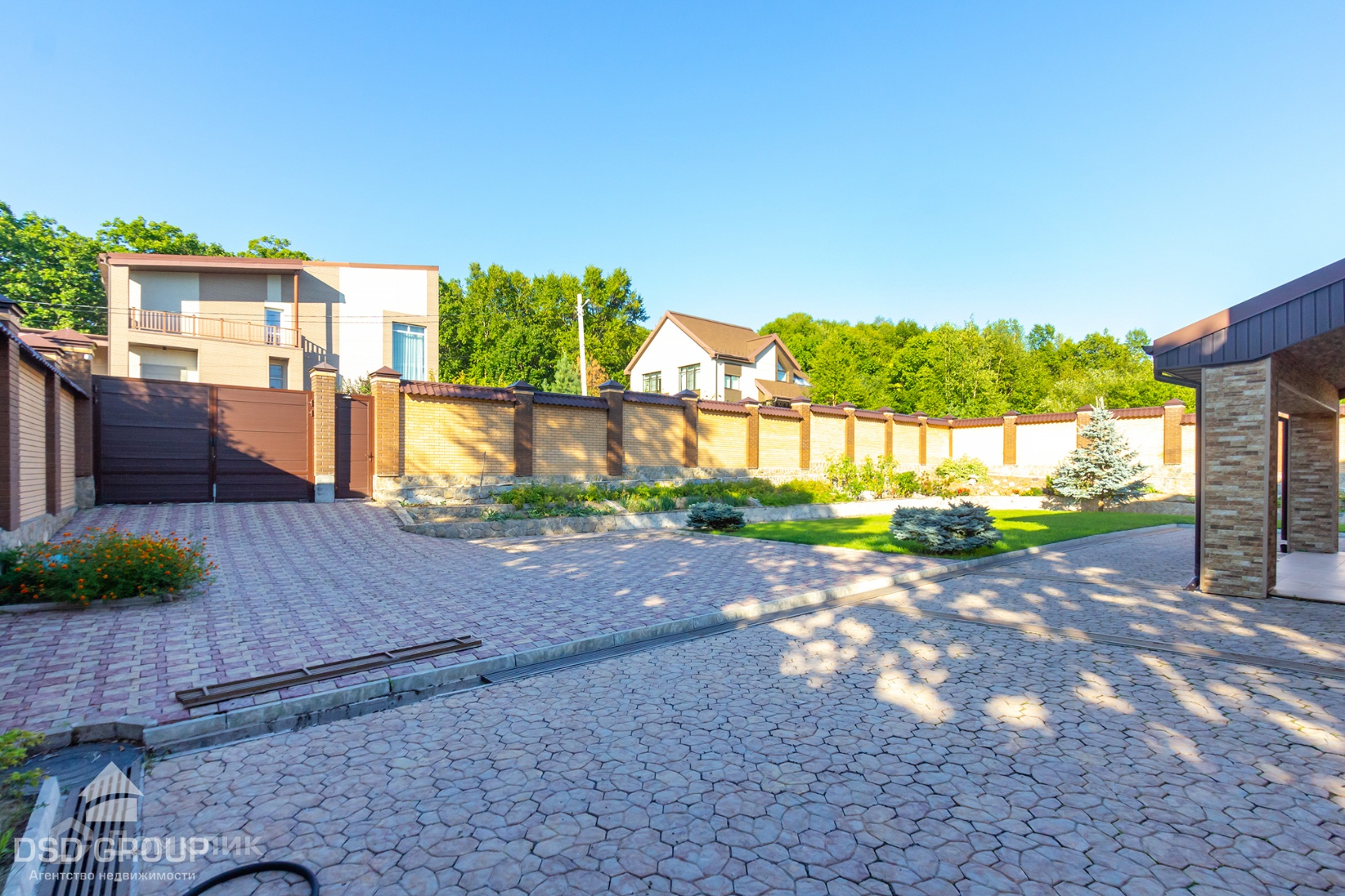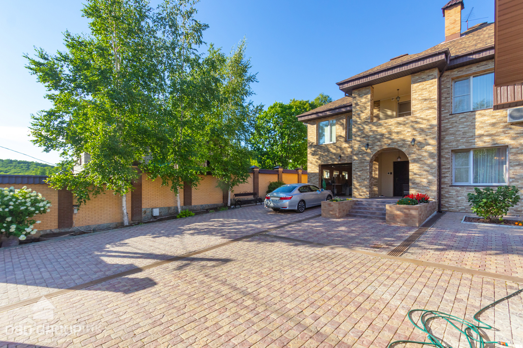 Территория дома огорожена забором из высококлассного облицовочного кирпича, установлена сигнализация и видеонаблюдение, ворота на электроприводе, по периметру освещение.