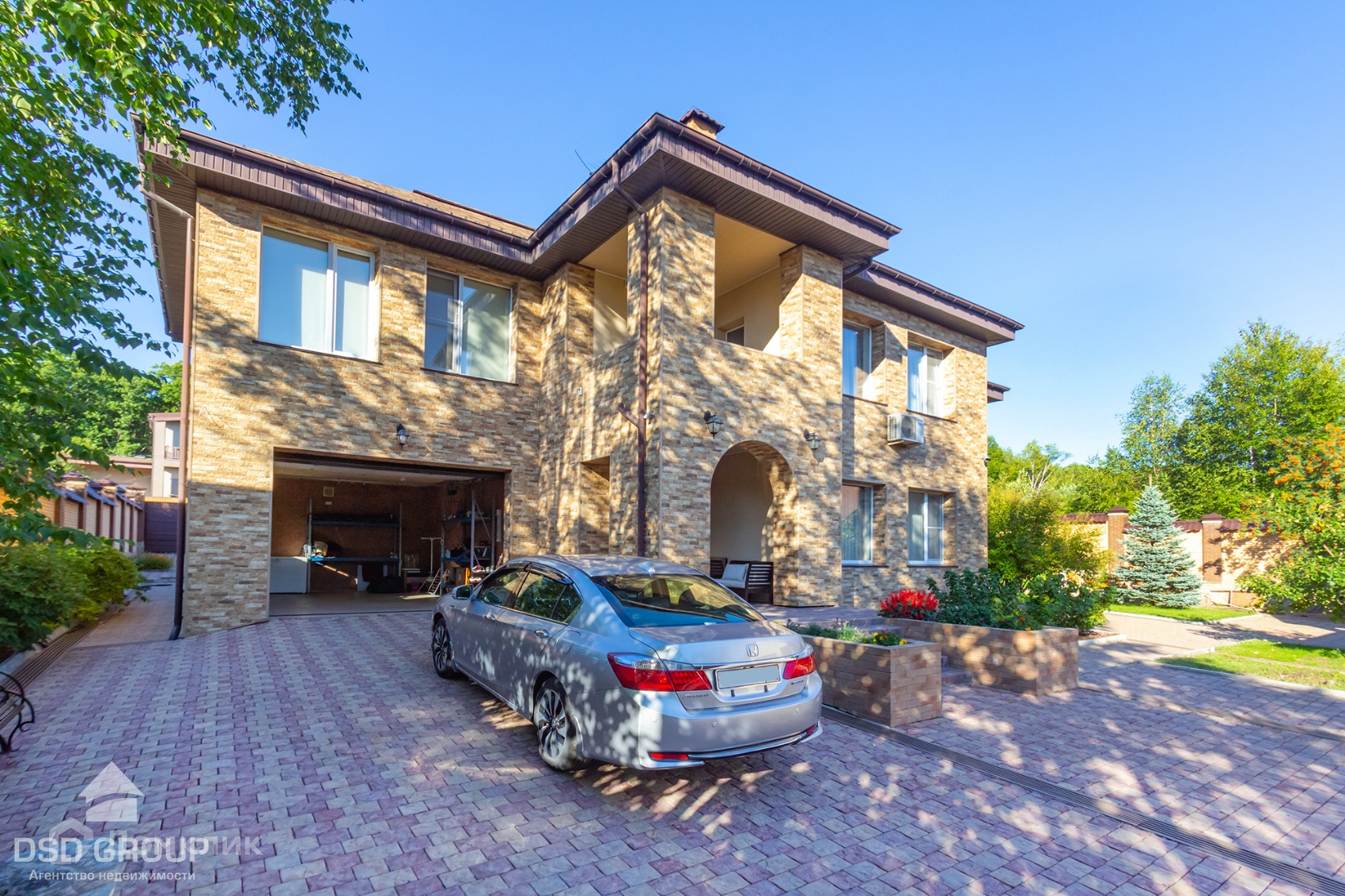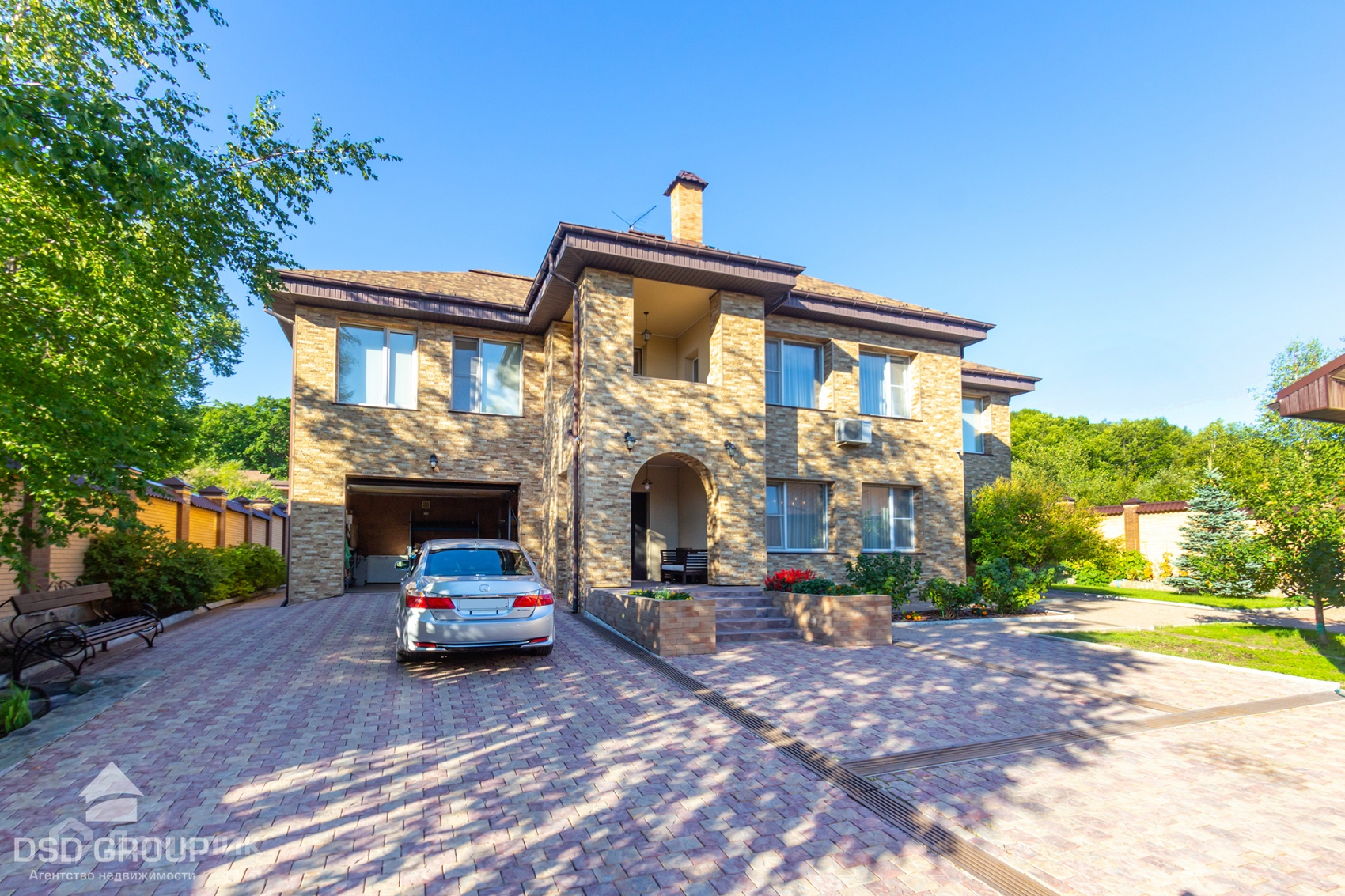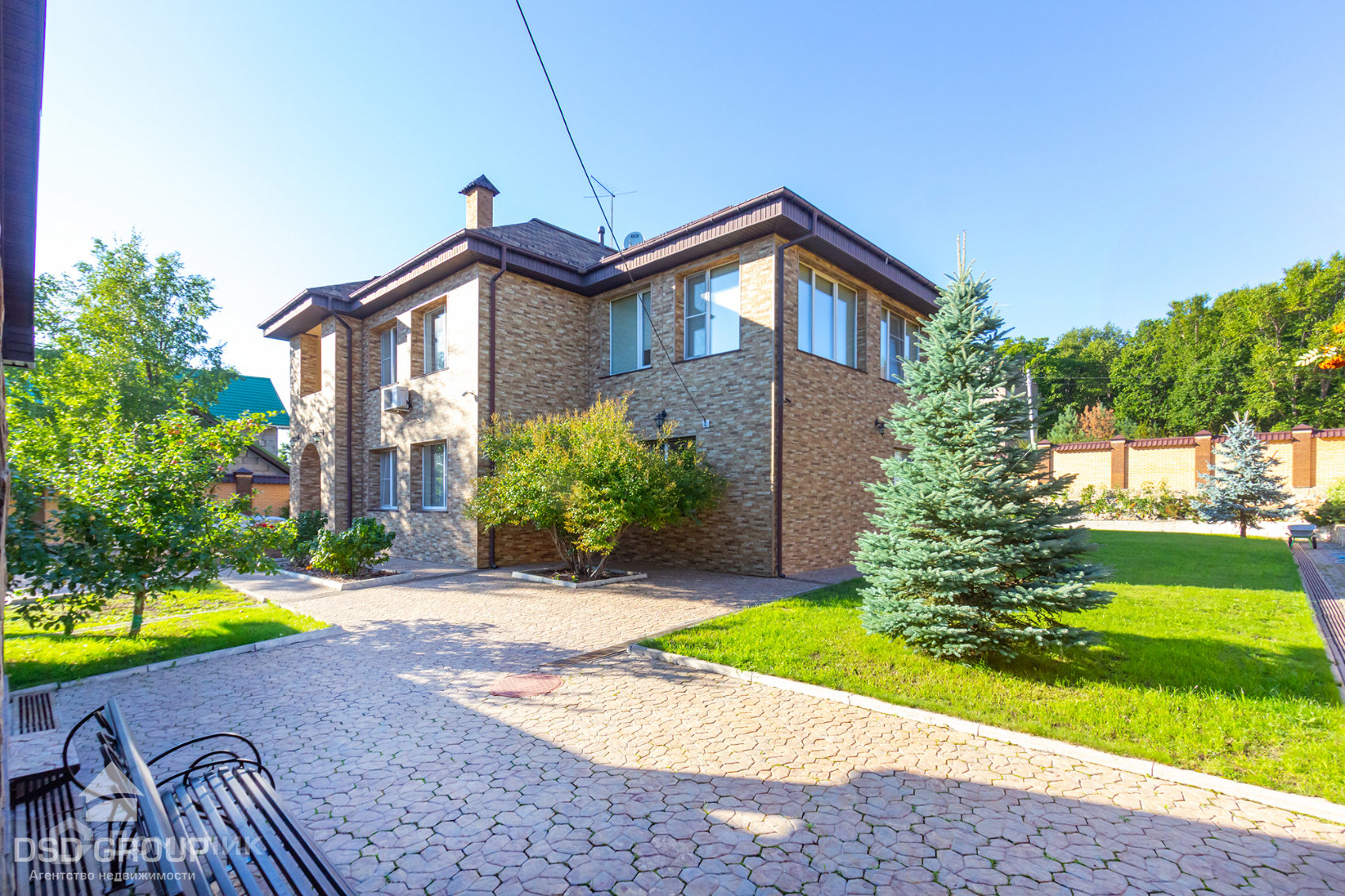 Территория дома огорожена забором из высококлассного облицовочного кирпича, установлена сигнализация и видеонаблюдение, ворота на электроприводе, по периметру освещение.