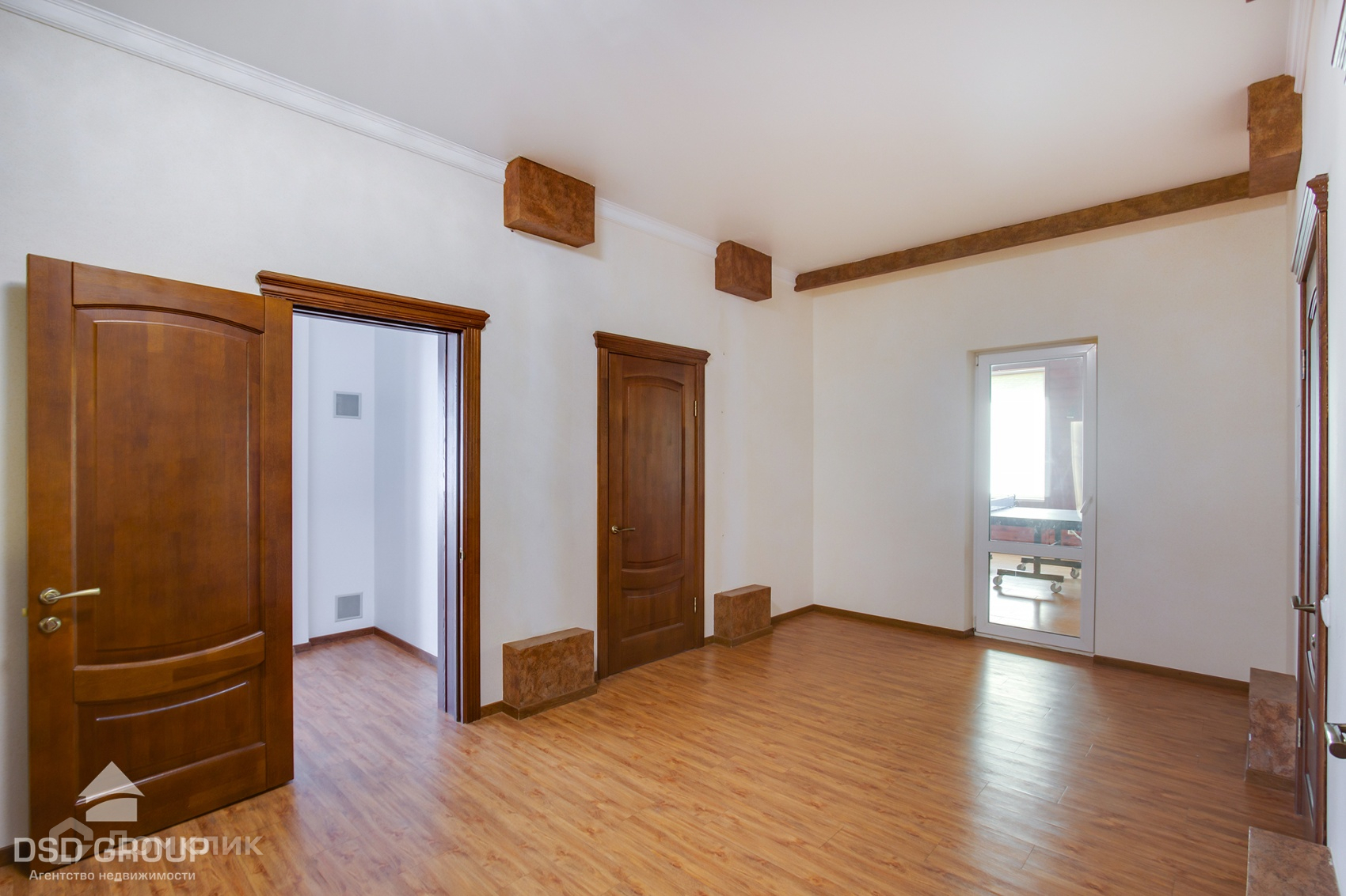 Во всех помещениях натяжные потолки, отопление  при помощи тёплого пола, двери и лестница из массива, одна из стен украшена фреской, освещаемой по периметру, что особенно красиво выглядит  в вечернее время суток.