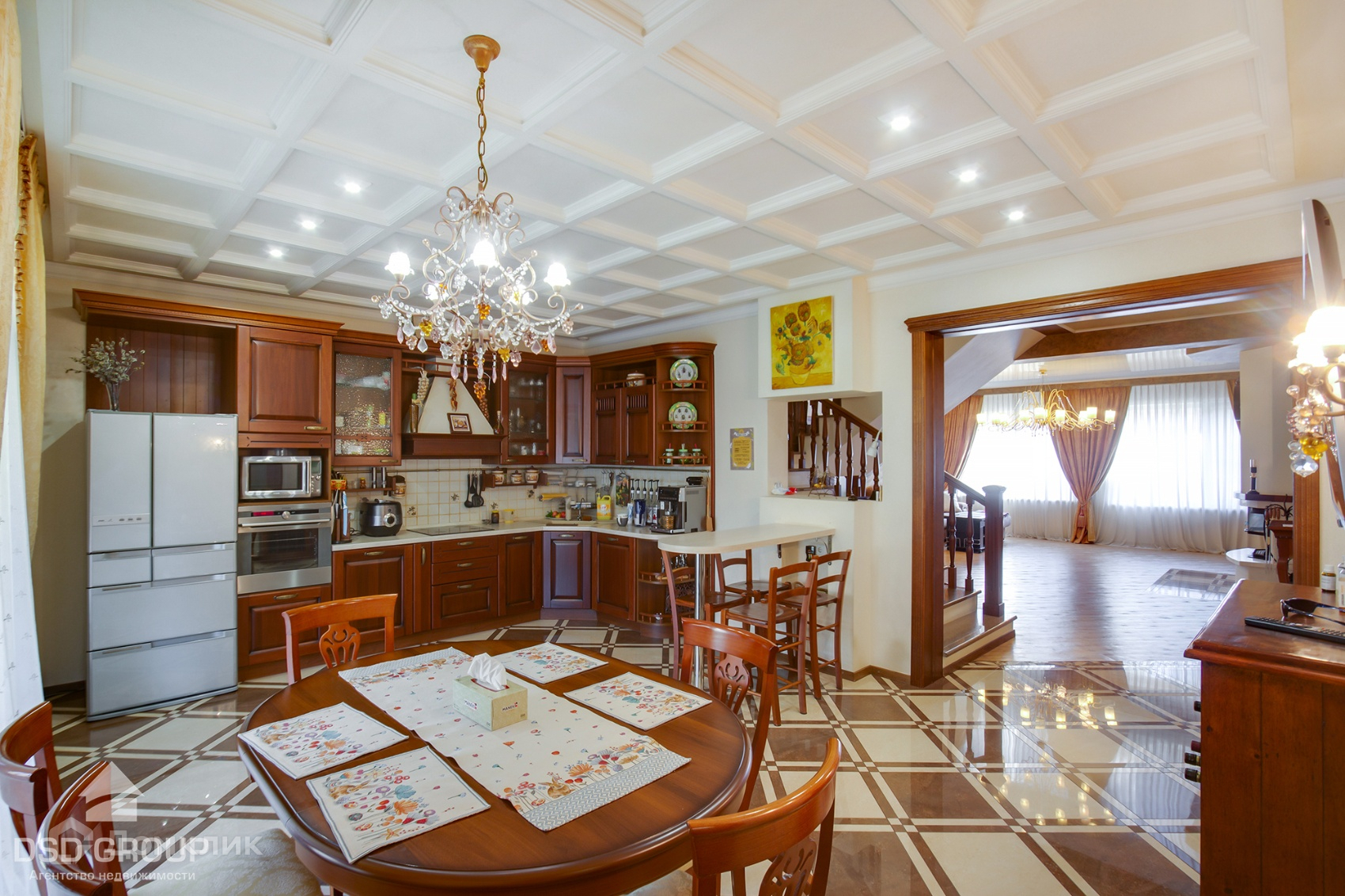 - просторная полностью оборудованная техникой кухня-столовая с винным шкафом и выходом на задний двор.
