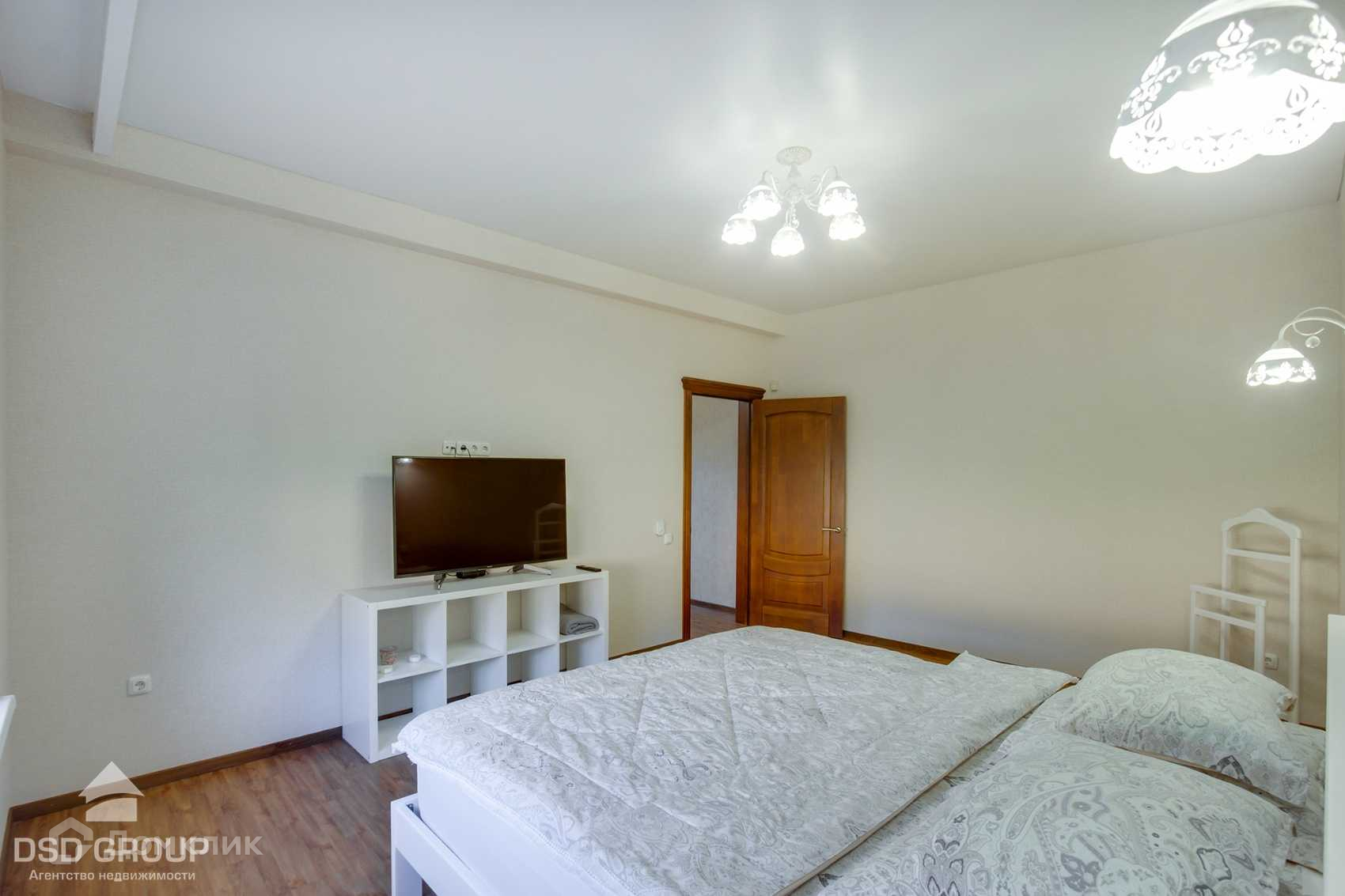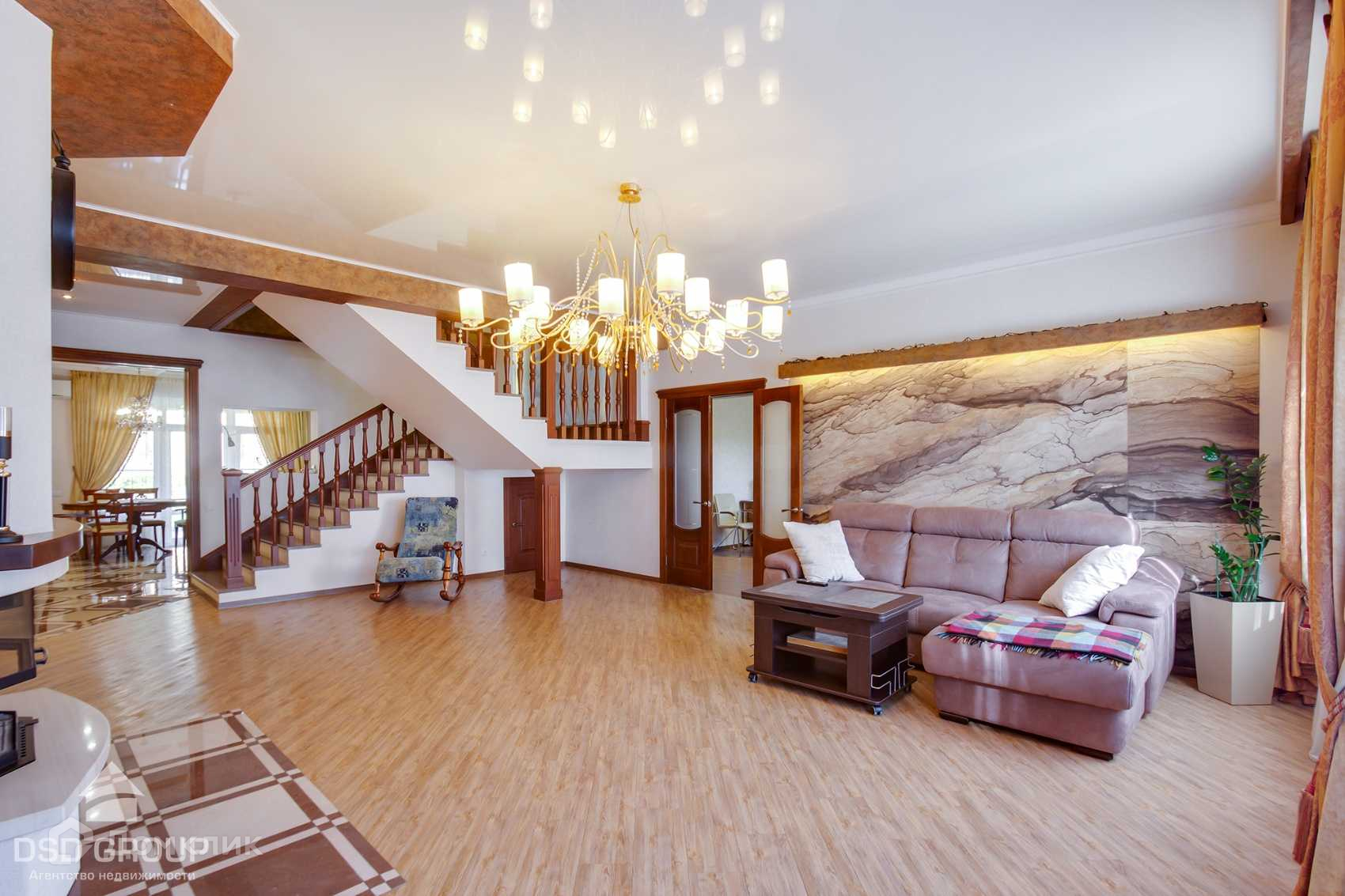 Во всех помещениях натяжные потолки, отопление при помощи тёплого пола, двери и лестница из массива, одна из стен украшена фреской, освещаемой по периметру, что особенно красиво выглядит в вечернее время суток.