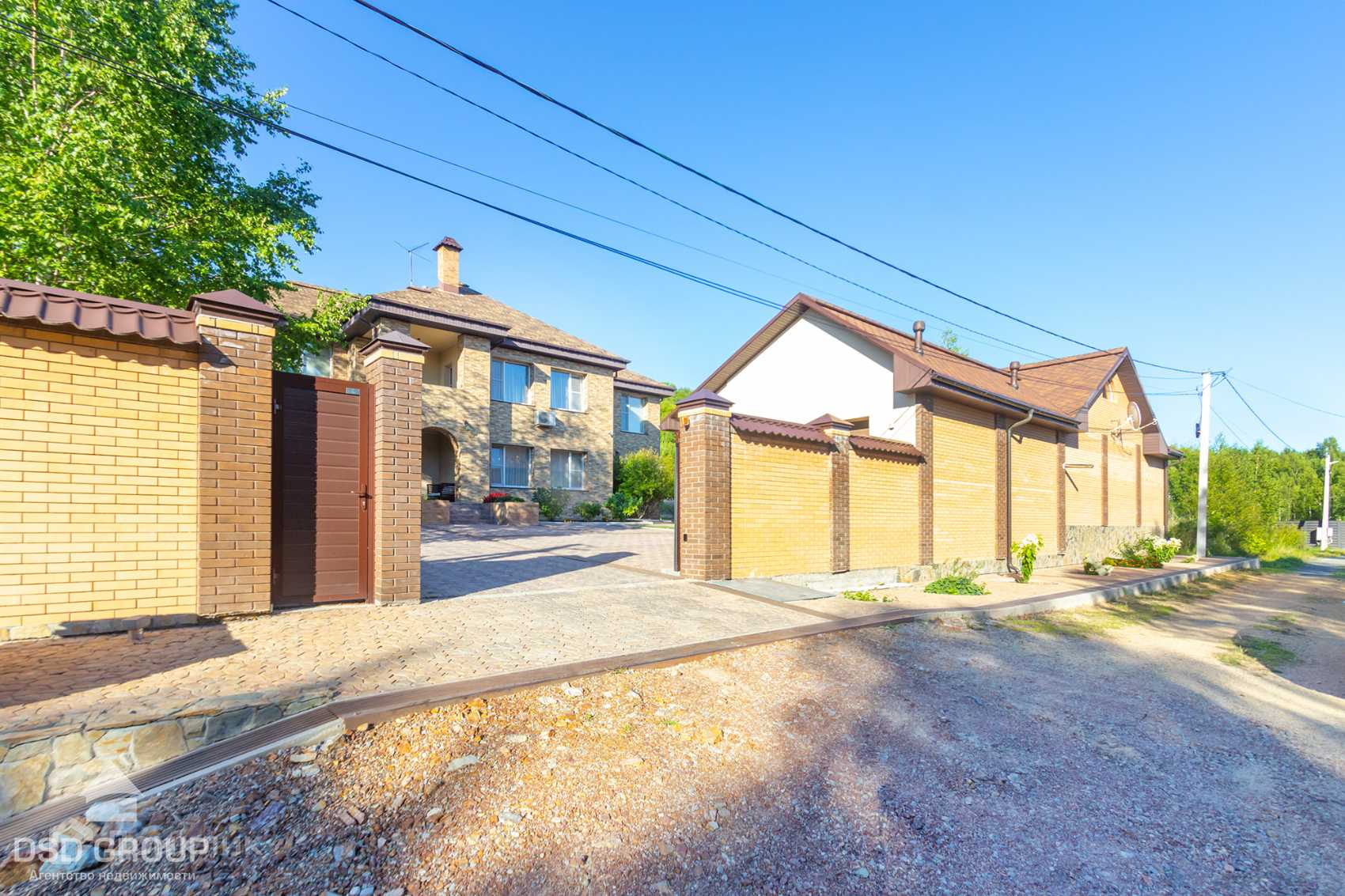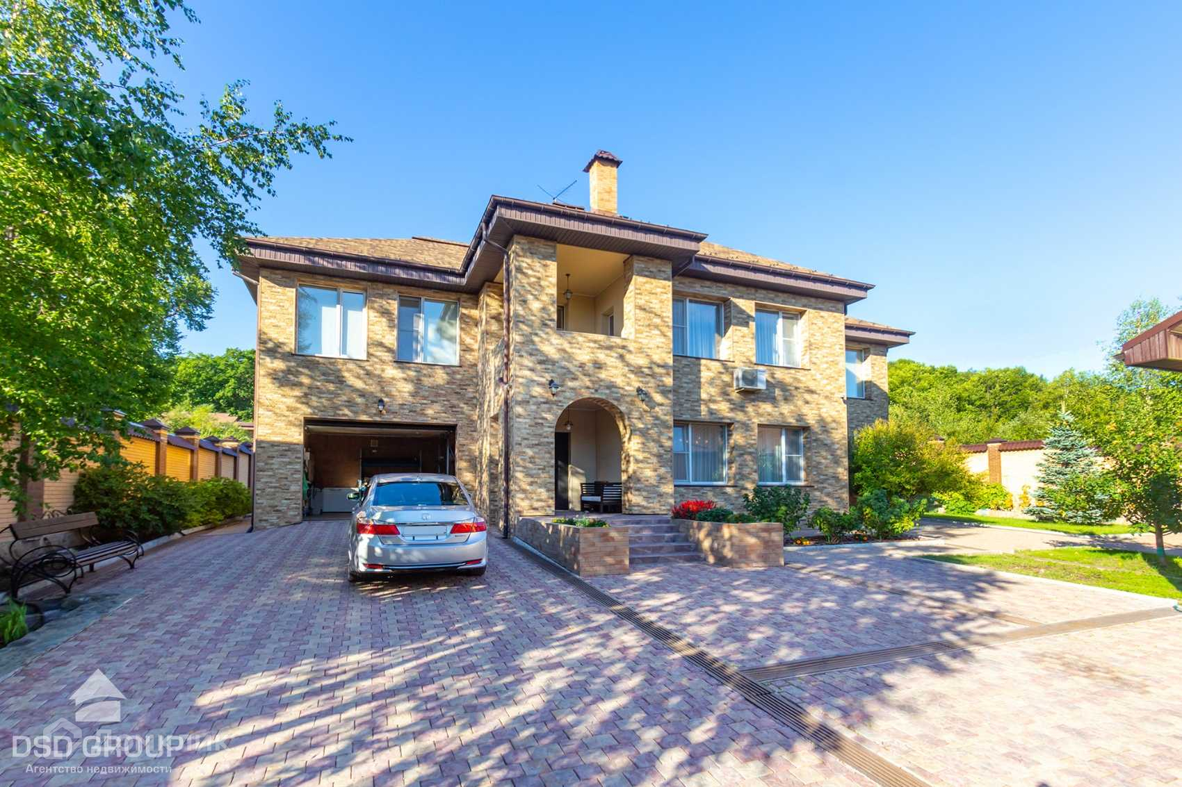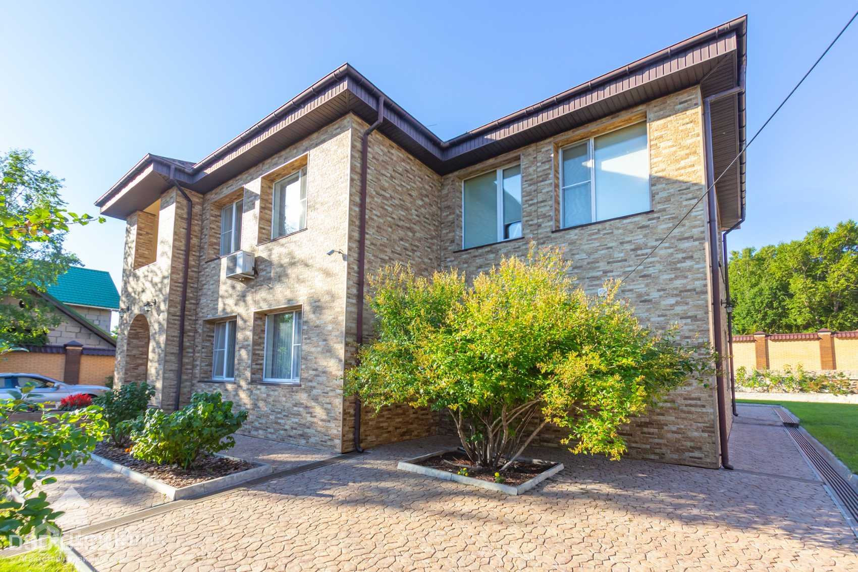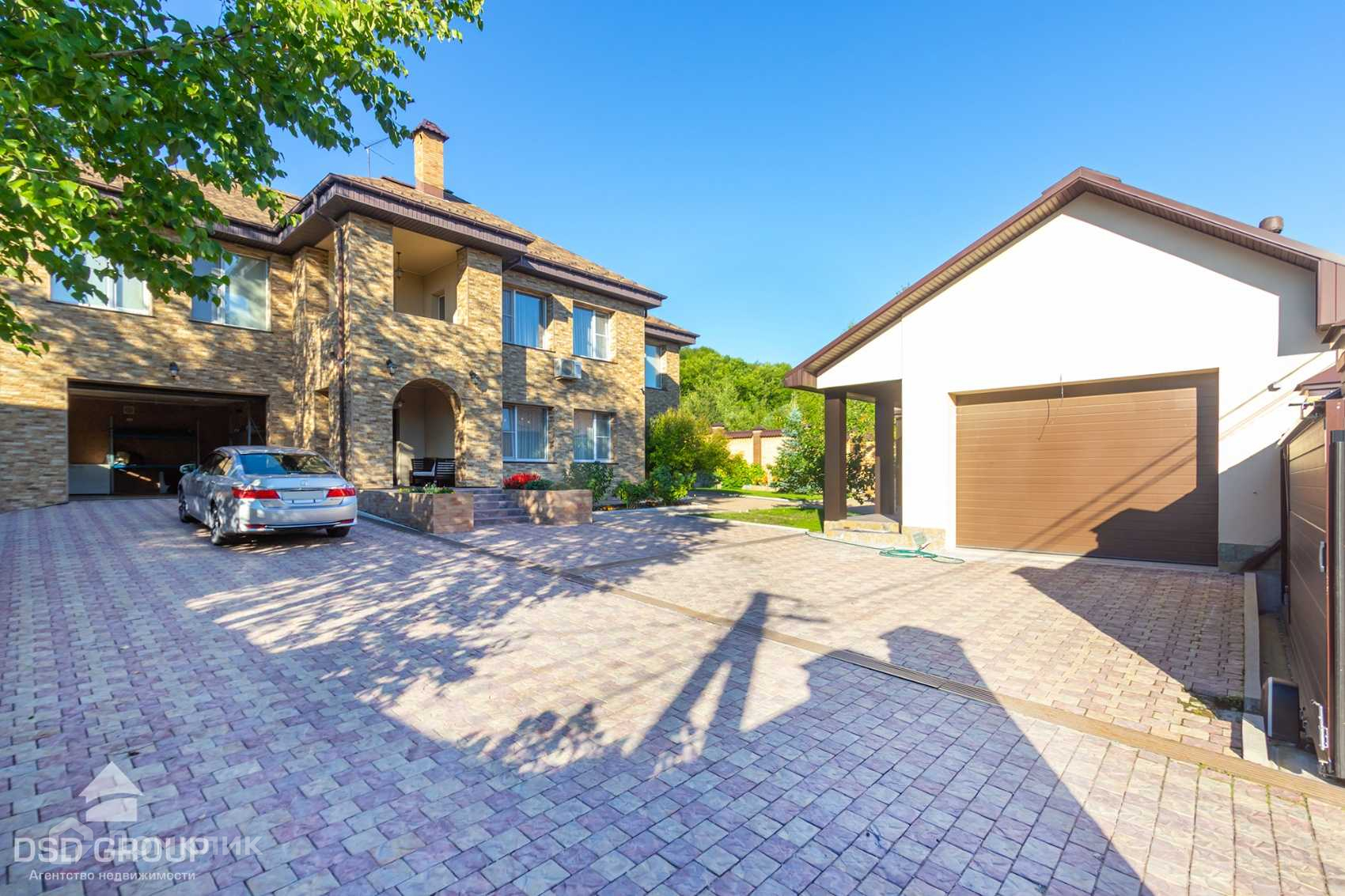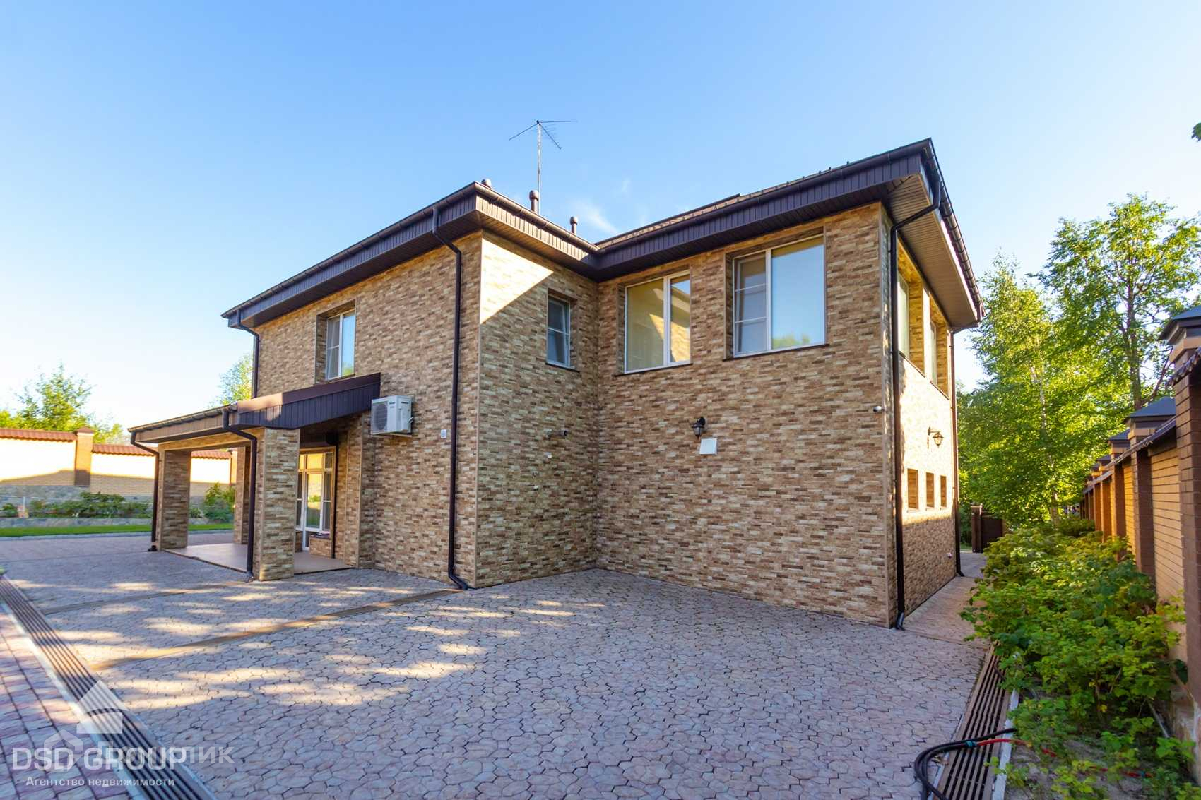Территория дома огорожена забором из высококлассного облицовочного кирпича, установлена сигнализация и видеонаблюдение, ворота на электроприводе, по периметру освещение.