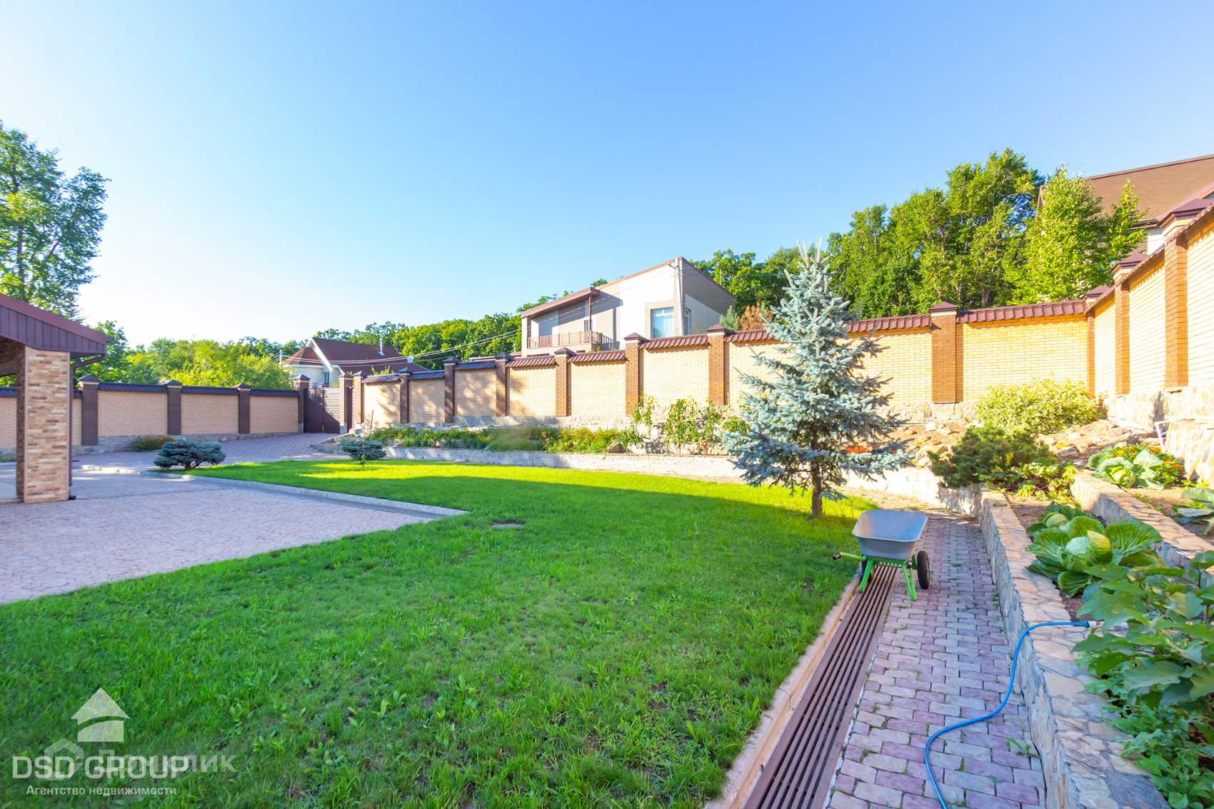 Имеется летний водопровод с подводом воды на каждую грядку отдельно. На свободном участке выложена брусчатка, высажен газон и установлены лавочки.