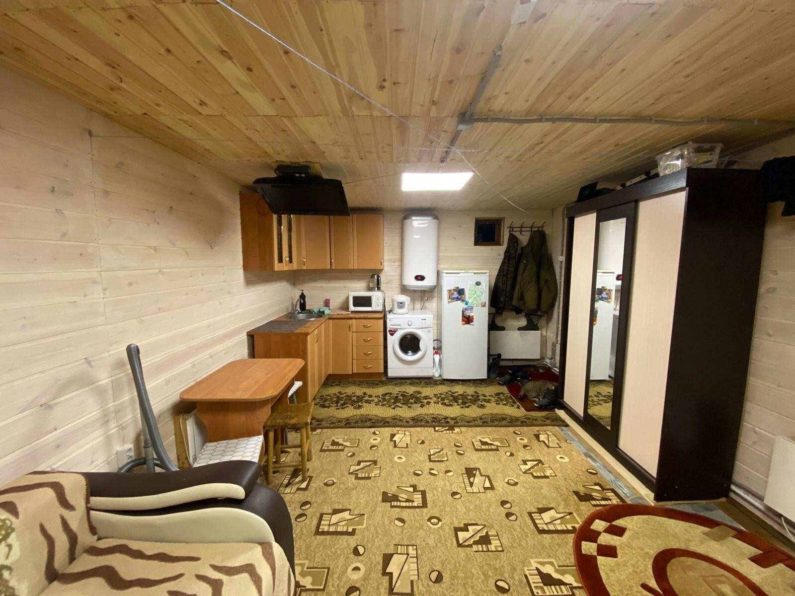 Собственник. Изначально планировалась баня, можно сделать и под баню. На данный момент используется как жилье. Имеется кухонный гарнитур, душевая кабина, бойлер на 80л, шкаф, диван, плита, стиральная машина, холодильник, микроволновая печь, обеденный стол и стулья! Участок огорожен двухметровым забором, установлено видеонаблюдение, Wi-Fi. Участок 10 соток. Имеется так же беседка, в беседке напольная плитка система тёплый пол мангальный комплекс (по проекту не закончена), качеля, туалет.