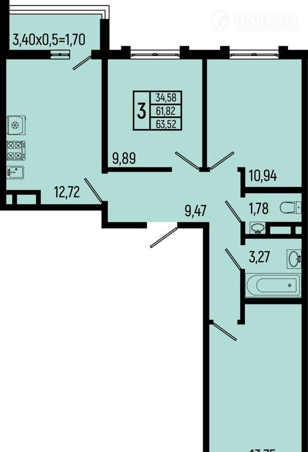 Общая площадь 63.5 м2