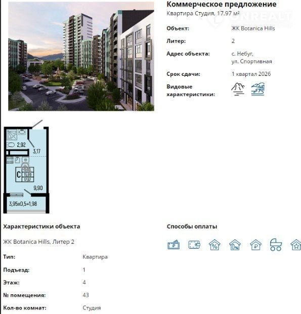 Квартира студия, 18 м2, этаж 4 / 18, на продажу в селе Небуг
