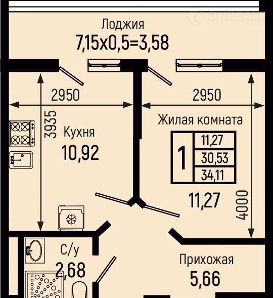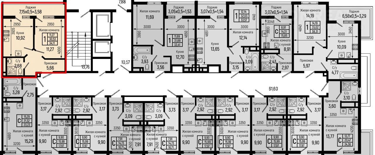 Общая площадь 34.1 м2