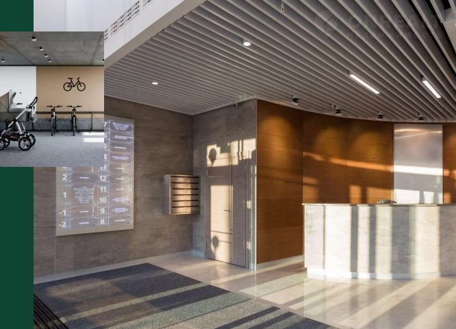 На первых этажах предусмотрены комнаты для хранения колясок и места для парковки электросамокатов и велосипедов.