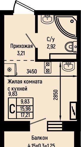 Общая площадь 17.2 м2