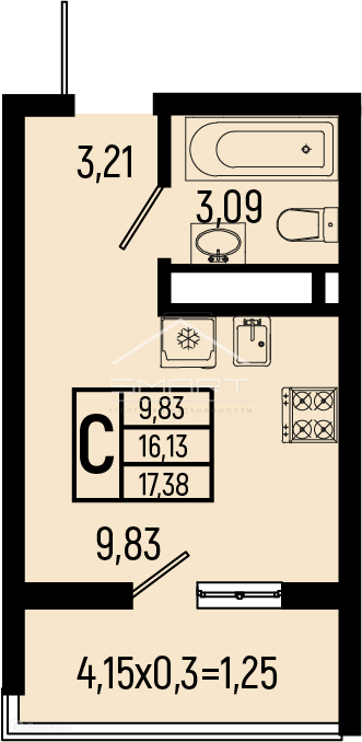 Общая площадь 17.38 м2