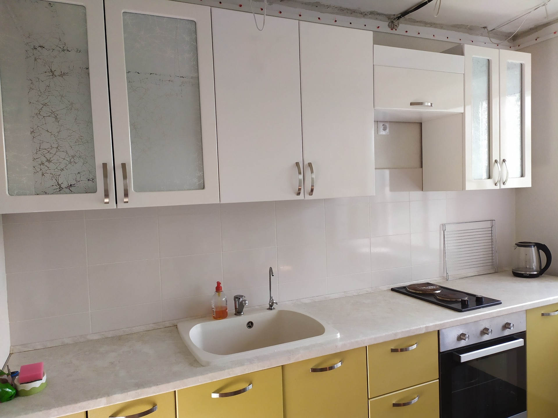 -Утановлен  кухонный гарнитур с встроенной вместительной мойкой, варочной панелью и духовым шкафом.