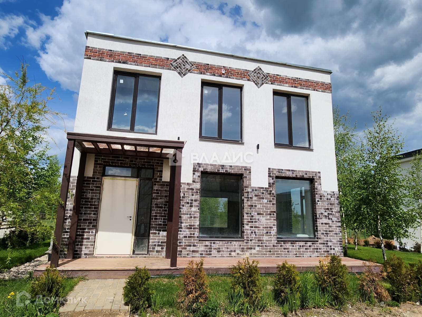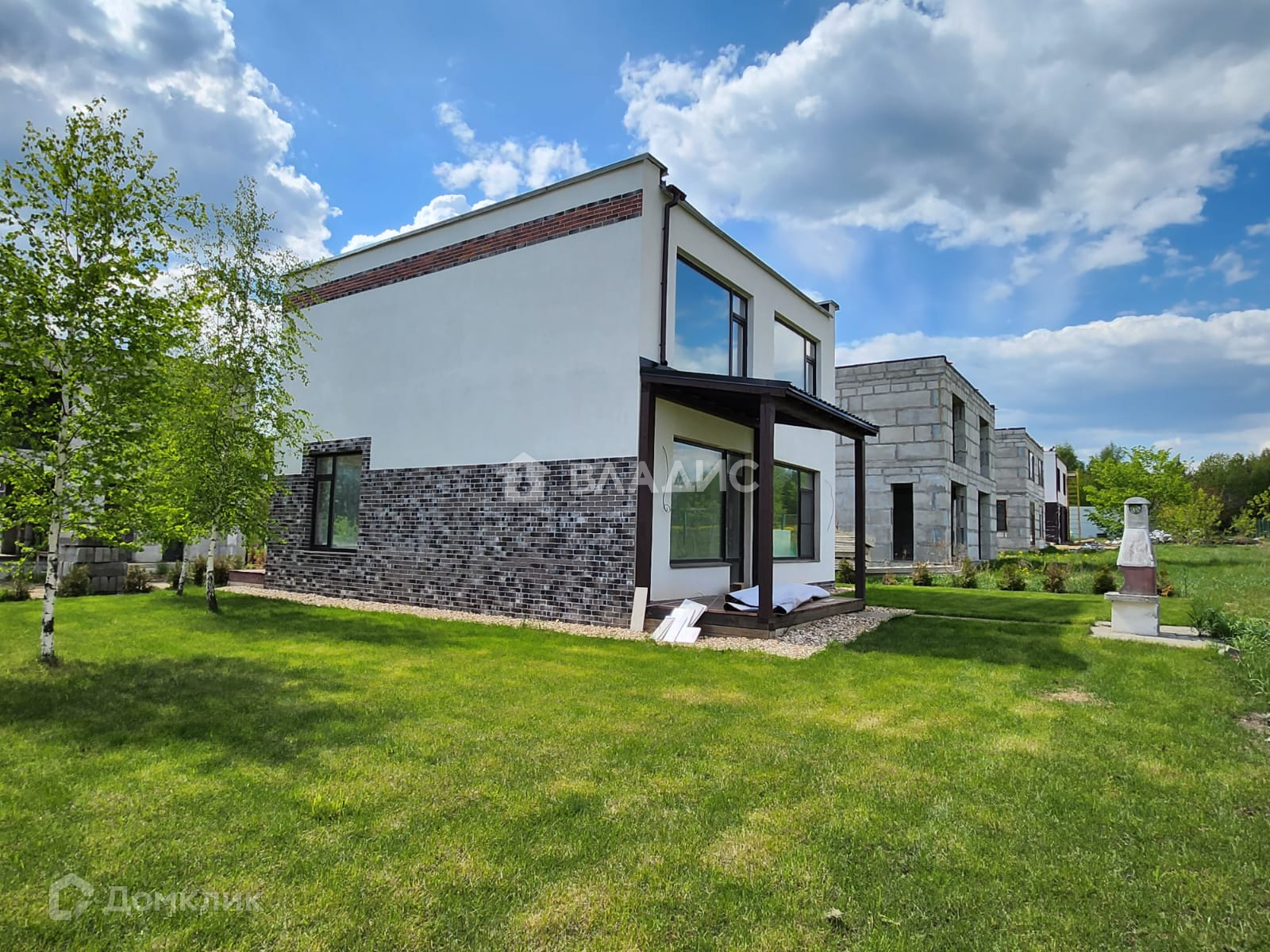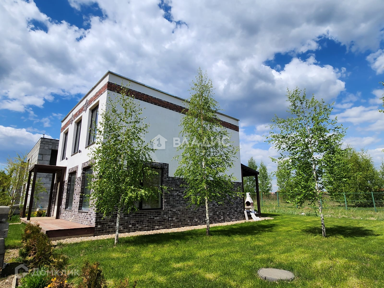 Участок ровный, зеленый и благоустроенный. Есть парковка на 2 автомобиля, рулонный газон, по периметру участка туи, ивы, березки.