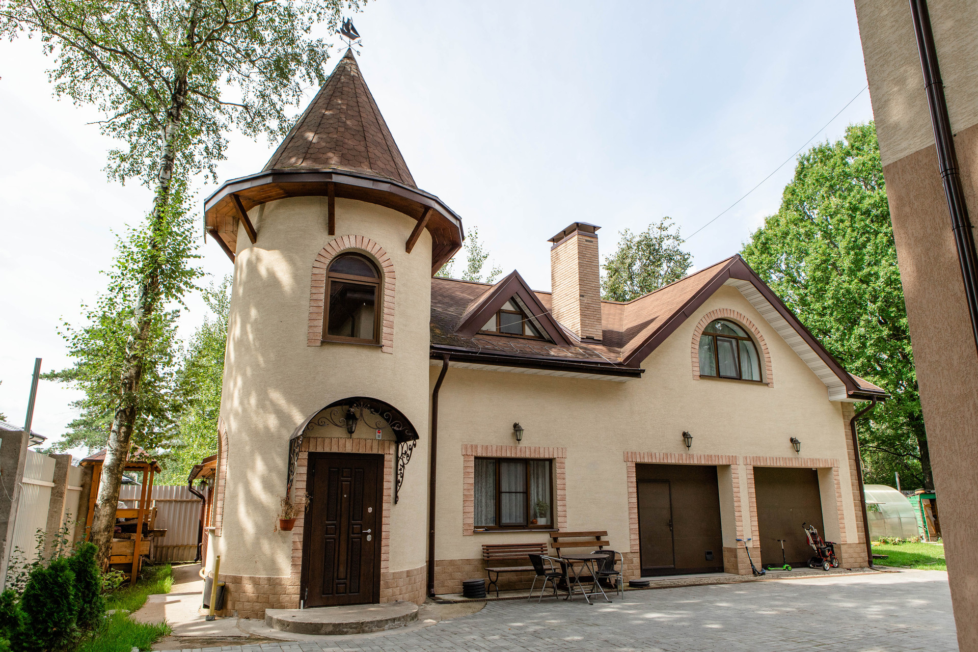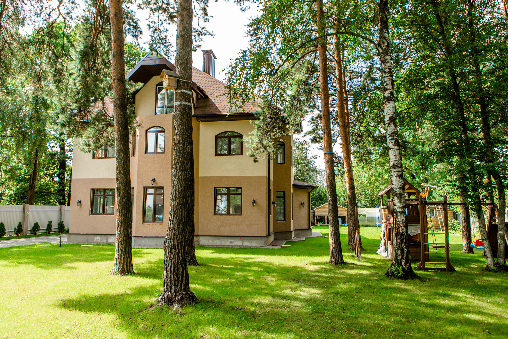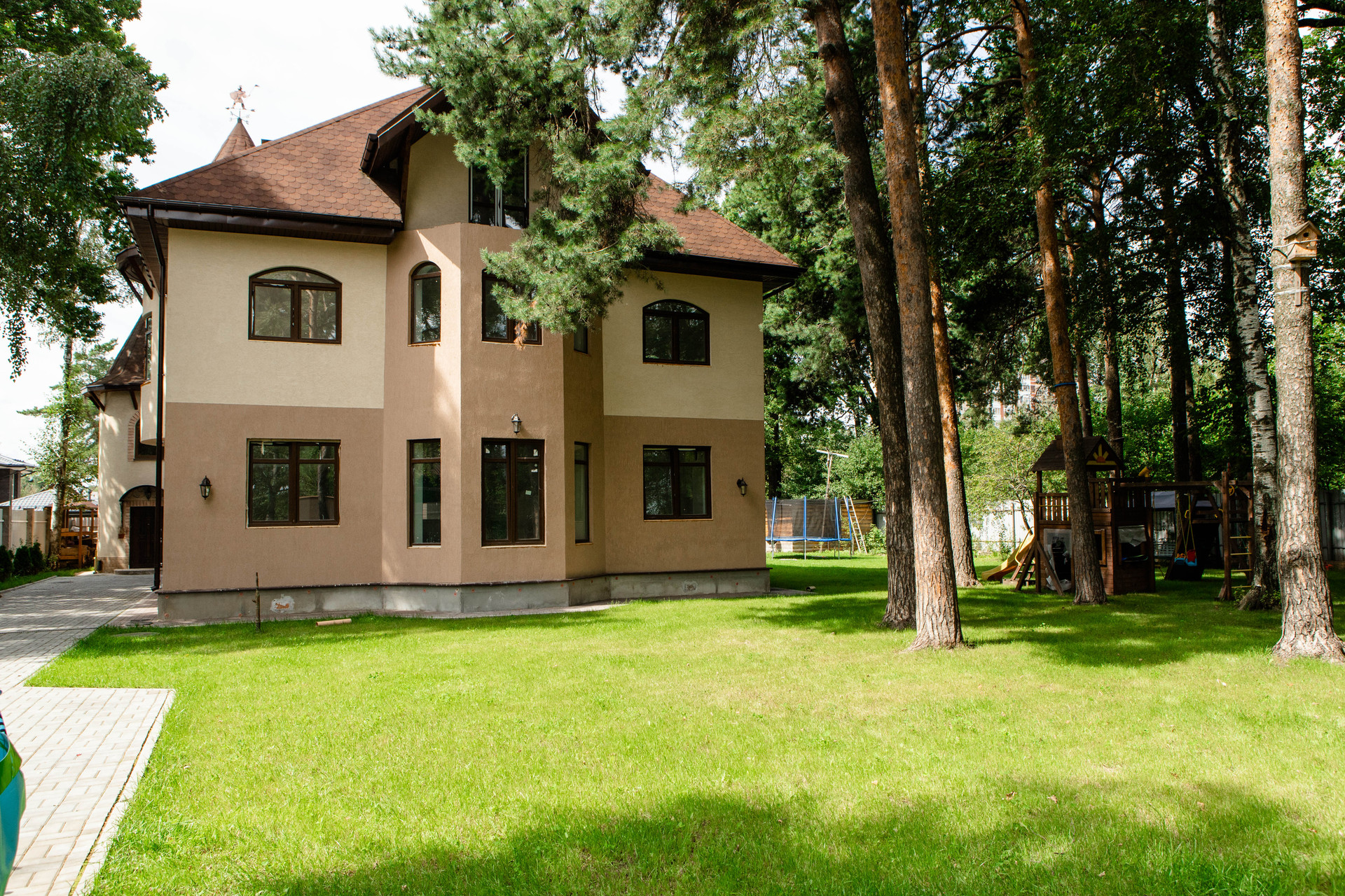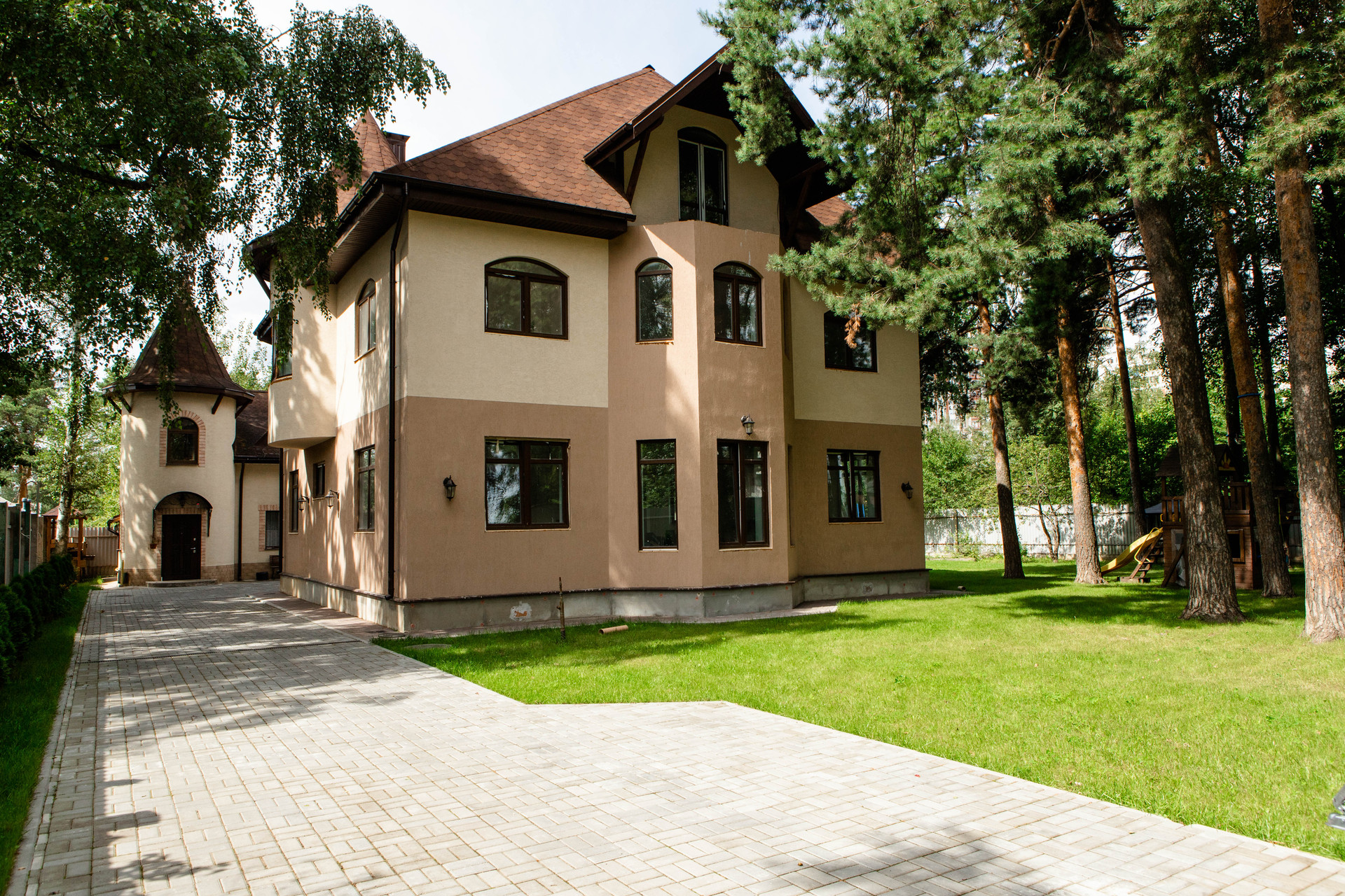 Комплекс состоит из двух строений и  ухоженного участка : сочетание газона ,сосен (соснам более 100 лет ) и дубов , выполнен дренаж, завезена земля.  Участок широкий прямоугольник. Подьезд вымощен декоративной плиткой. Оборудована детская площадка. На участке более 10 сосен и дубов.