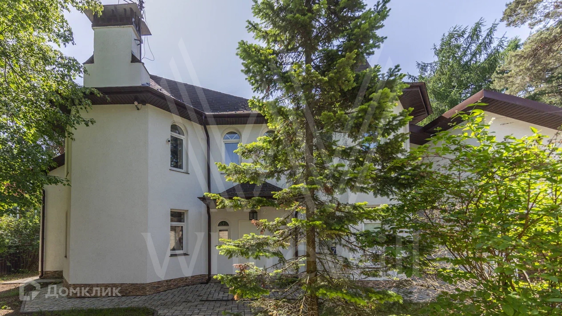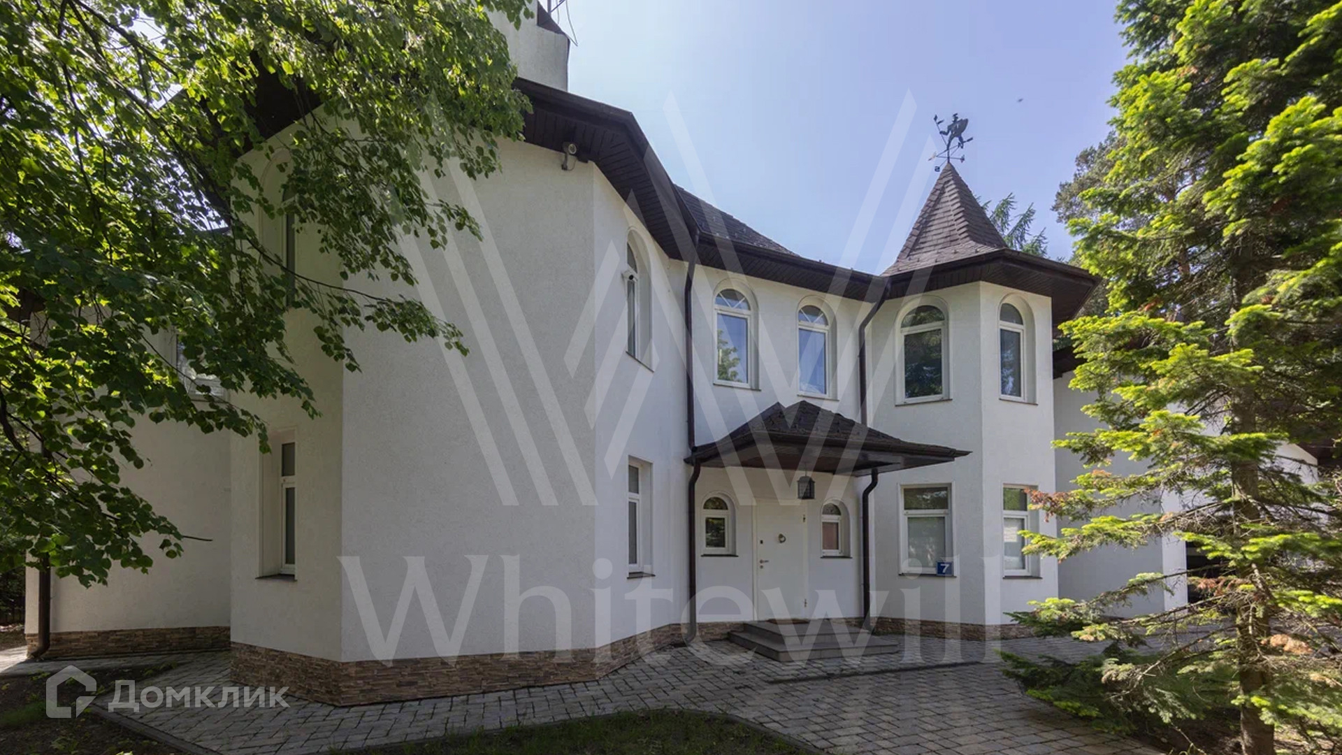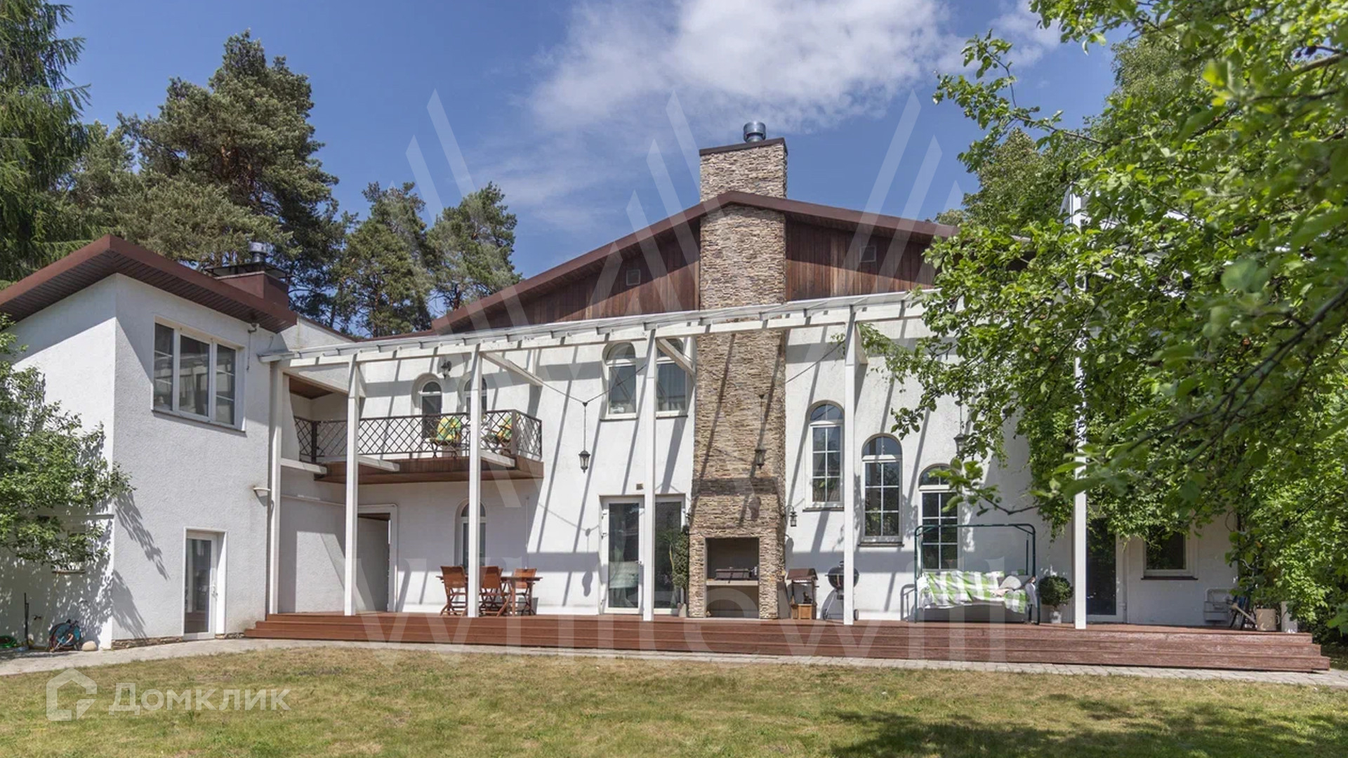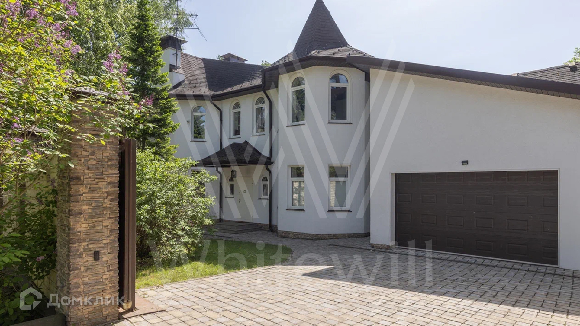 ID 12 478. Немчиновка. Загородный дом площадью 373 м² расположен на тупиковой улице, на полевом участке 12,8 соток. Здание в европейском стиле с белым фасадом и деревянными элементами утопает в зелени. Внутри выполнена дизайнерская отделка — гостиная с камином, двухсветный обеденный зал с потолком 7 метров и кухня выдержаны в стиле лофт, спальни на втором этаже стремятся к скандинавскому минимализму. Баня разместилась внутри дома.