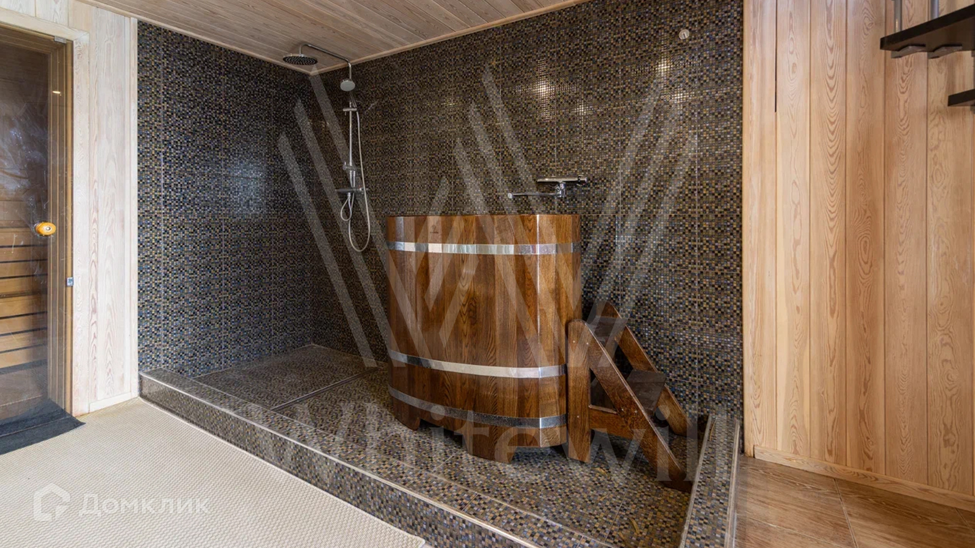 На участке с двумя въездами выполнены ландшафтные работы, дорожки выложили брусчаткой, предусмотрена парковка до 5 машин и крытый гараж. В итальянском дворике предусмотрели вывод под фонтан и отвели место для установки винтовой лестницы на второй этаж. Летом и зимой можно отдыхать на большой террасе дома со стеклянным навесом и мангалом.