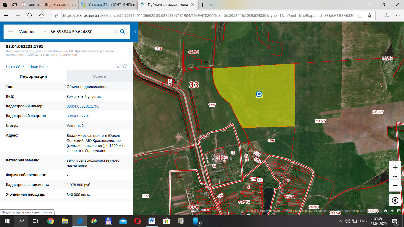 Земельный участок 34 га, КН 33:04:062201:1795, категория земель: Земли сельскохозяйственного назначения, расположен в 70 метрах от границы с. Сорогужино Юрьев-Польского района Владимиркой области. Западная граница участка проходит по р. Реда. Подъезд до участка бетонная дорога, на участке есть небольшой пруд. Участок ежегодно обрабатывается (посев зерновых и покос травы). Село газифицировано. Расстояние до г. Юрьев-Польский 9 км по трассе Р-74 на Переславль-Залеский. Отличный вариант для создания КФХ, усадьбы.