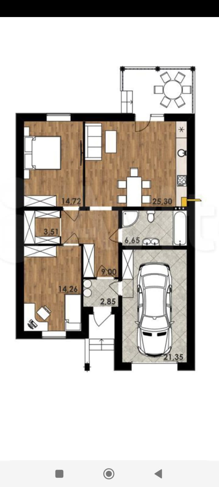 -Планировка дома очень удобна и спланированная, включает в себя : кухню-гостинную, 2 спальни, санузел, и выходом из дома в гараж,.