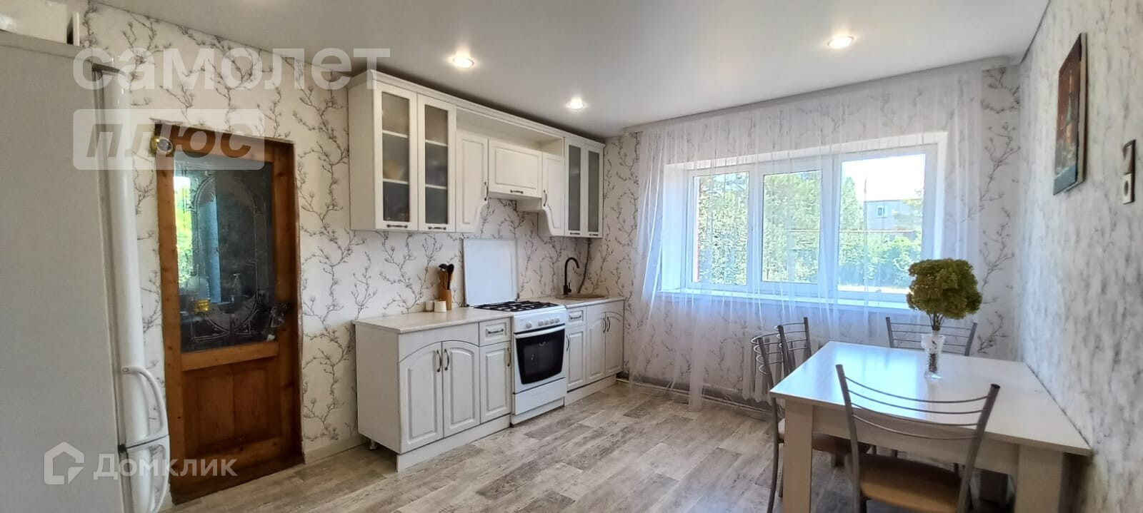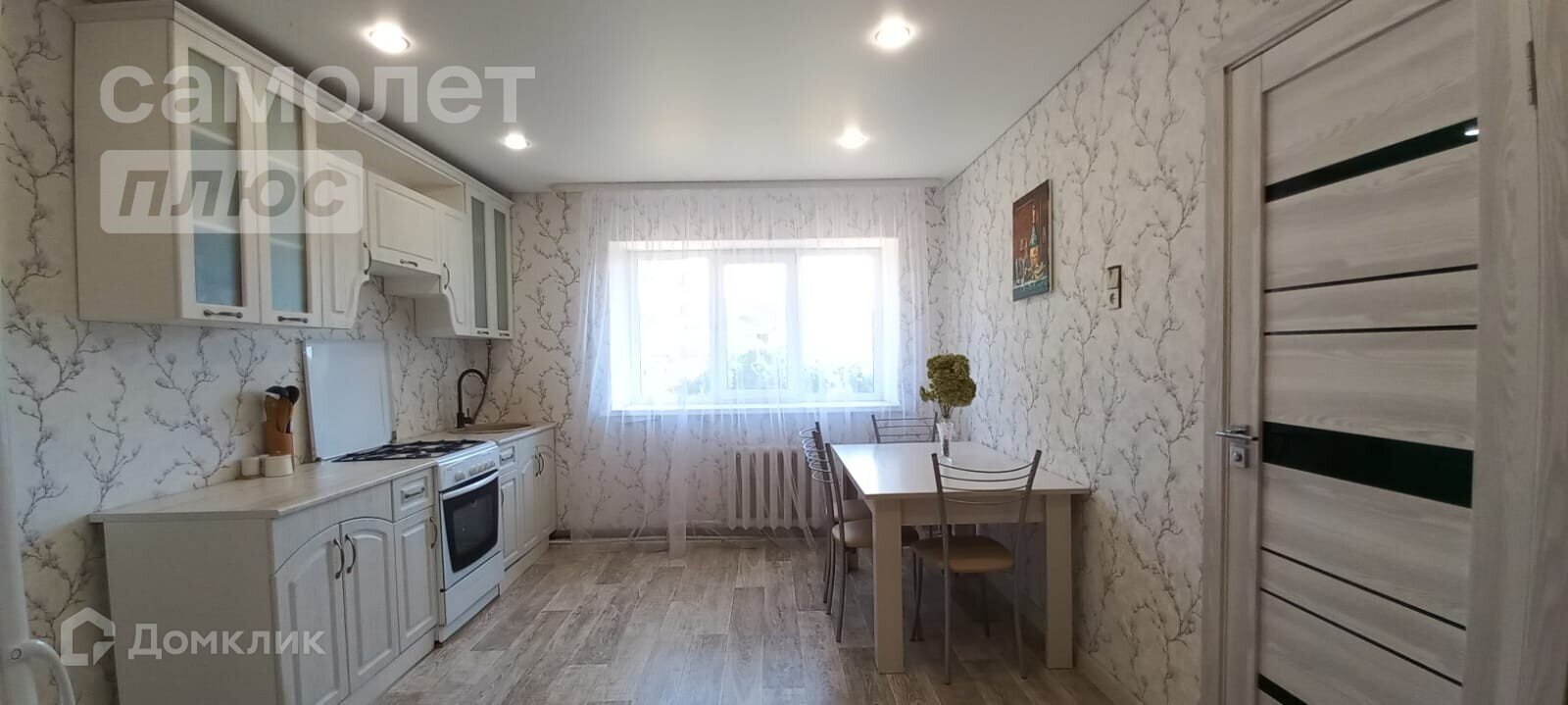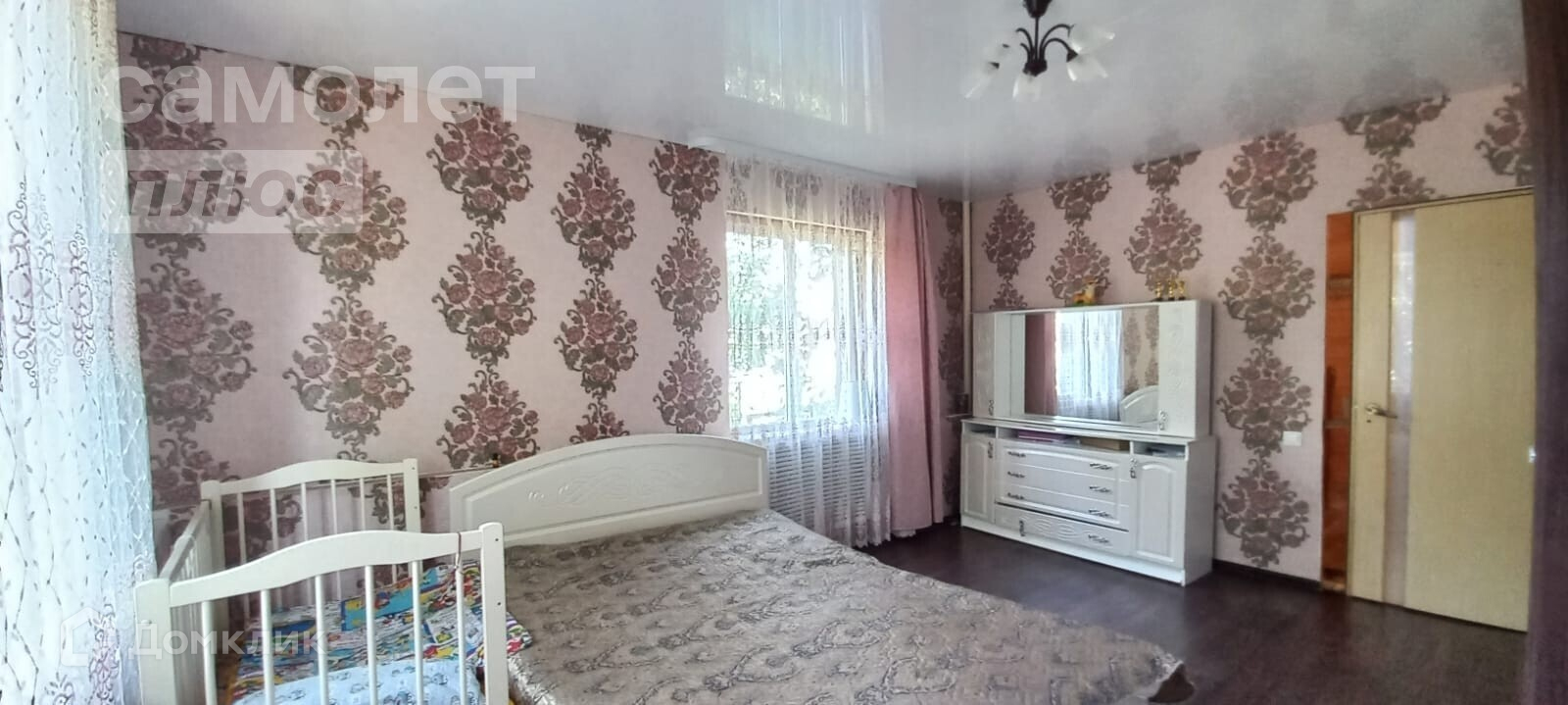- потолок в спальне и на кухне натяжной, в остальных комнатах под дерево,