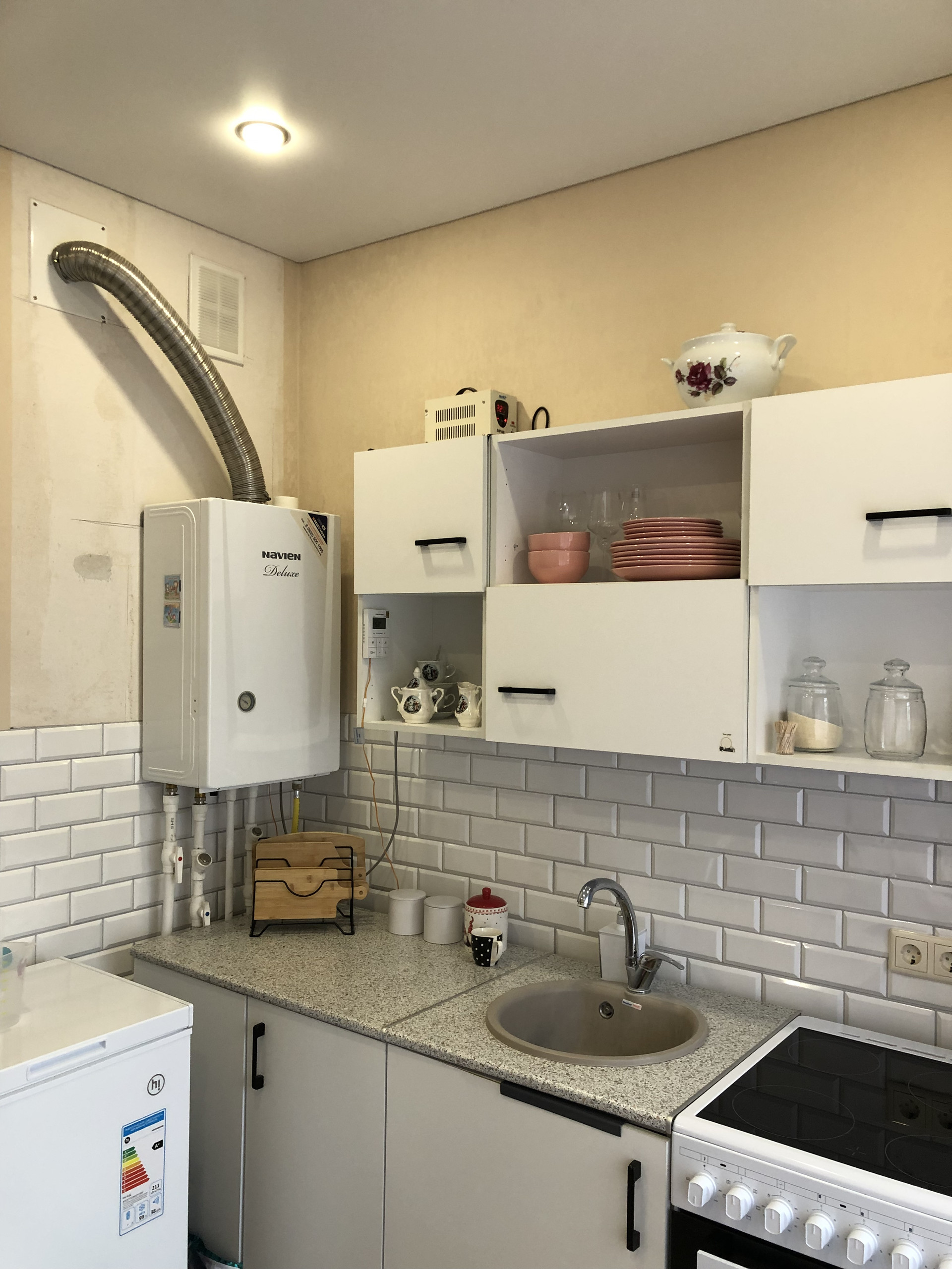 Просторная кухня - 10,5 м² с кухонным гарнитуром, холодильником и стиральной машиной.