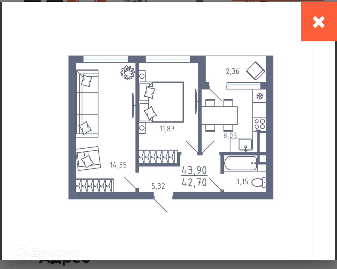 Общая площадь 44 м2