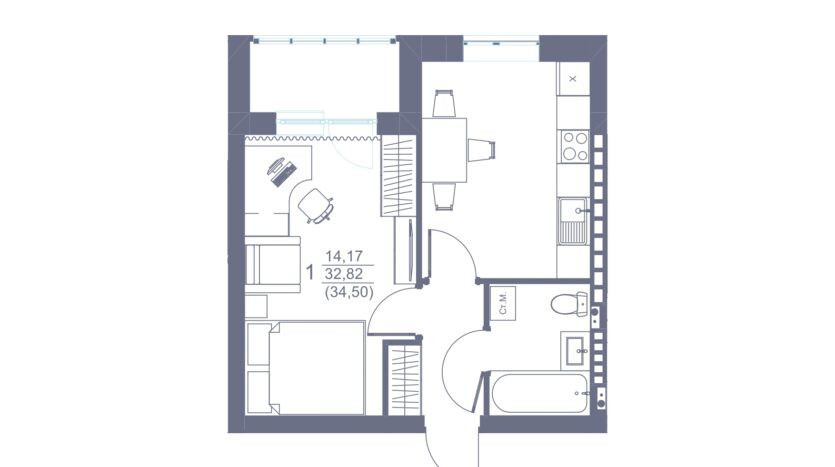 Общая площадь 34.5 м2