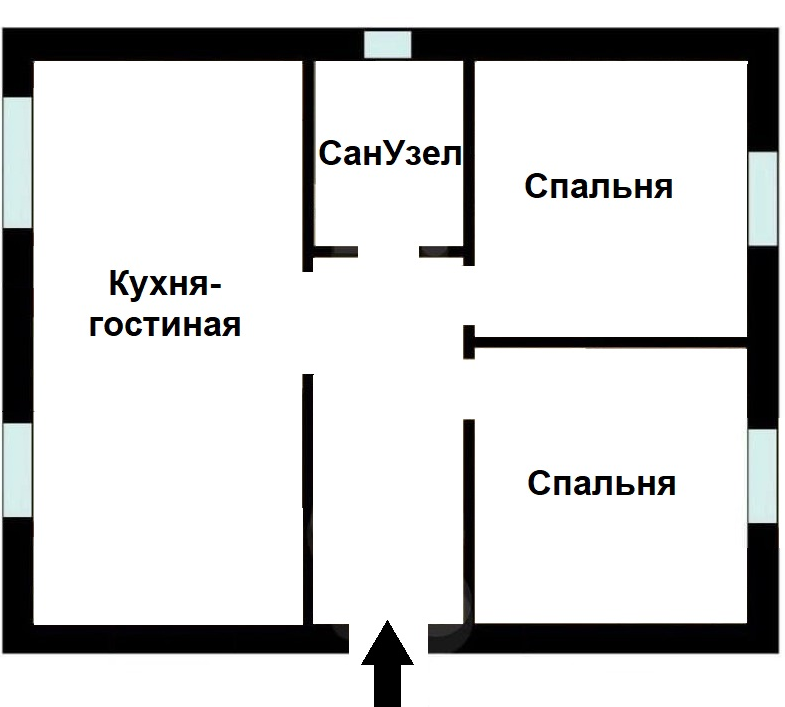 Планировка- 2 спальни, кухня - гостиная с панорамным окном и выходом на участок, сан.узел. Эргономичная планировка, без лишних площадей, каждый метр полезно задействован.