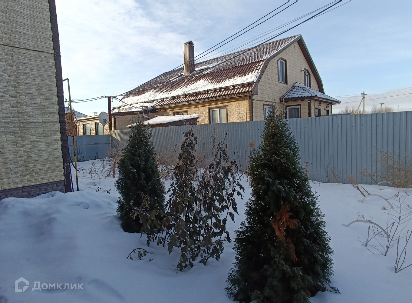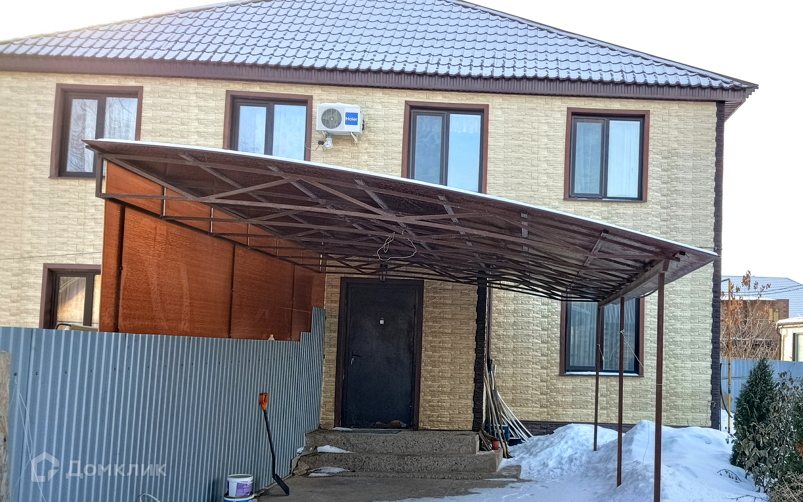 Дом двухэтажный построен из газоблоков + утеплитель + облиуовочная фасадная панель.. Металлическая входная дверь, перед ней практичный, большой навес из поликарбоната, хорошо защищающий от ветра и осадков.