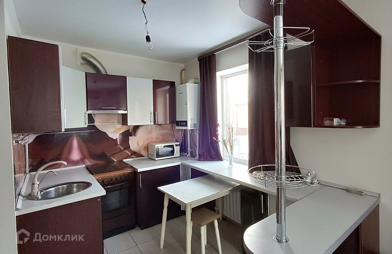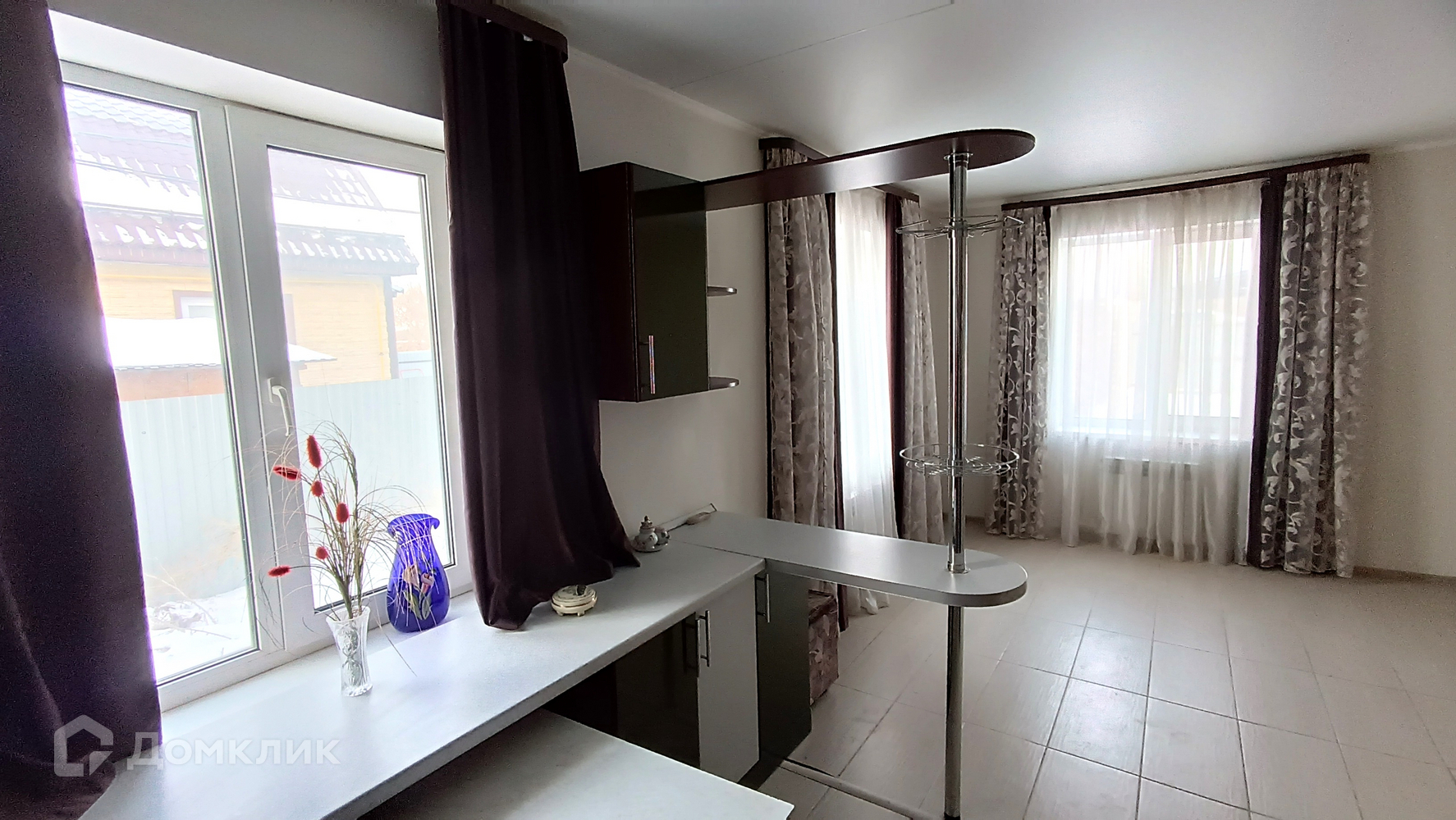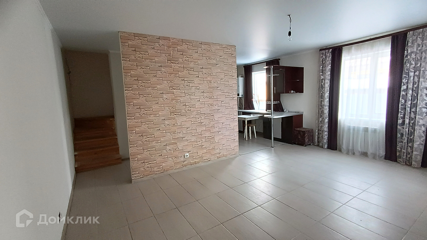 В доме выполнен ремонт, теплые полы, натяжные потолки. Удобная деревянная лестница на второй этаж, где расположены две комнаты и санузел. На первом большая кухня-гостиная, зал частично отделен от кухни перегородкой и барной стойкой кухонного гарнитура, он остается новым владельцам.