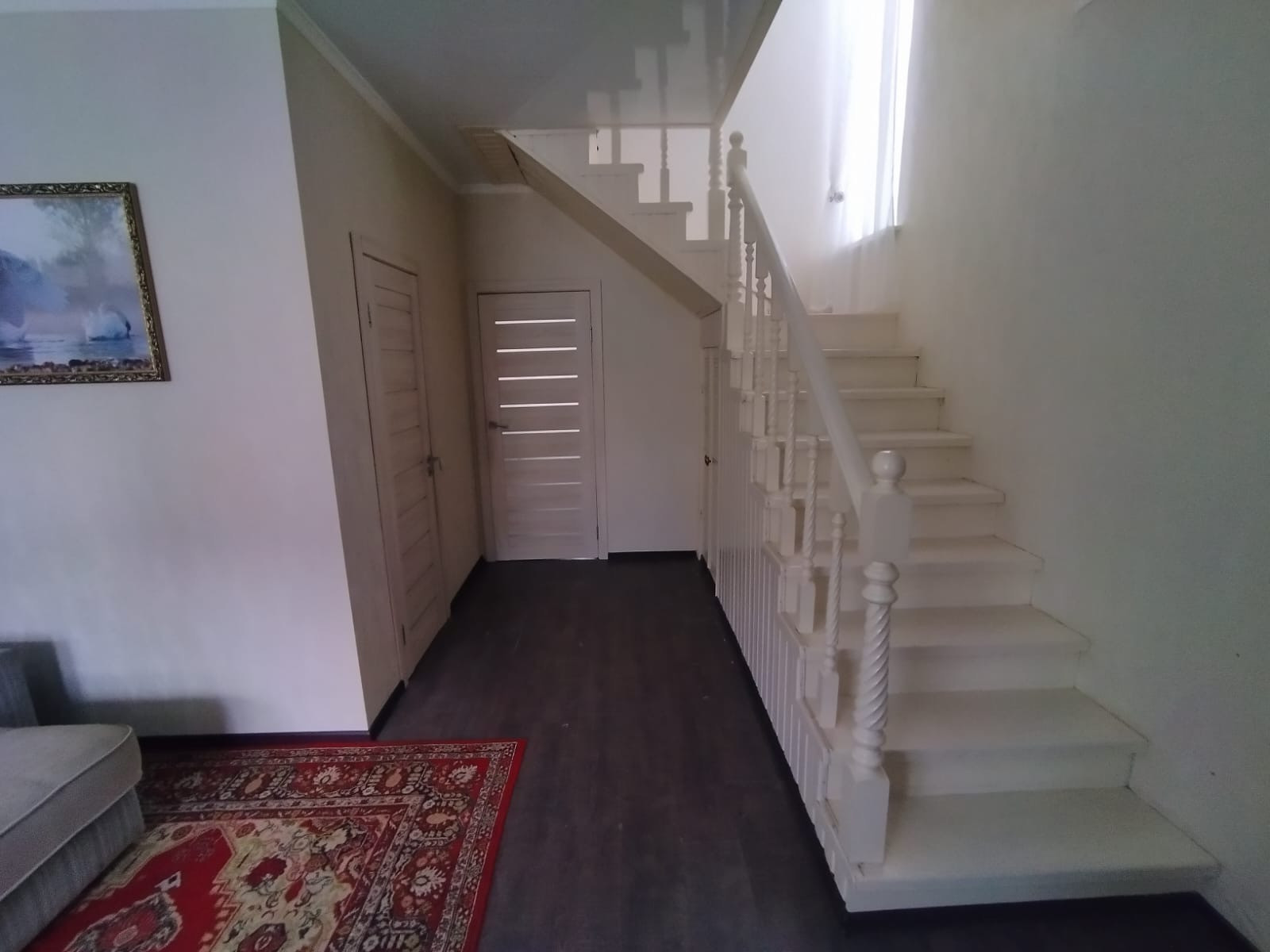 На первом этаже находится гостиная и кухня. Под лестницей расположена вместительная кладовая, в которой находится стиральная машина, что очень удобно.