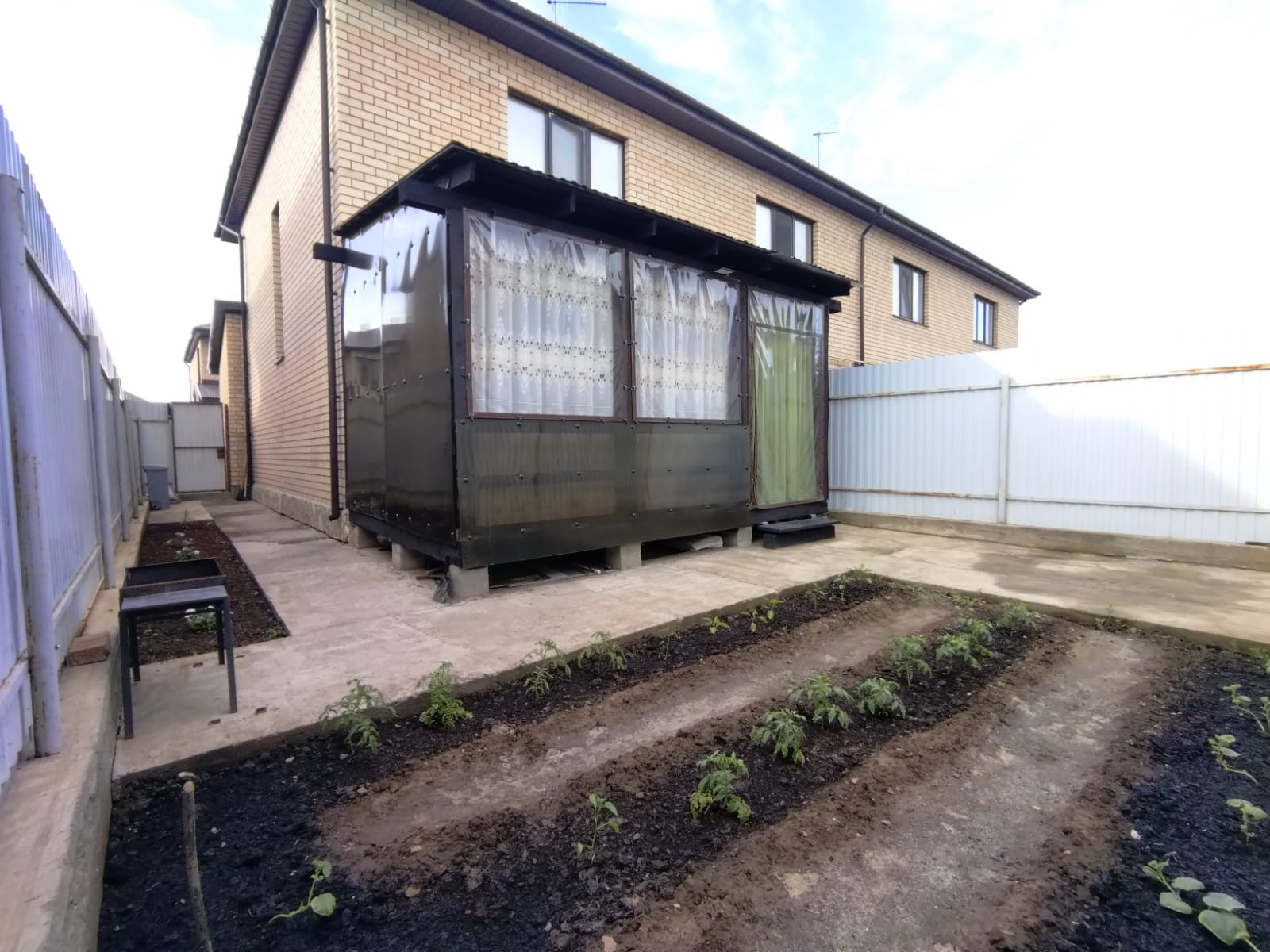 На территории двора зона барбекю. Небольшой зелёный огородик для выращивания овощей.