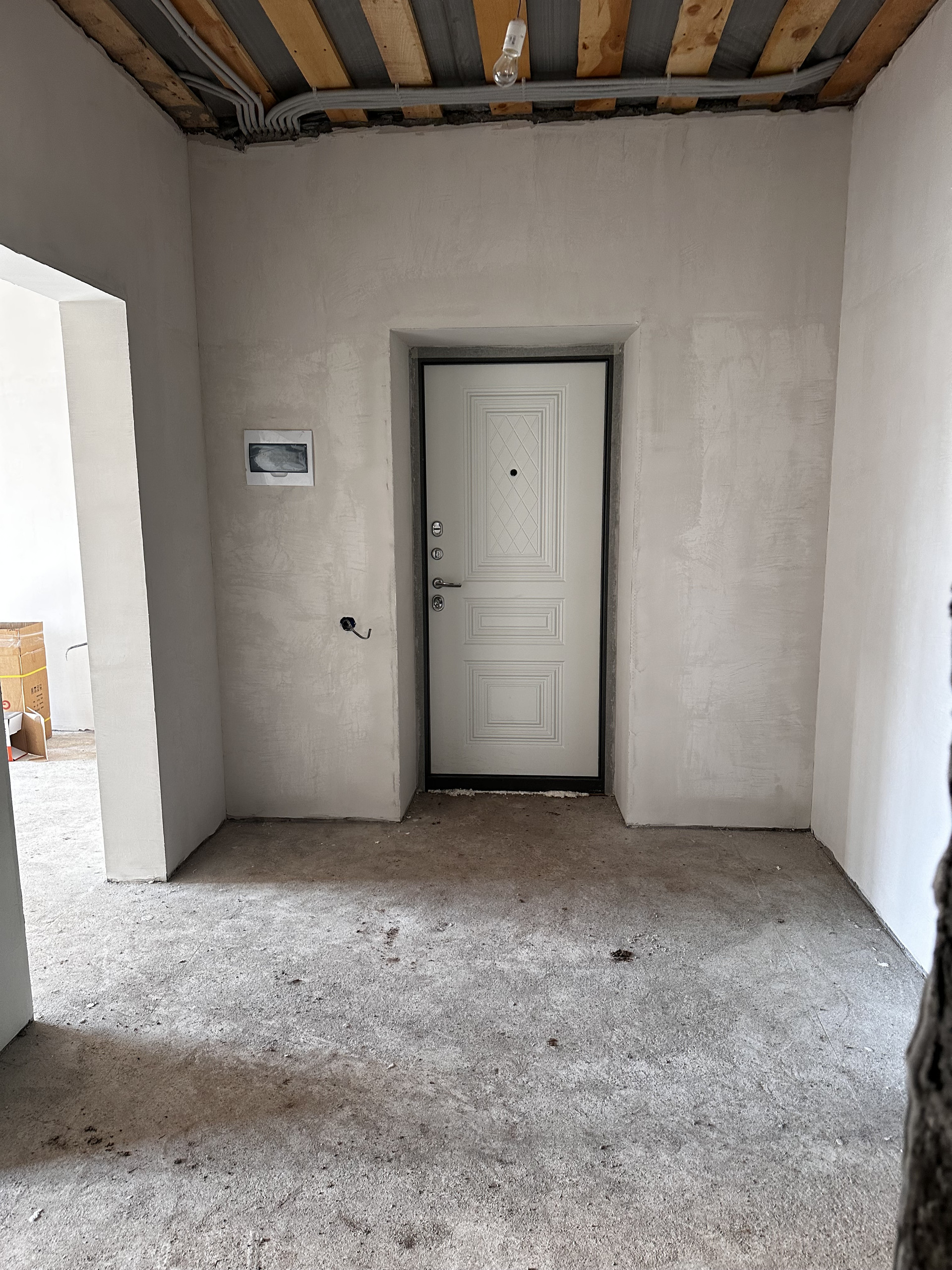Стяжка пола и стен, стены выровнены – останется только наклеить обои и уложить ламинат.