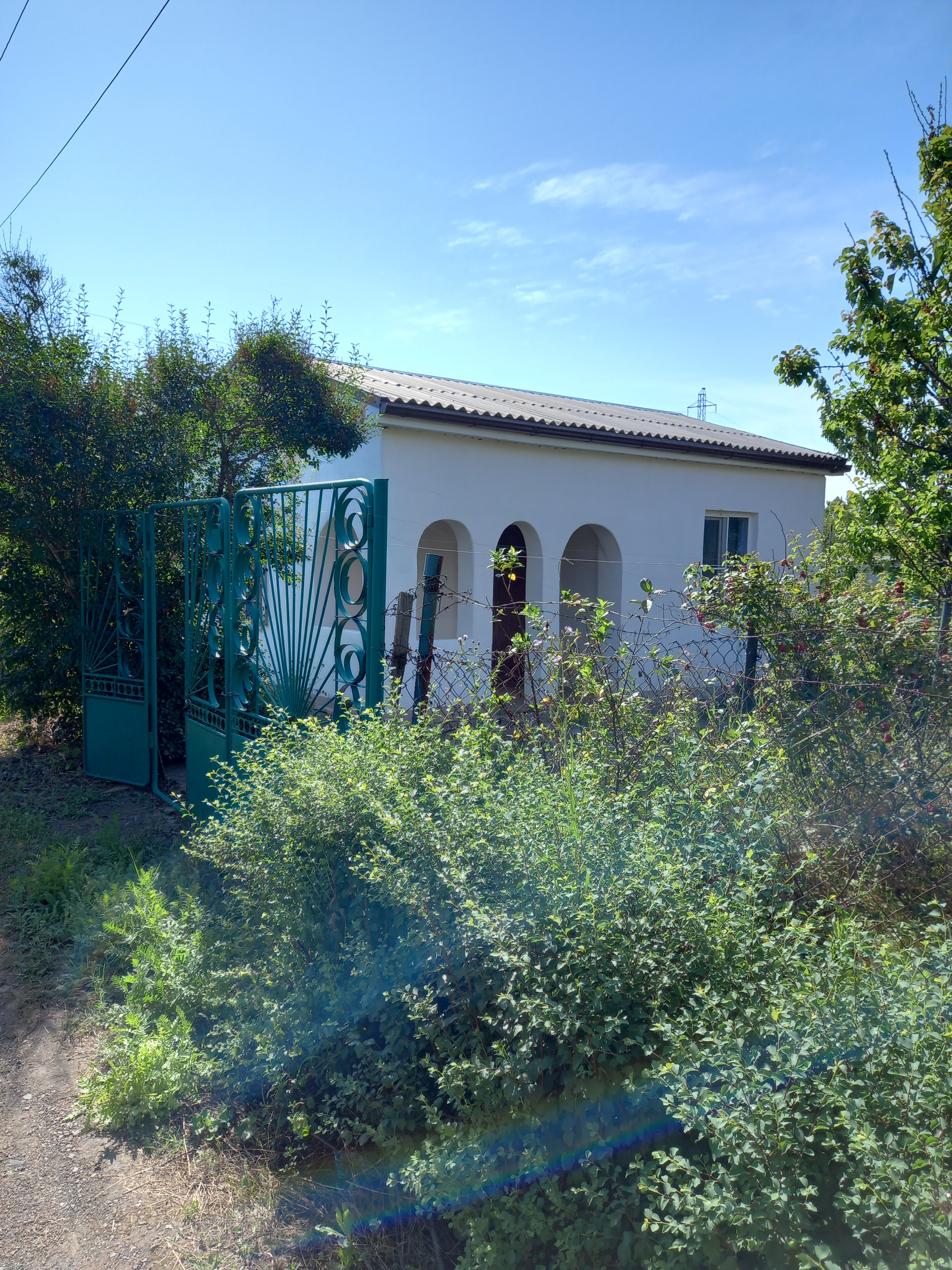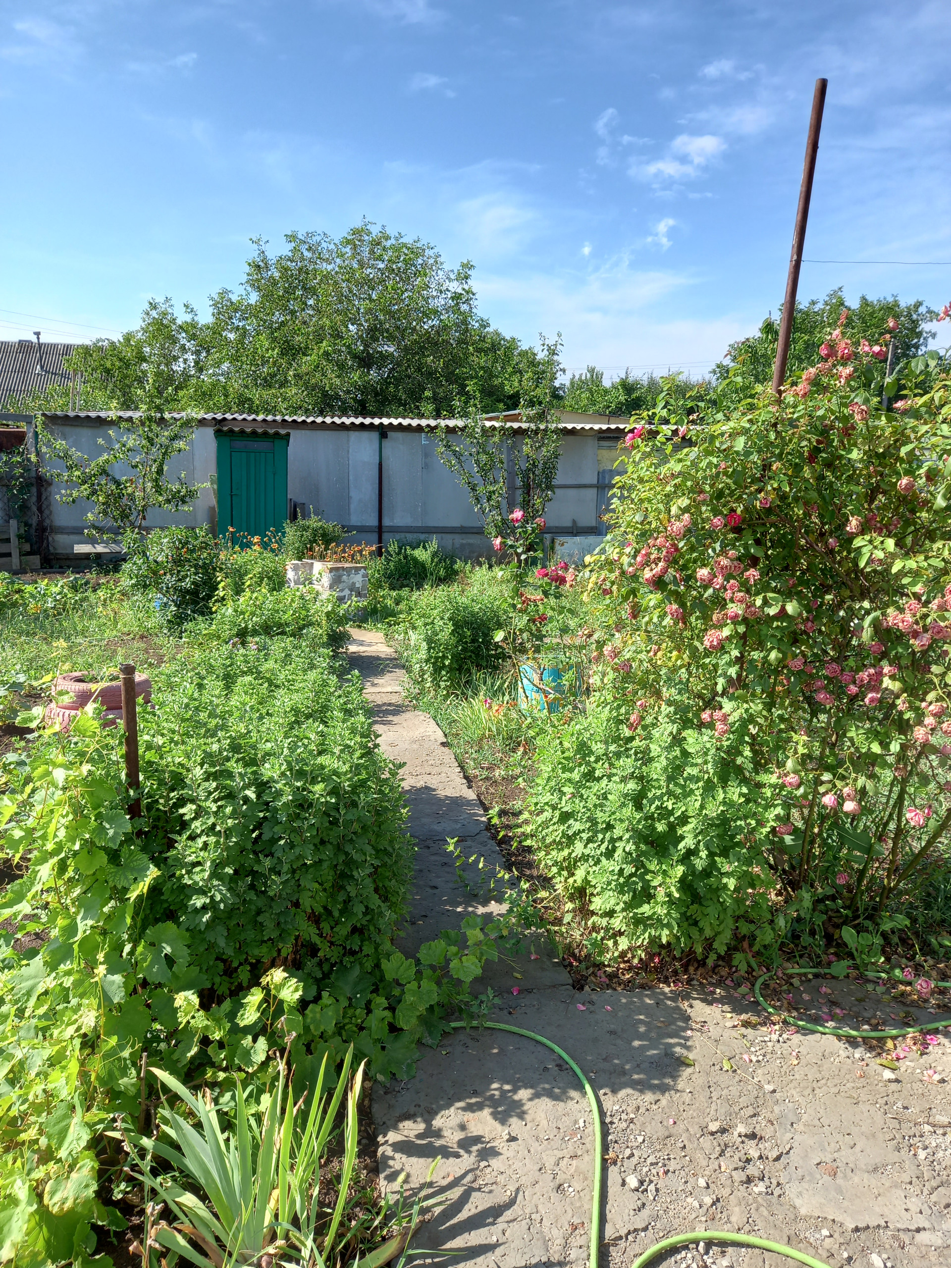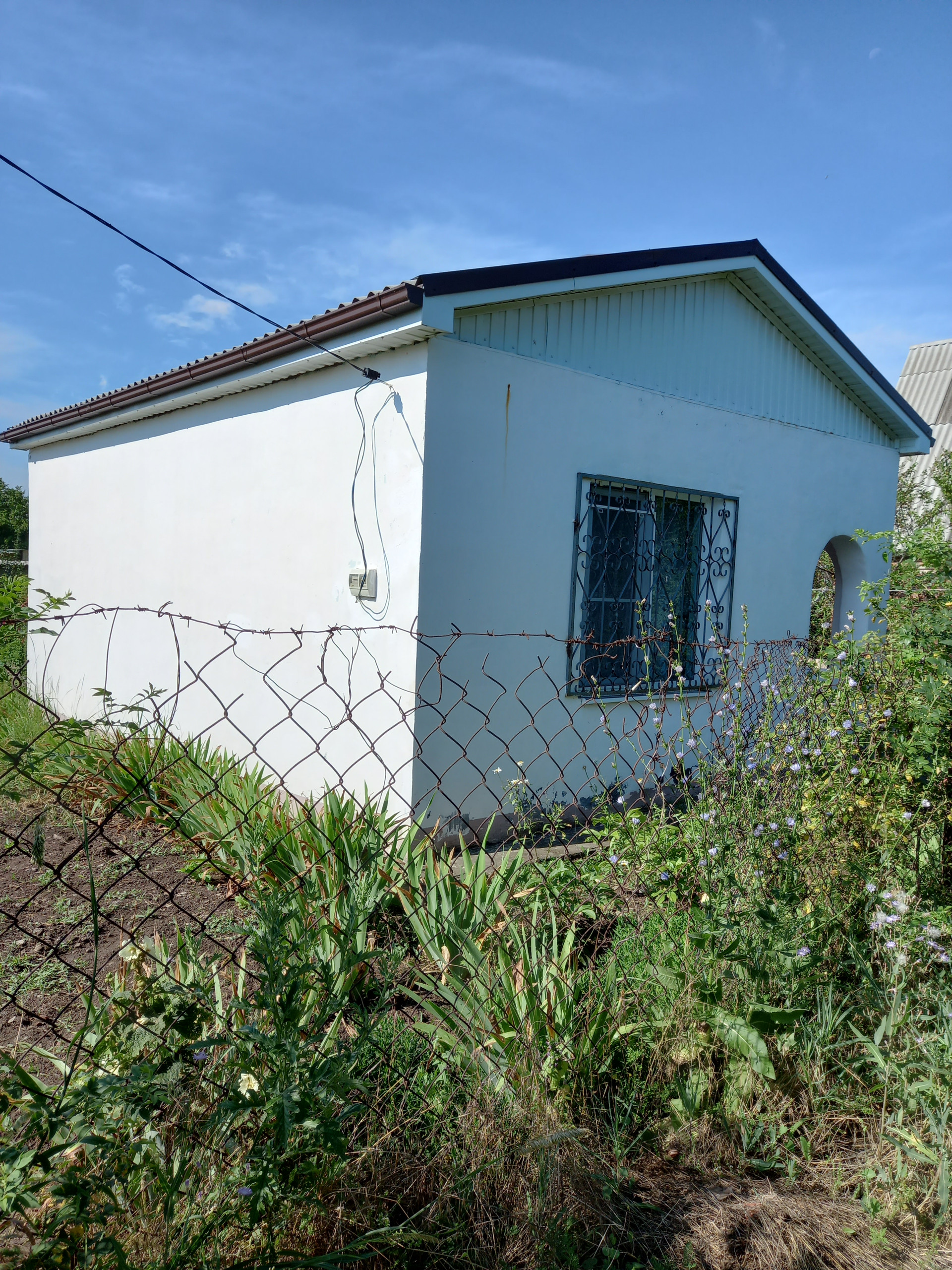 Территория огорожена. Входная калитка, въездные ворота, парковочное место. Плодовые деревья, грядка клубники, малины, смородины, ежевики.