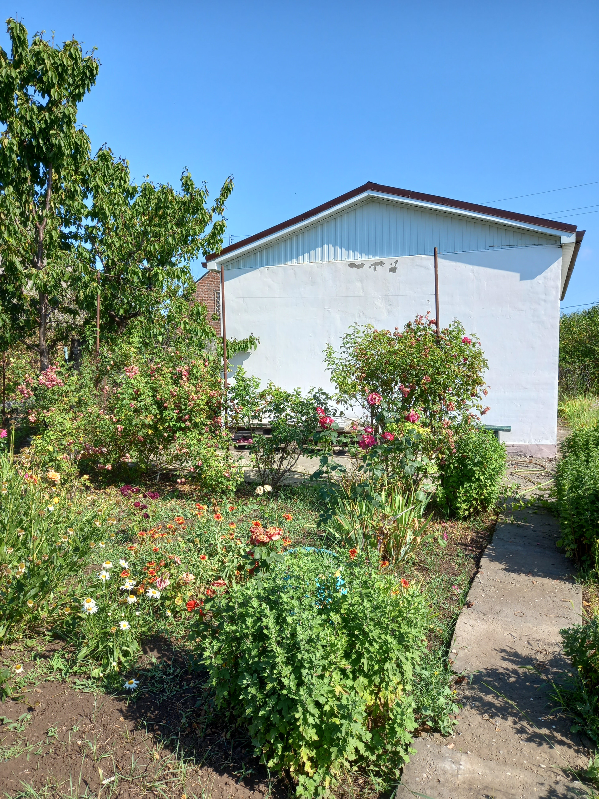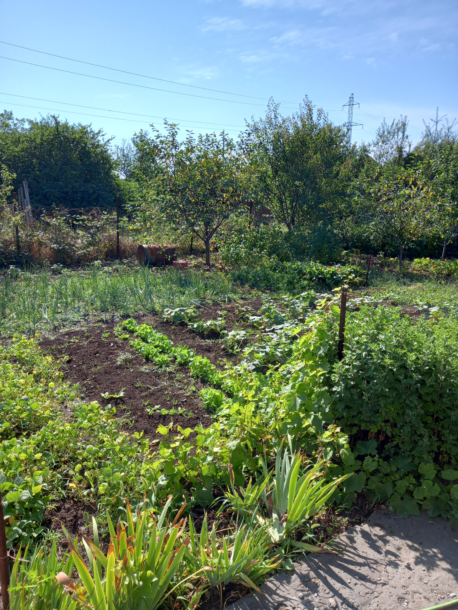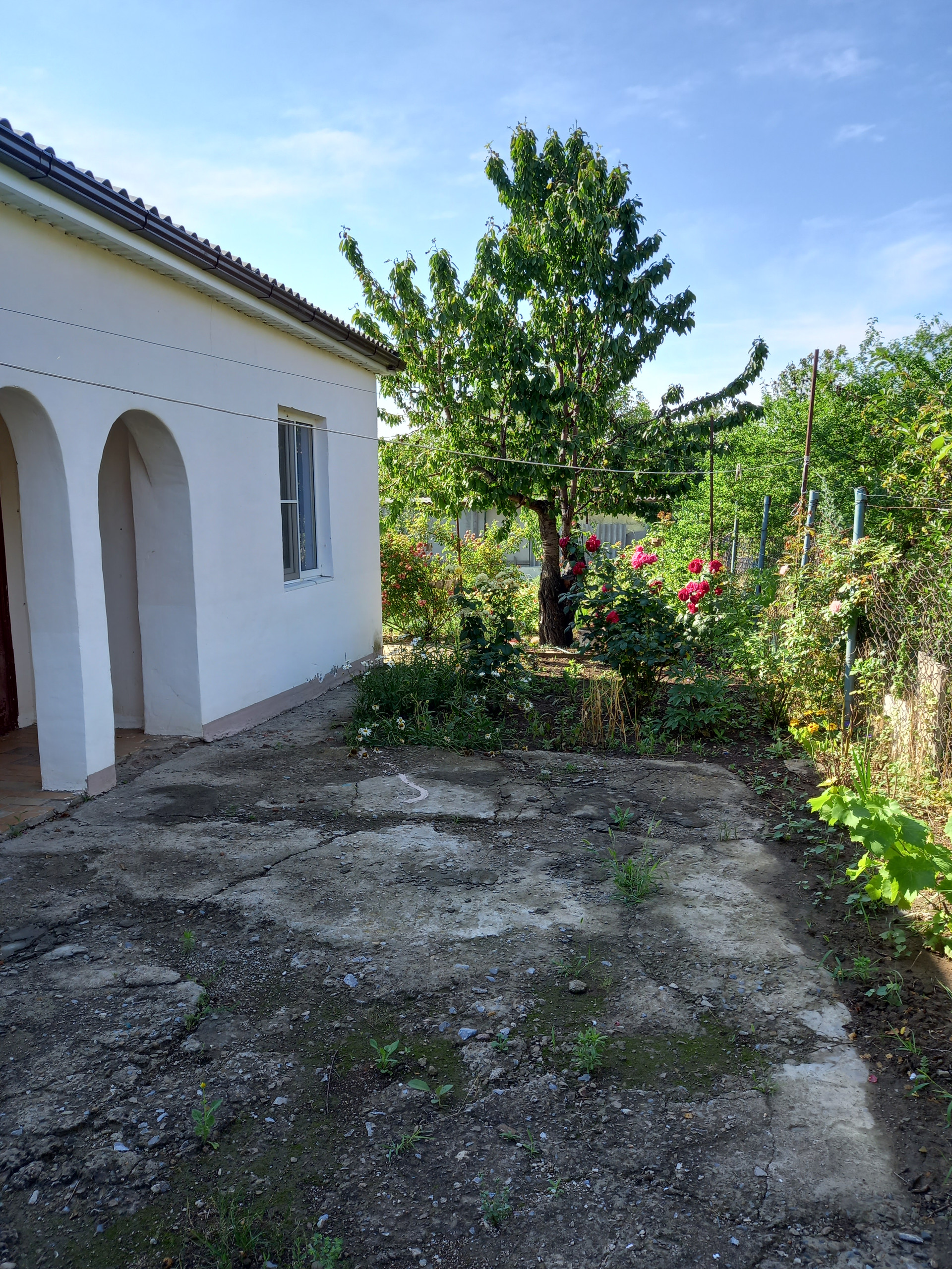 Территория огорожена. Входная калитка, въездные ворота, парковочное место. Плодовые деревья, грядка клубники, малины, смородины, ежевики.