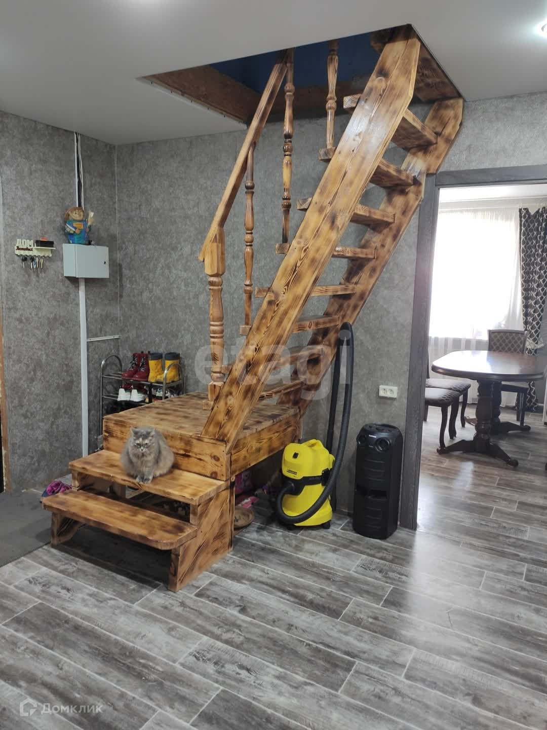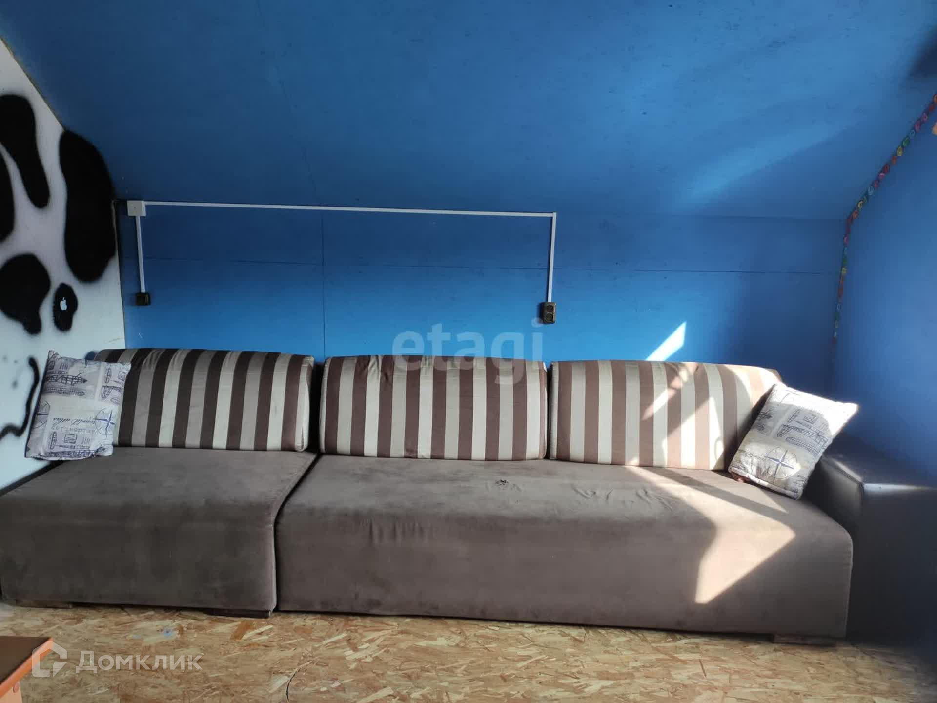 В доме имеется просторный зал, большая кухня и 3 спальни (одна на первом этаже, две - на мансардном этаже).