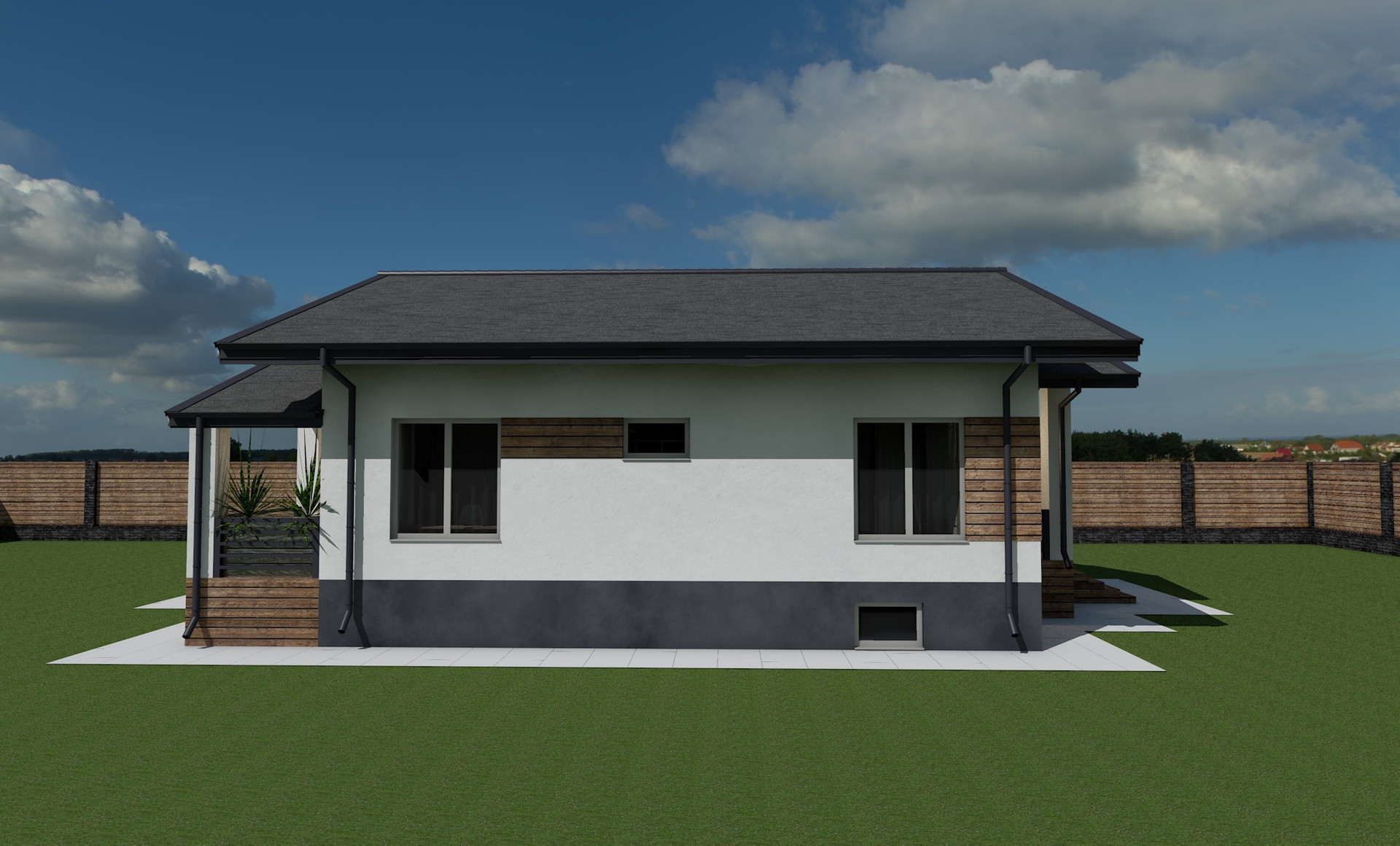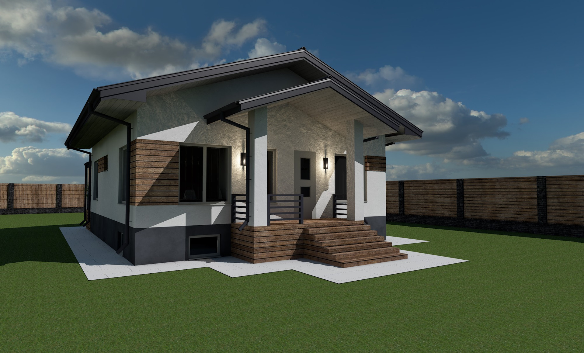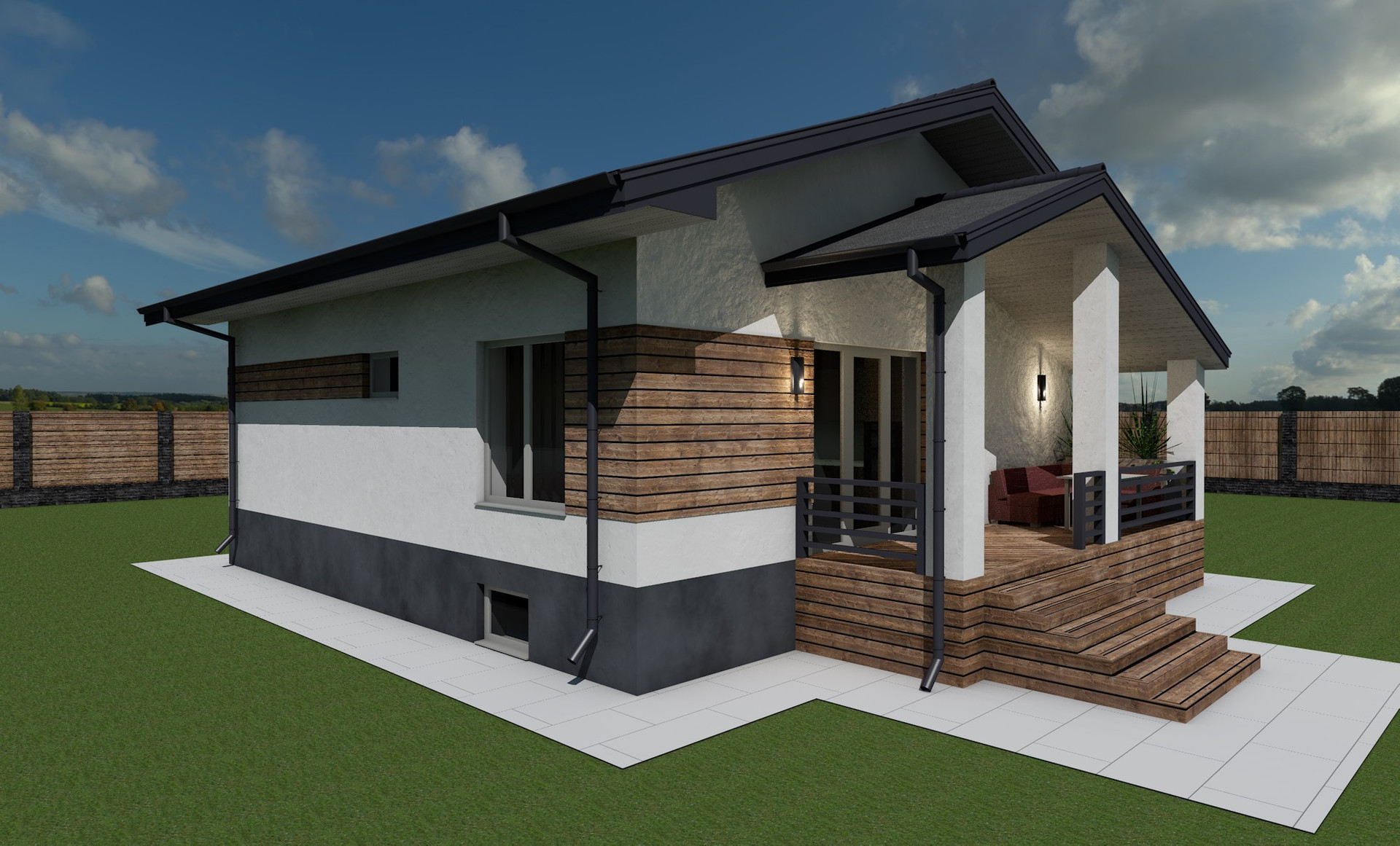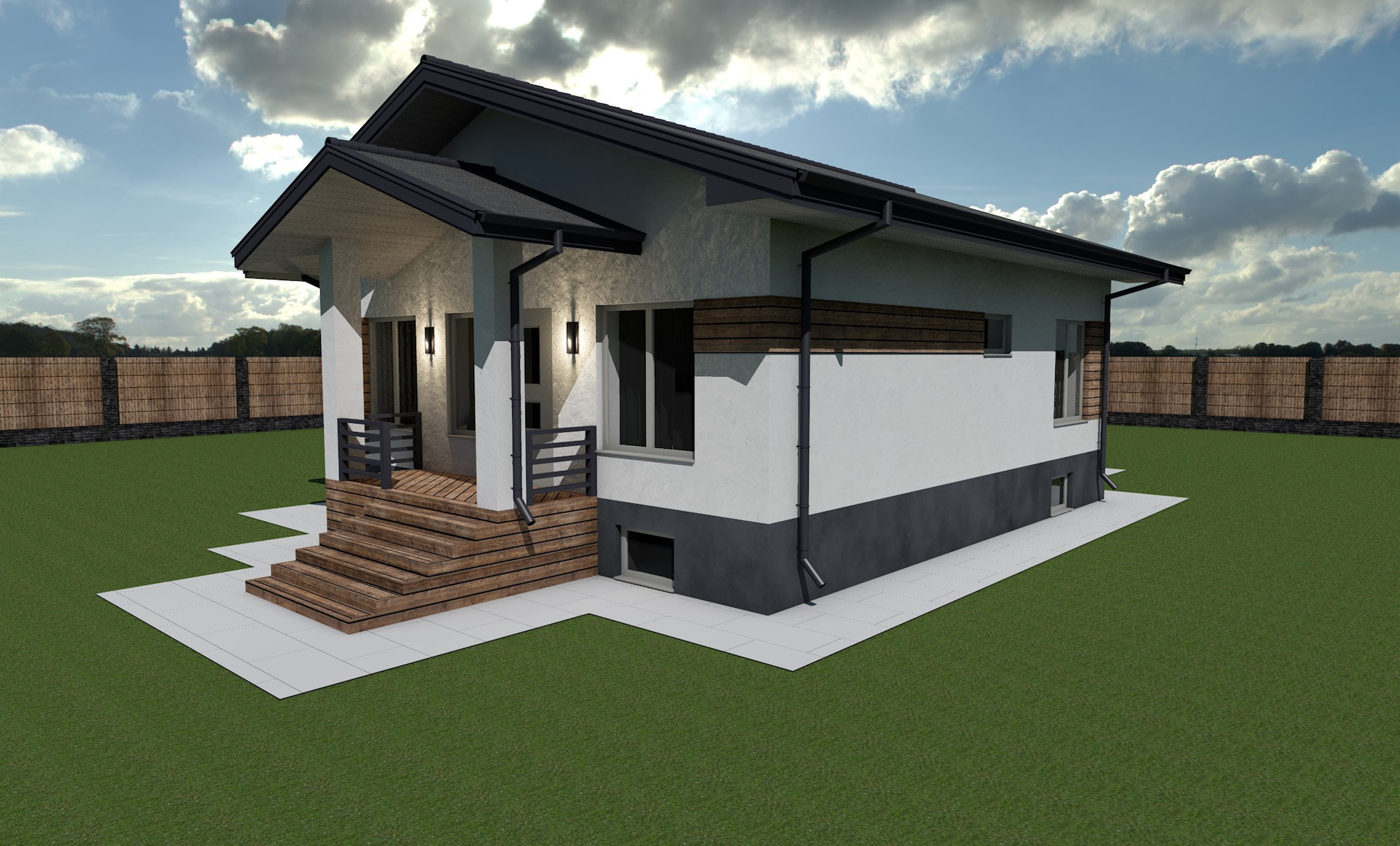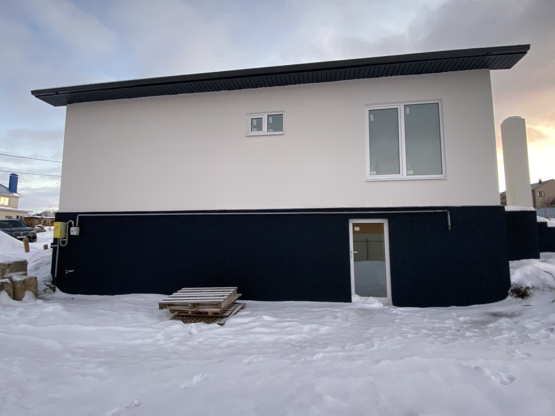 Материал стен - газосиликатный блок 30см + утеплитель 10см IZOVOL. Крыша - мягкая черепица. Перекрытия между цокольным и первым этажом - ЖБ плиты.