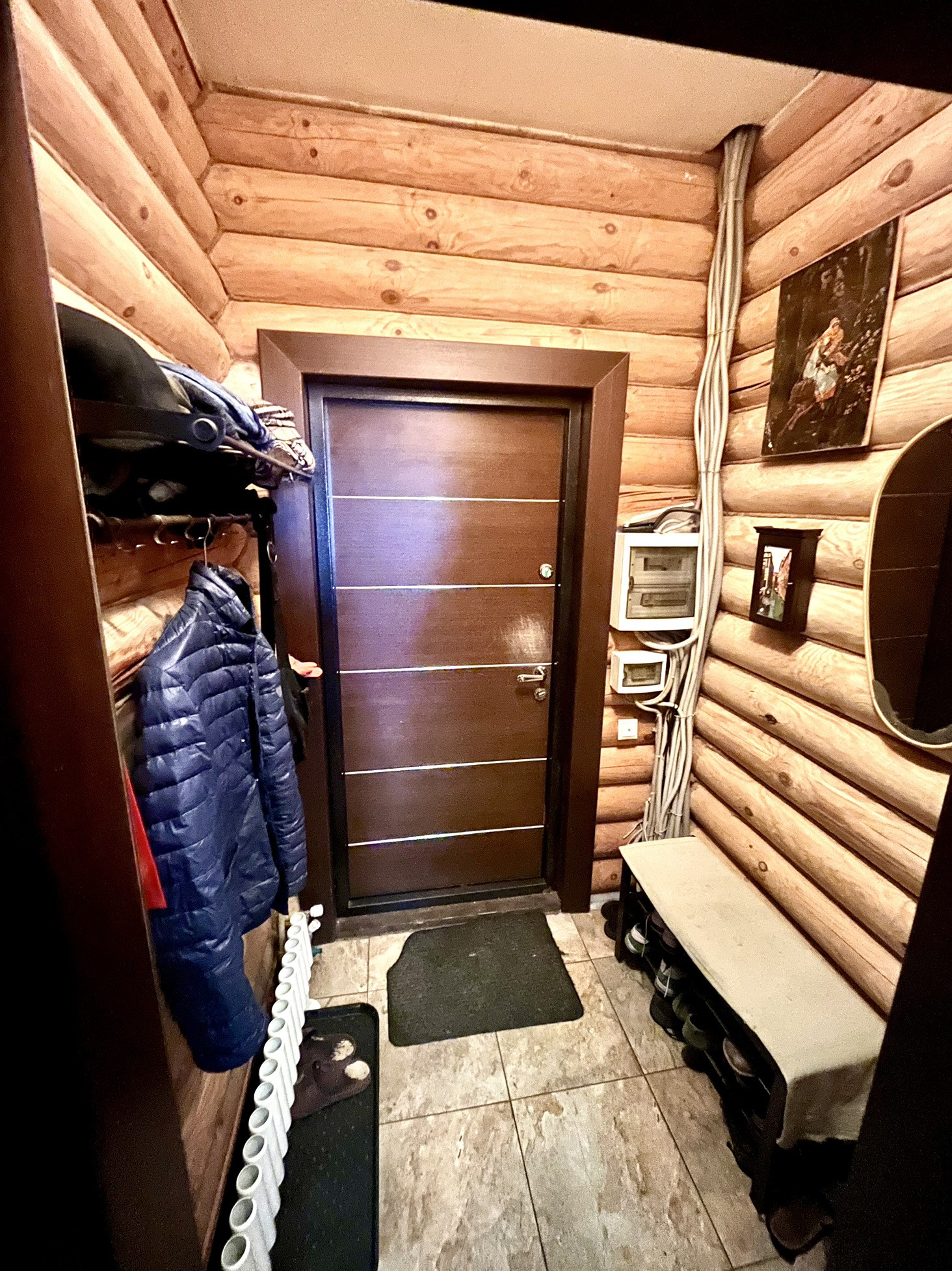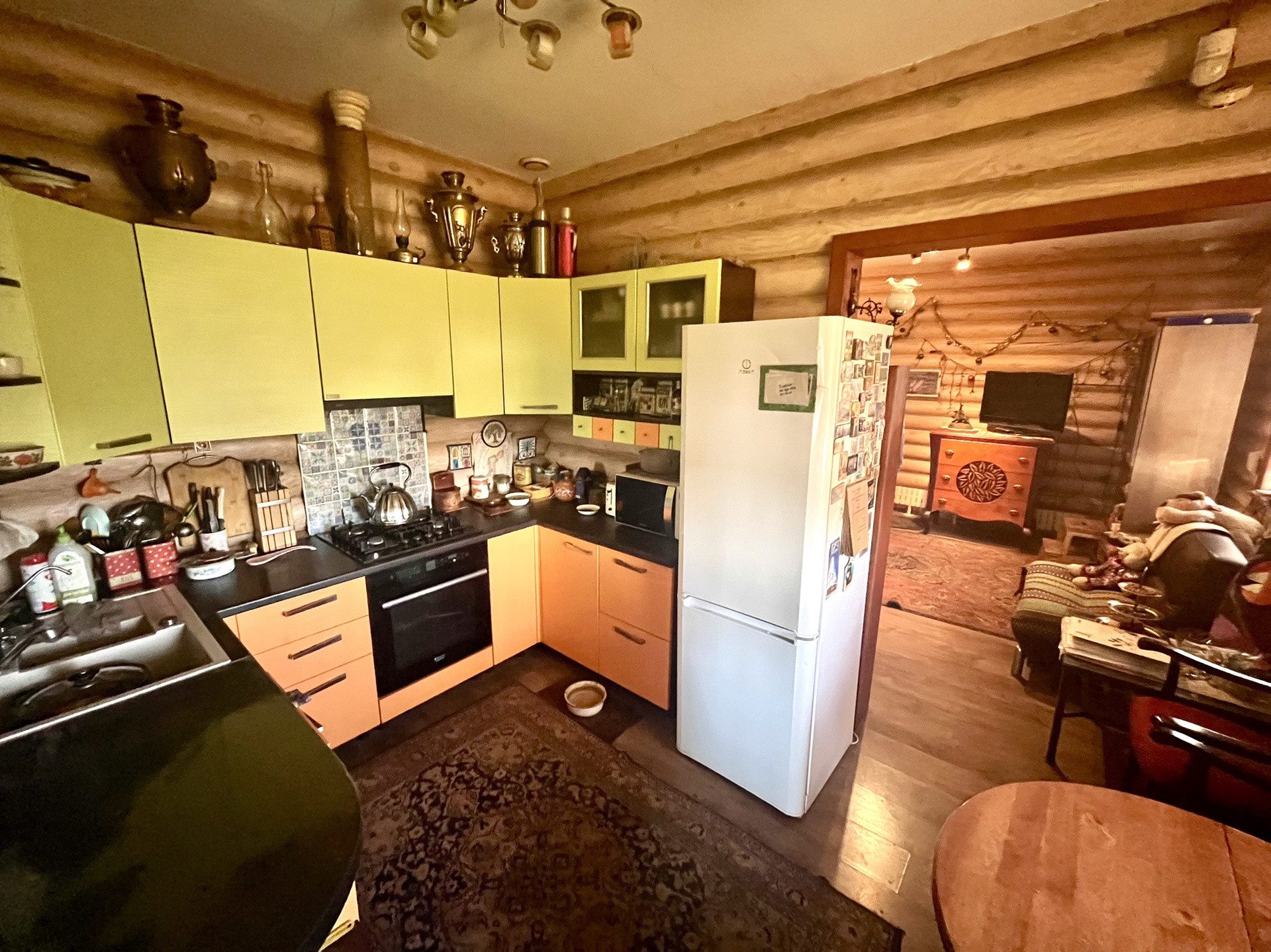 Дом 120 м2 с закрытой террасой 24 м2  выполнены из сруба сосны - oцилиндpoванное бревно 220 мм, швы между бревнами проложены джутом Лен, проведена пропитка и антисептическая обработка с внутренней и внешней стороны.