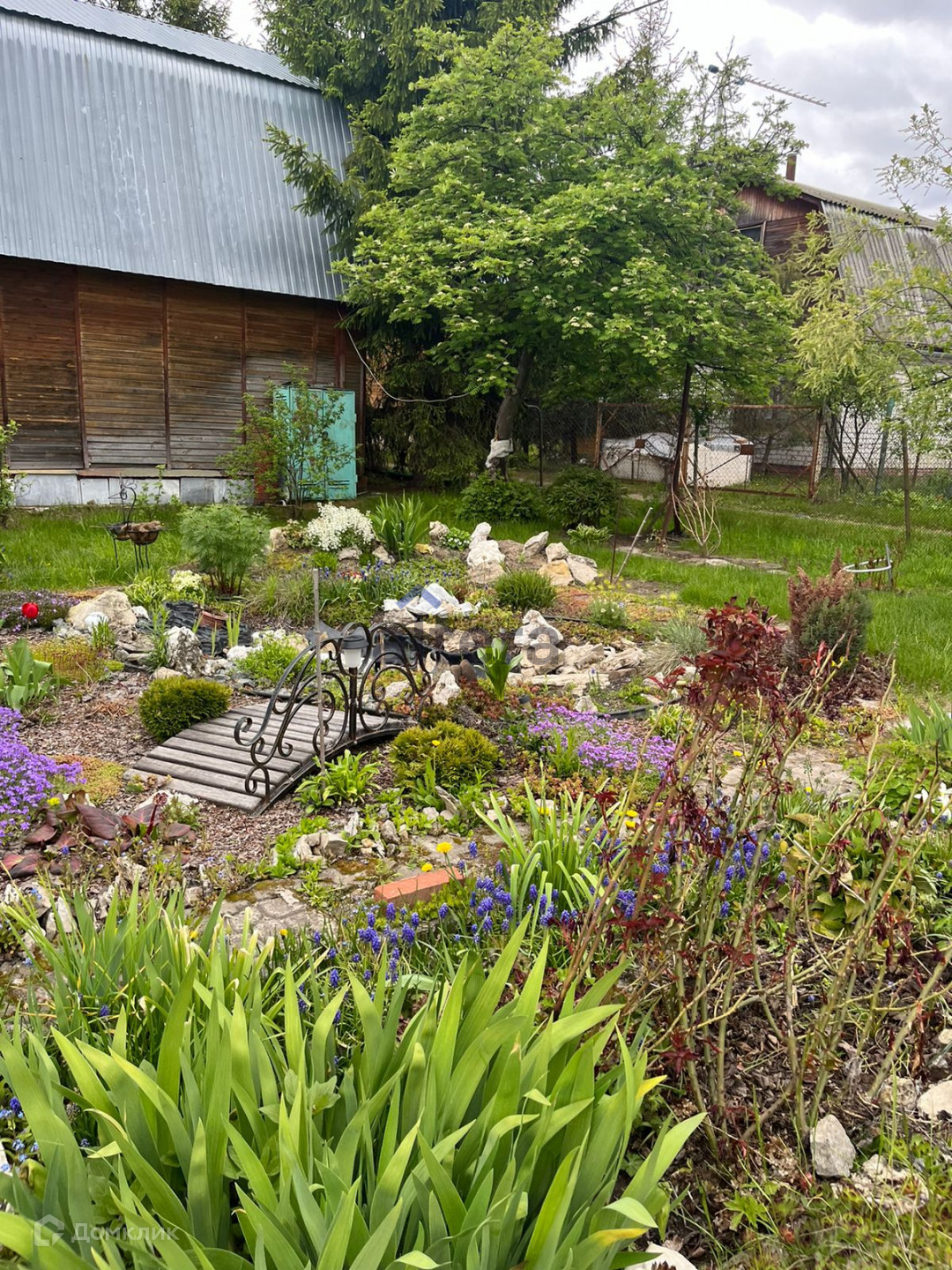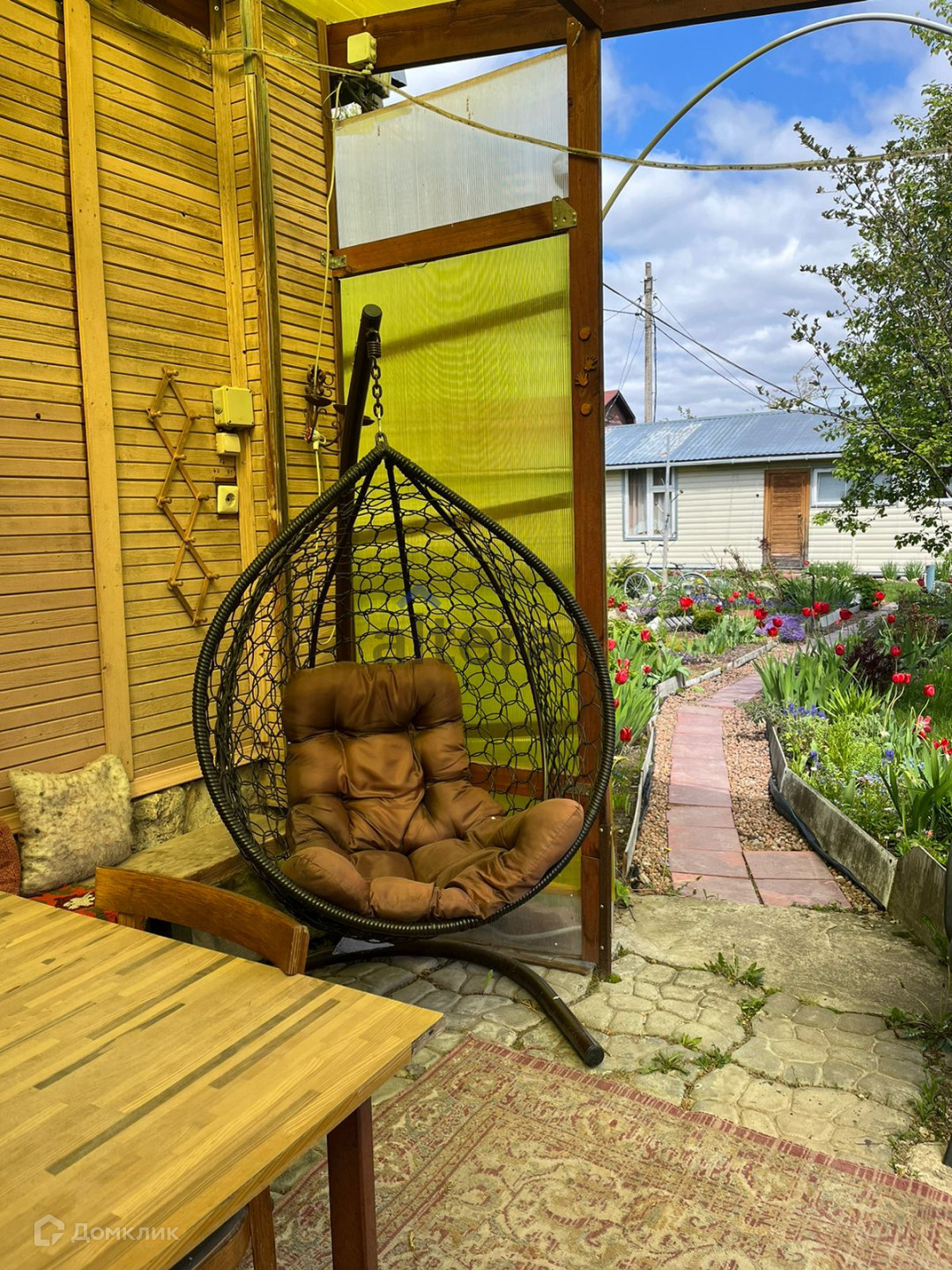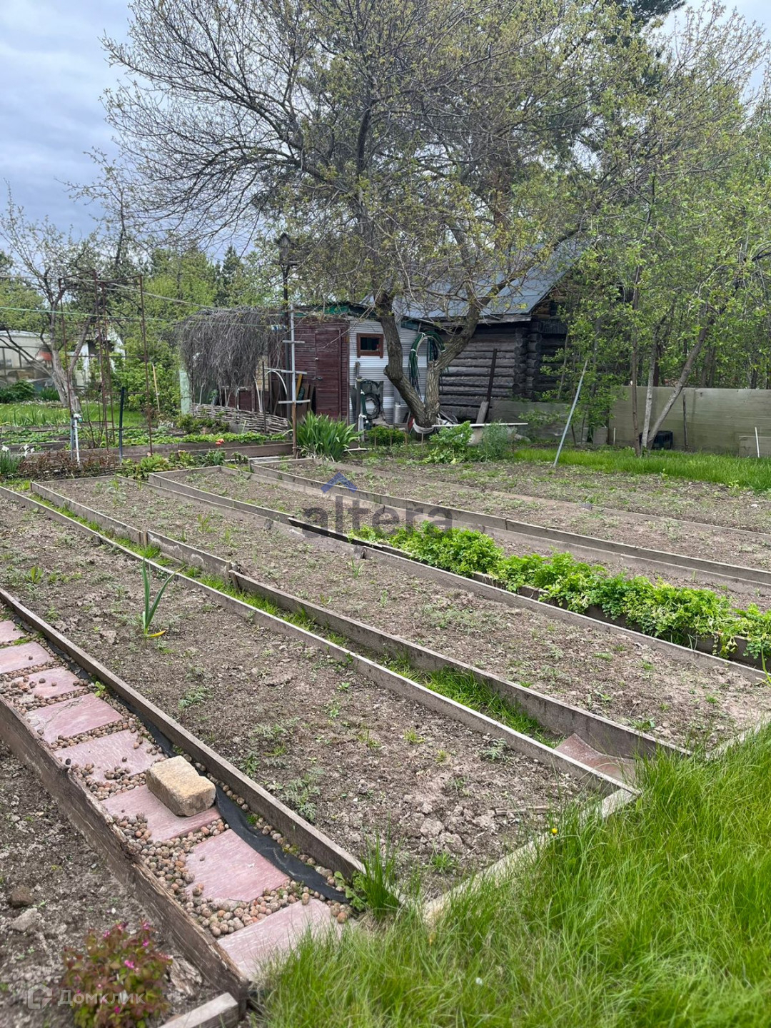 На участке двухэтажный домик, в основе которого лежит бревенчатый сруб, крытая веранда, баня с бассейном, отдельная вместительная хоз. постройка, две теплицы.