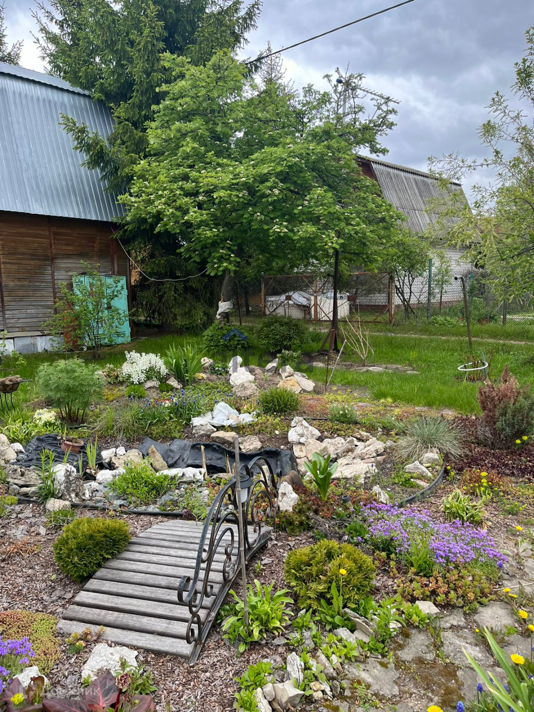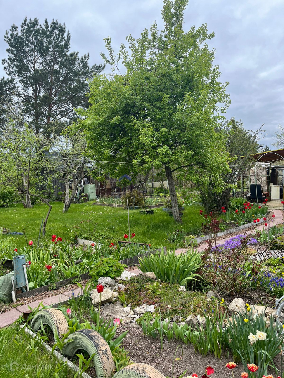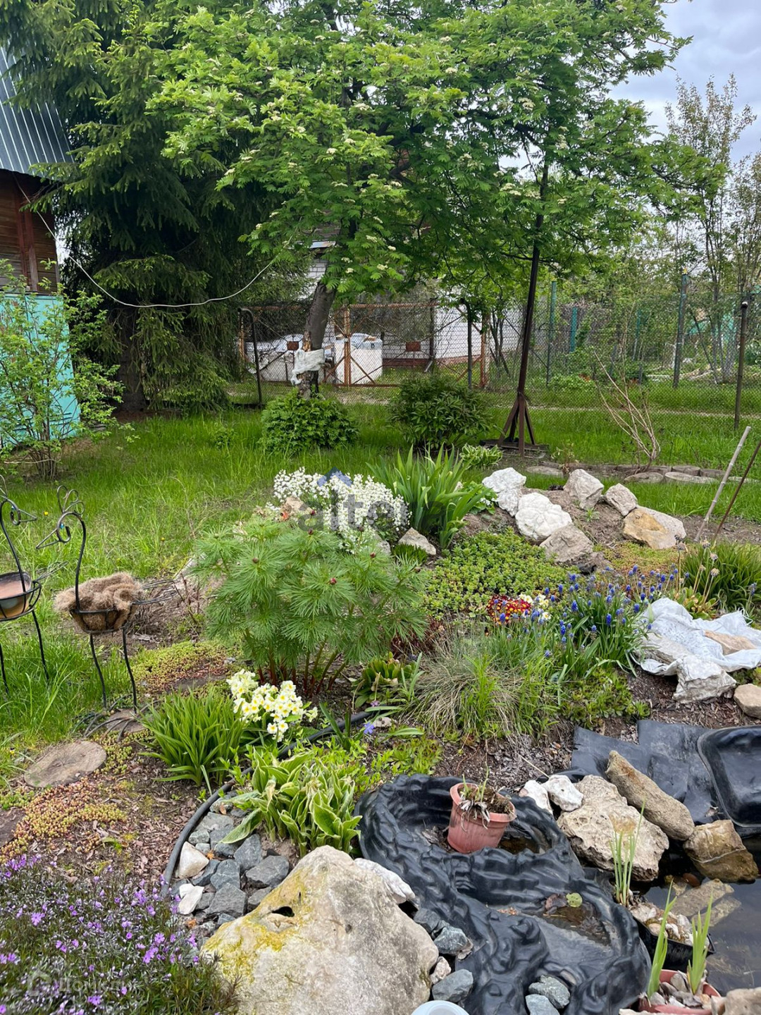 На участке находятся различные насаждения – это плодовые деревья, кустарники, ягоды, большие красивые сосны.