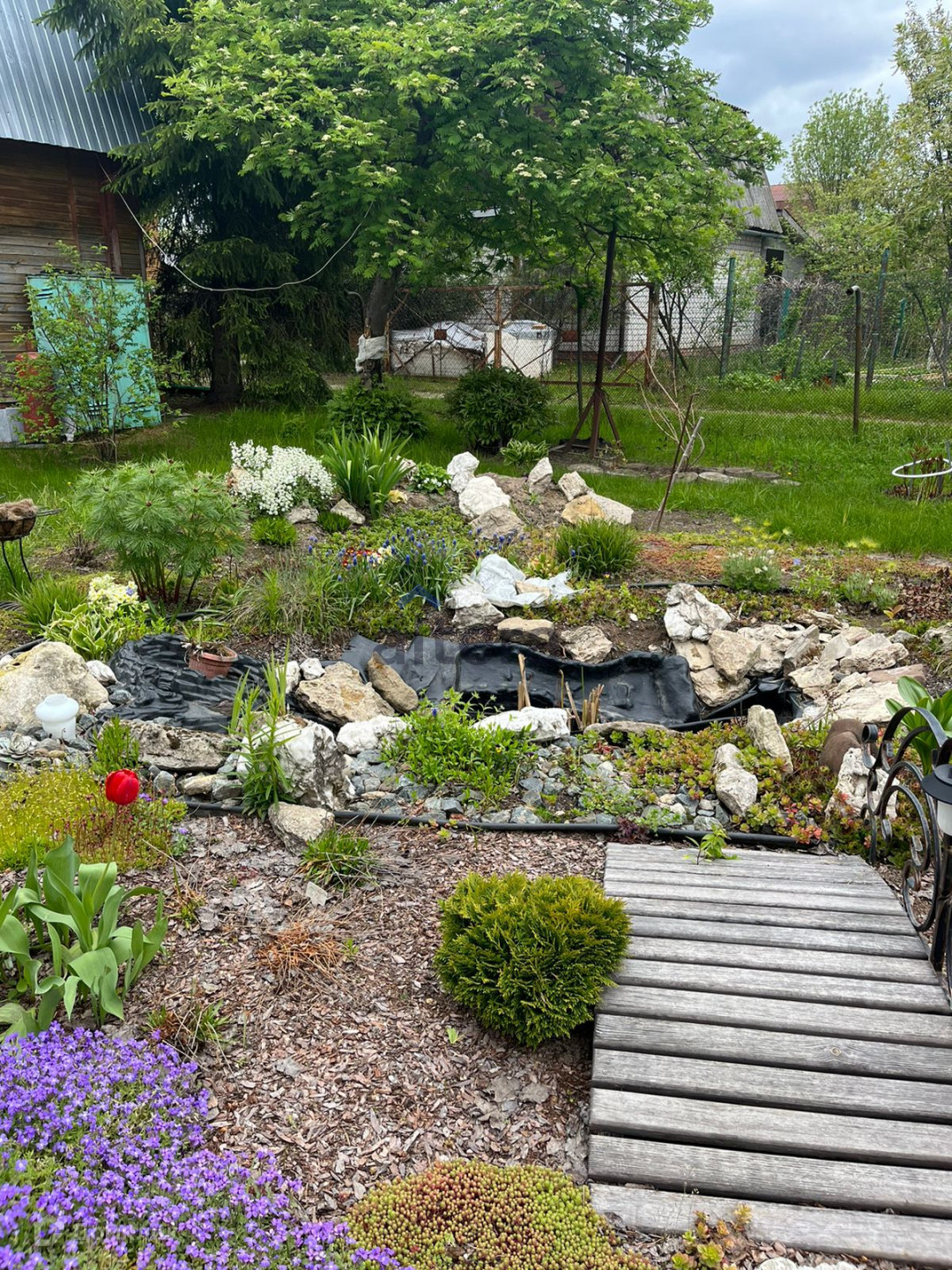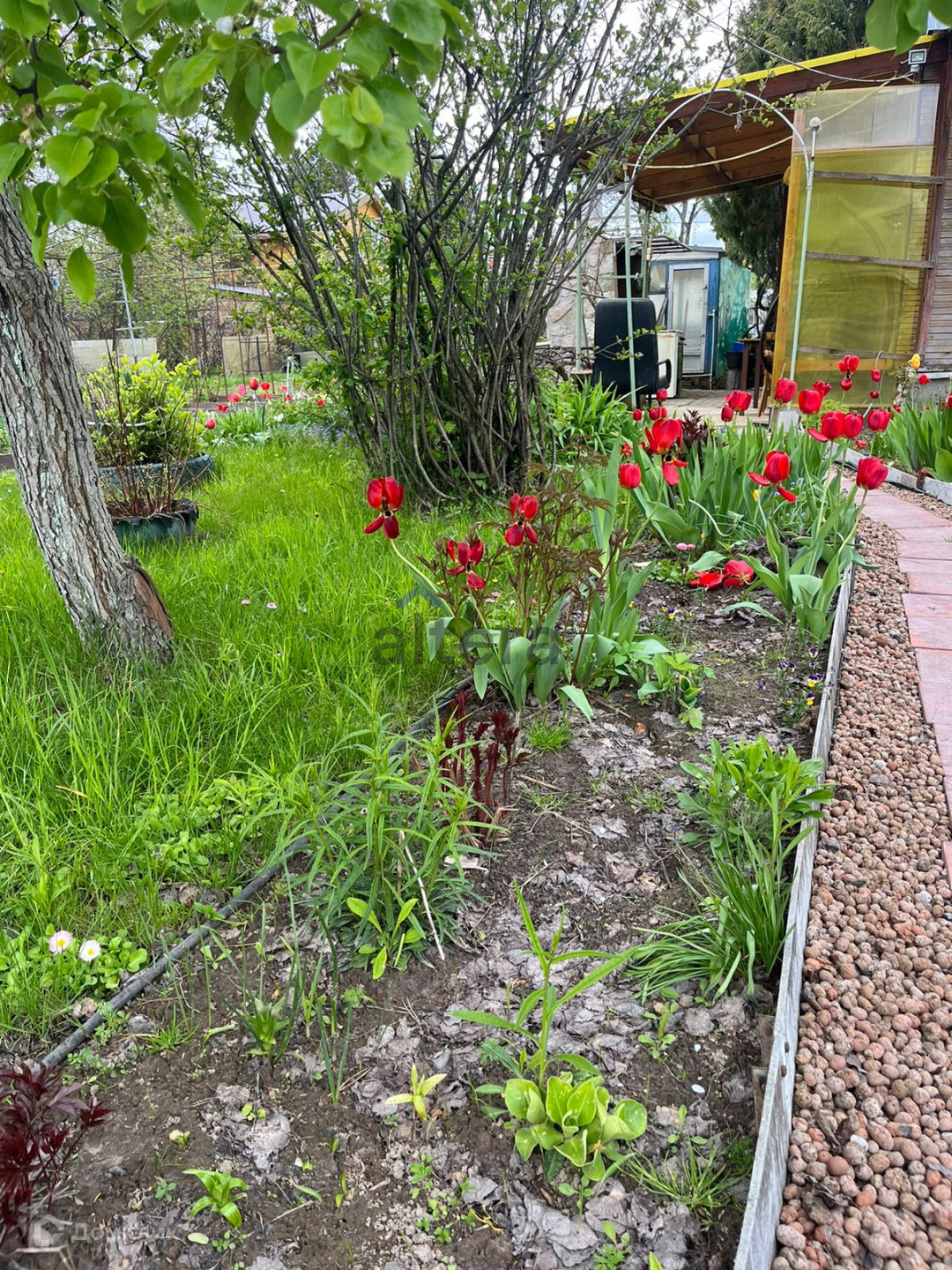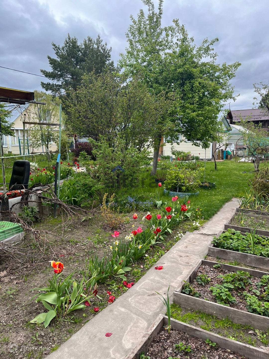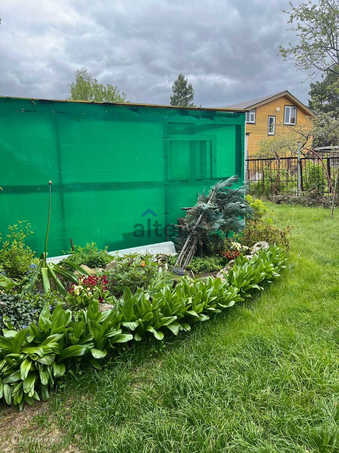 На участке находятся различные насаждения – это плодовые деревья, кустарники, ягоды, большие красивые сосны.