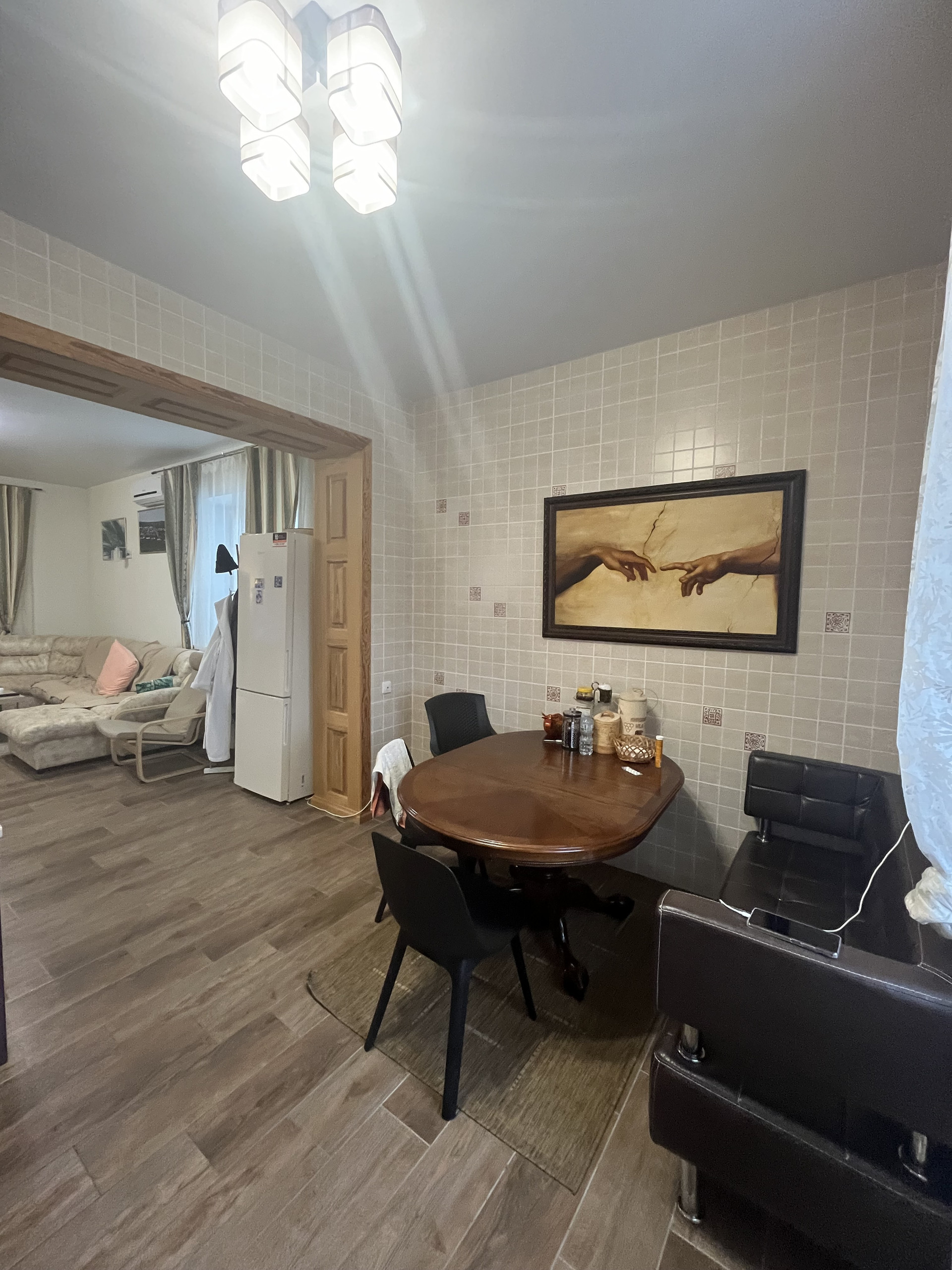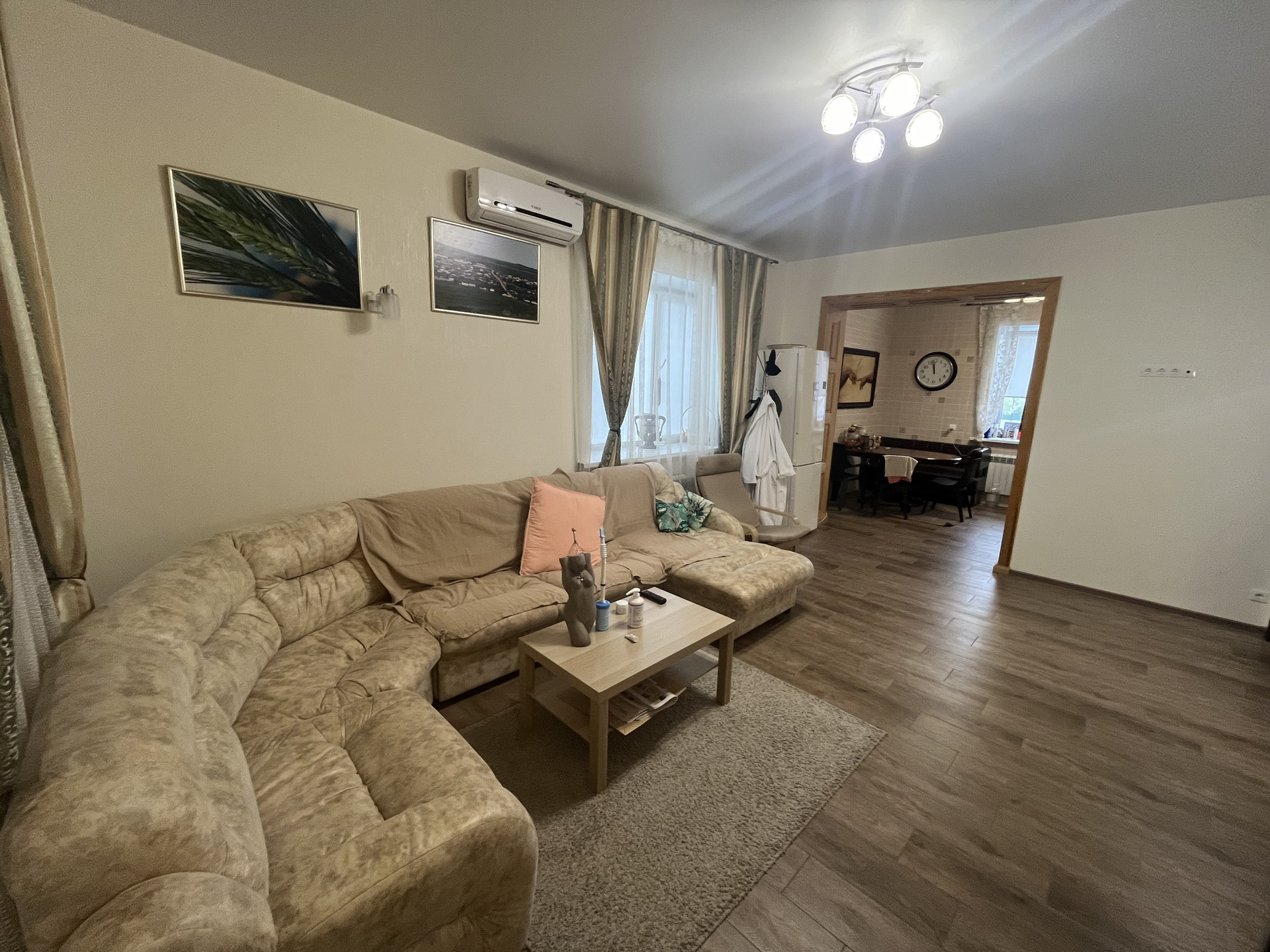 Дом полностью отделан из дорогих качественных материалов, включая тёплые полы. Под всем домом располагается отапливаемый подвал с высотой потолков 2,5 метра.