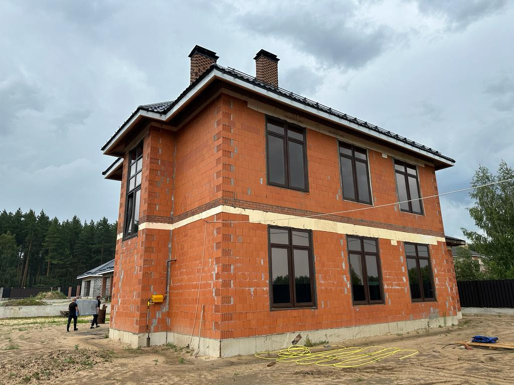фундамент - железобетонный (300 марка бетона), полы - плиты перекрытия, стены - 44 керамический блок на теплом растворе, крыша - металлочерепица Grand Line. Окна ПВХ, панорамные, 6-камерные, 82 профиль, стеклопакеты со специальным покрытием.