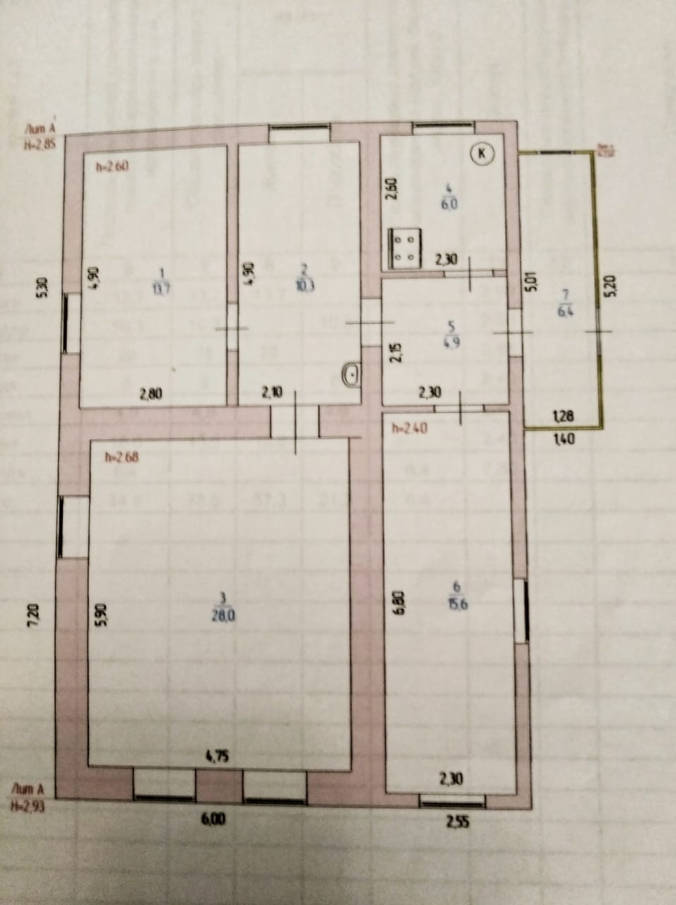 Жилая площадь дома 52м; зал 28м, потолки 2.80, комнаты 13.7 м, 10.3, кухня 15.6м.