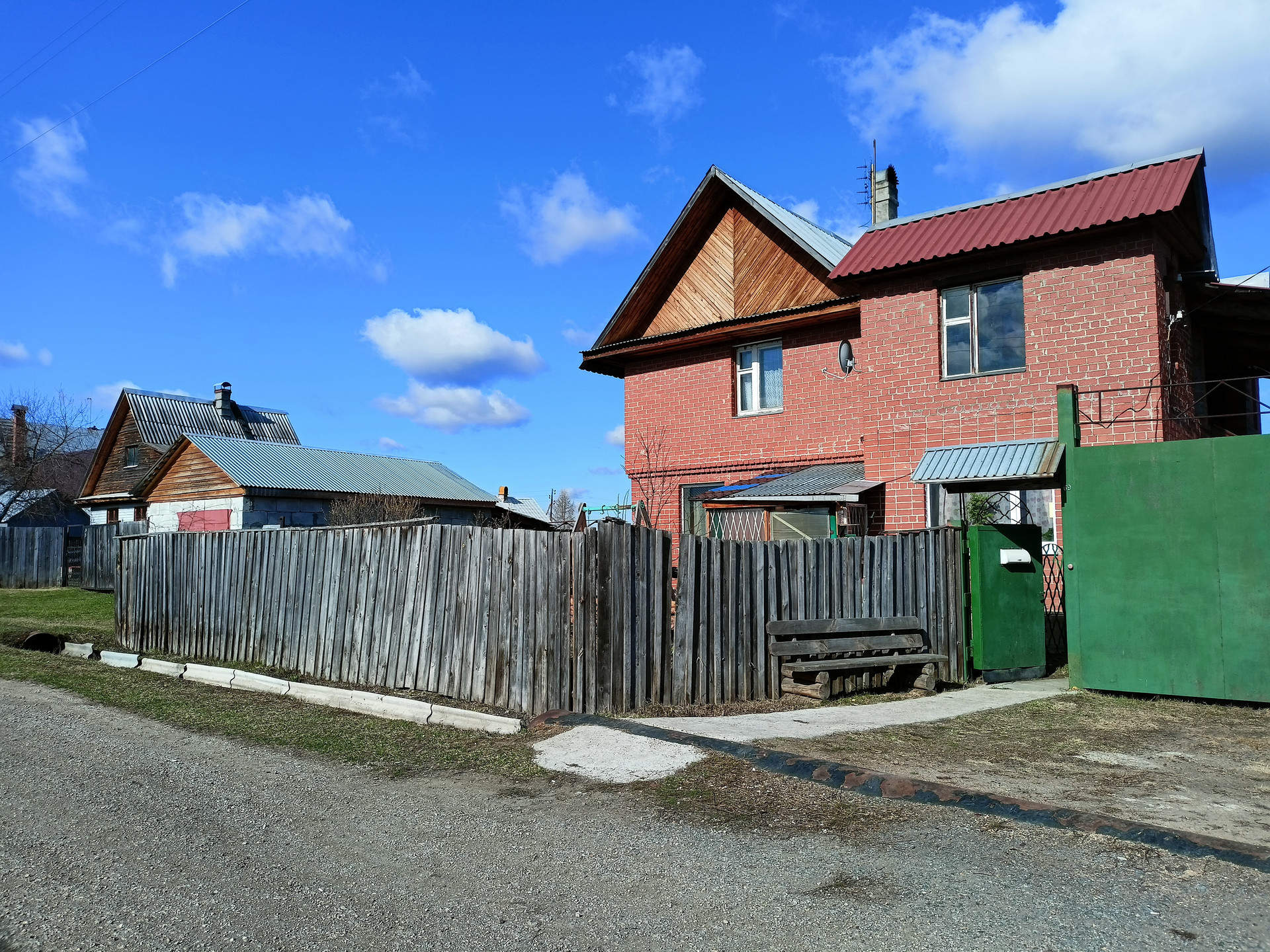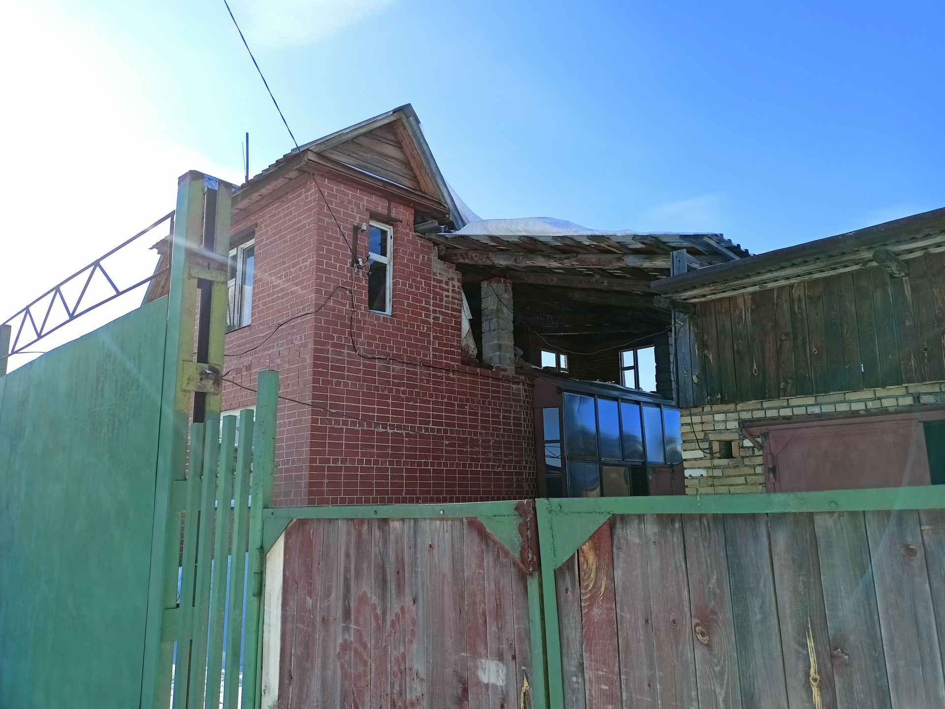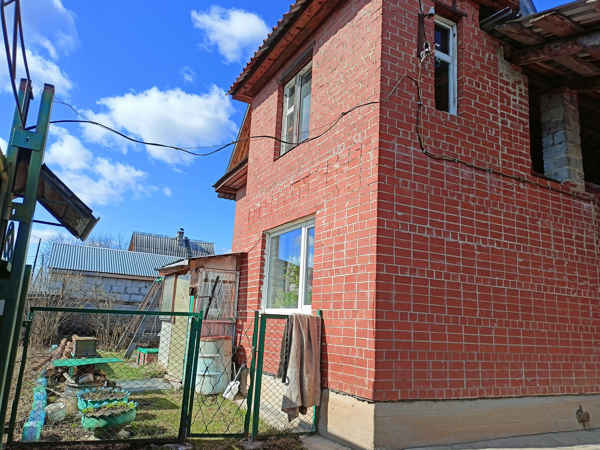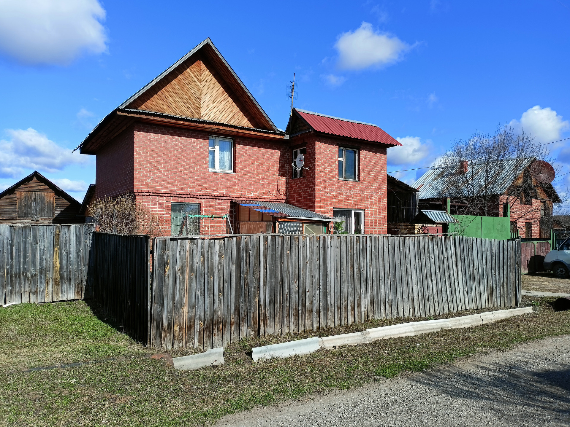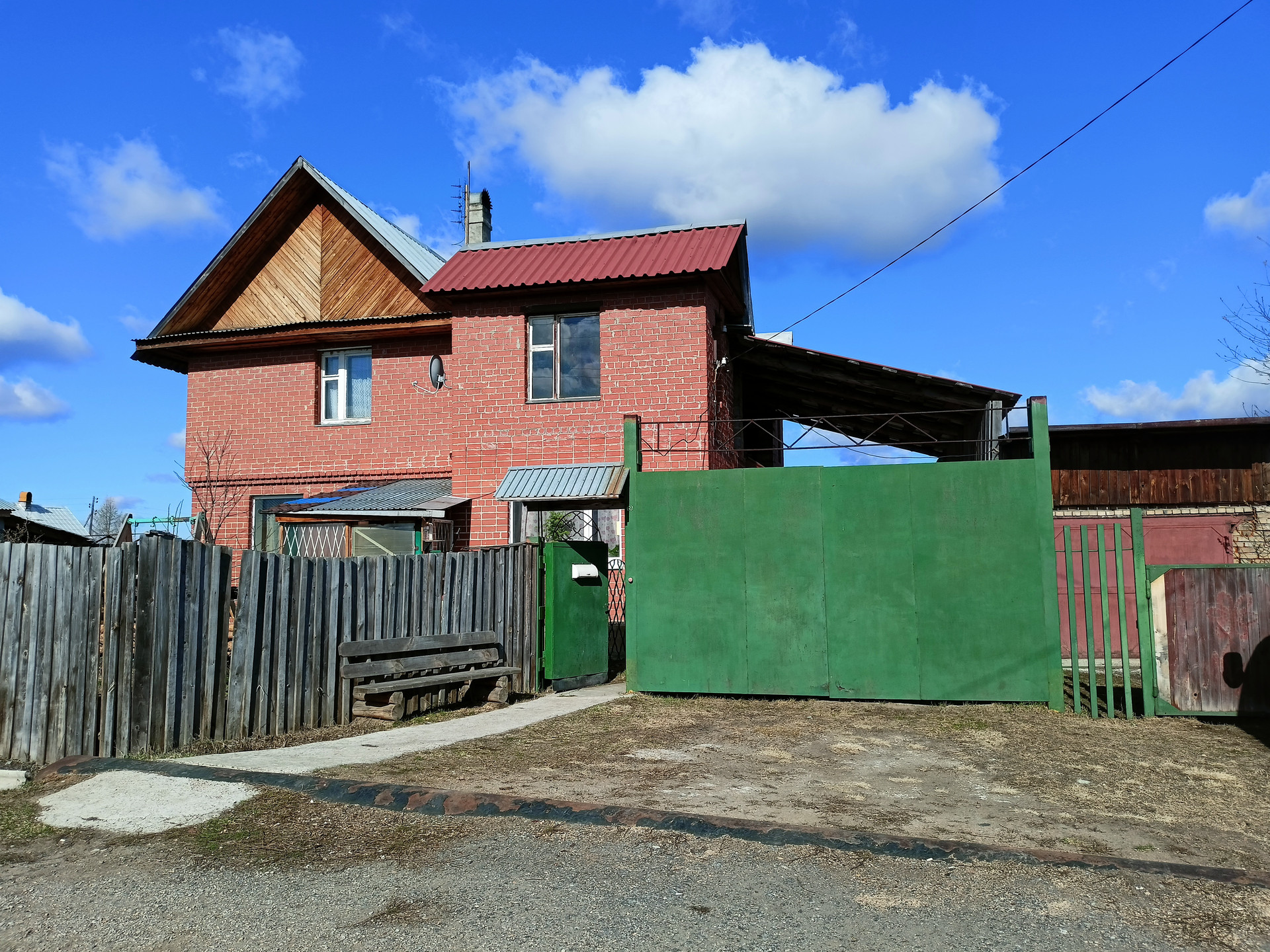 Первый этаж дома полностью из кирпича, второй этаж из бревна, обложен кирпичом.