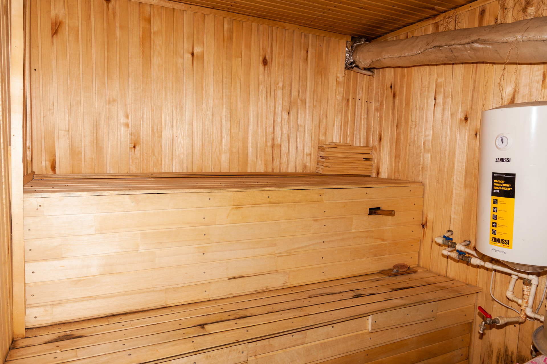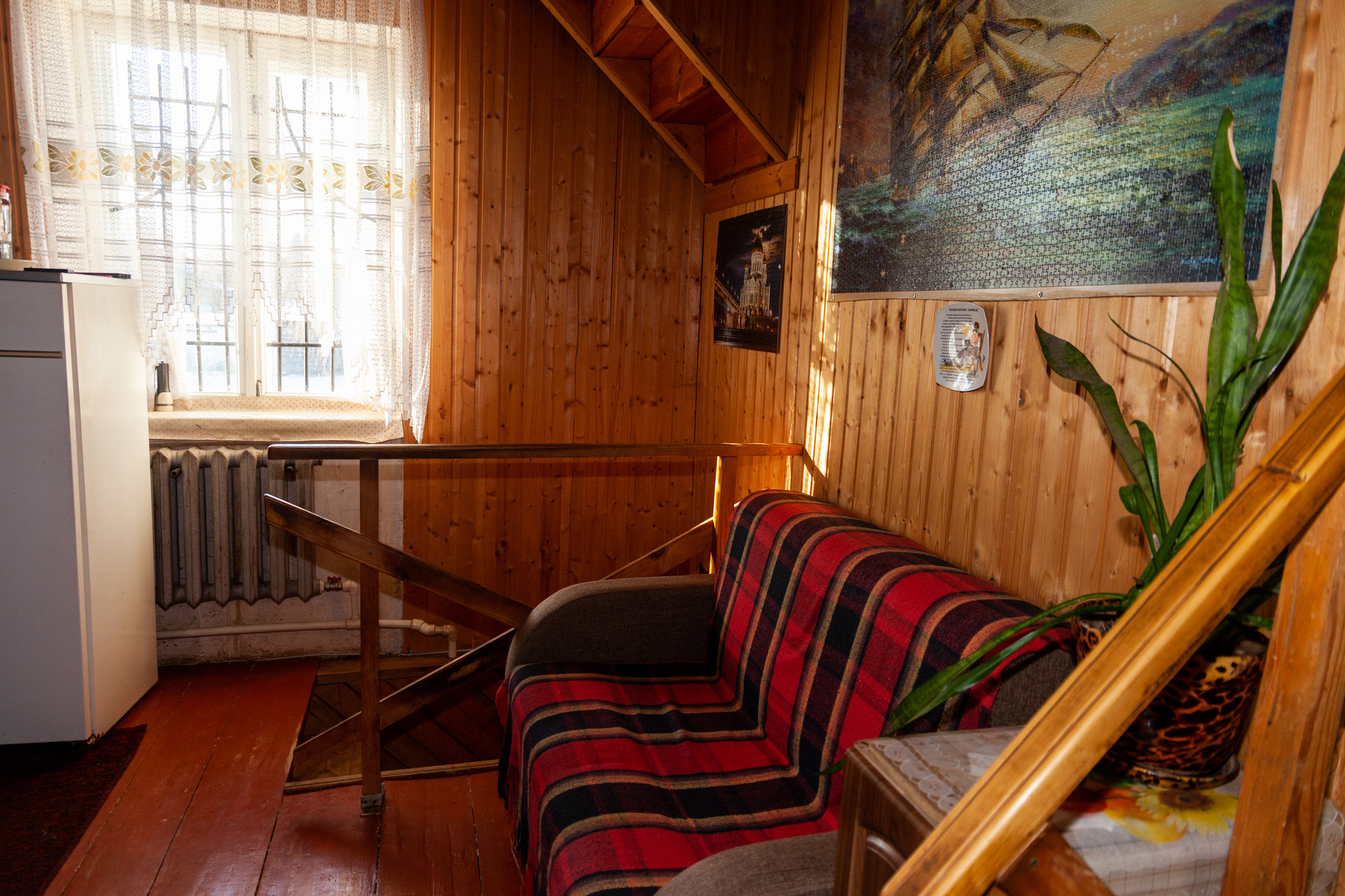 На втором этаже расположены: кухня с обеденной зоной, большая гостиная комната с потолками 4м, и две спальные комнаты. Кухня и гостиная обшиты вагонкой.