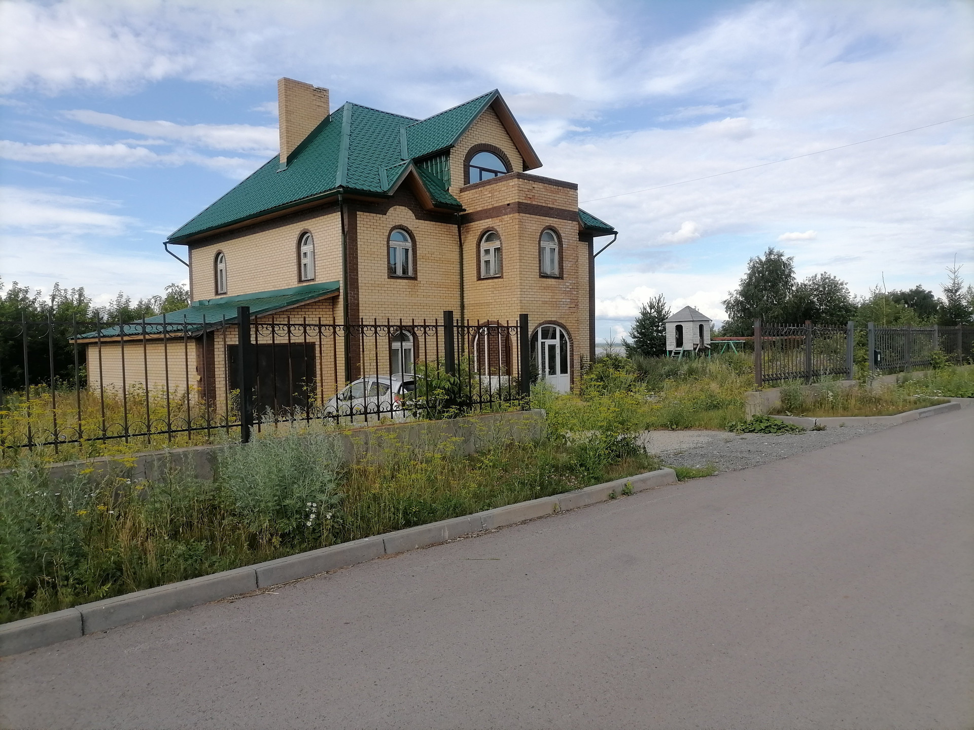 По периметру дома с садом выстроен кирпичный забор с обрешеткой и ворота для въезда в капитальный гараж, примыкающий к дому.