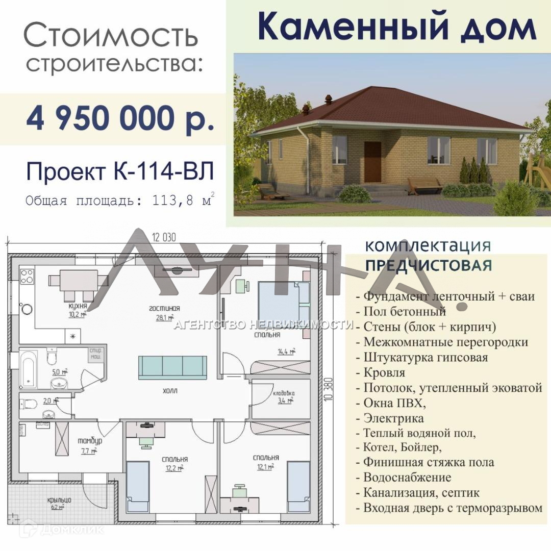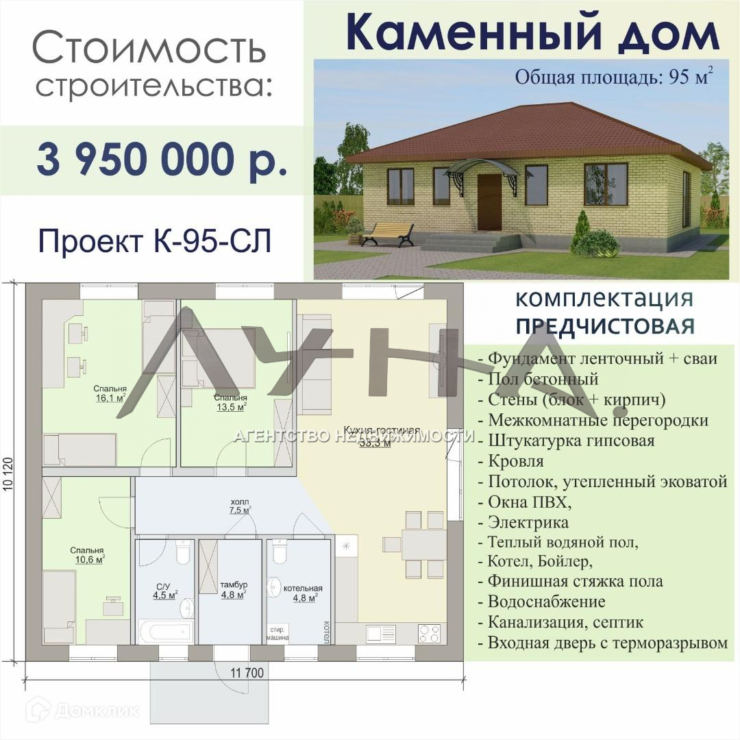 Дом в предчистовой отделке.  В наличии только участок , строительство дома начинаем после заключения договора.  Срок сдачи 4 месяца .  Это дешевле на 1 млн рублей , чем покупать готовый . Это выгоднее по % ставке в ипотеку.  Это практичнее , так как вы можете контролировать все процессы строительства ВАШЕГО дома ! И главное,  это доступно : вы можете купить , не имея первого взноса ! 30 тыс в месяц !