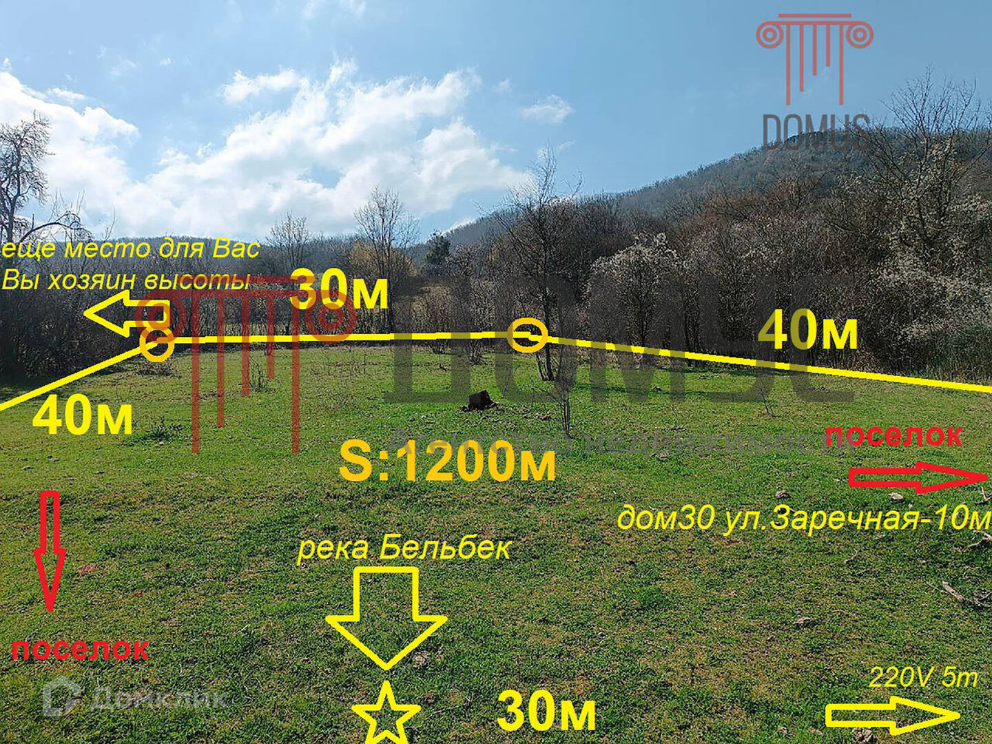 Уникальность участка заключается в том, что он находится на небольшой возвышенности с естественным ограждением из зелёных насаждений, где есть еще дополнительная площадь с естественным ограждением из кустарников и деревьев. Участок большой 30 на 40 метров - общей площадью 1200 метров. Его видно с шоссейной трассы Бахчисарай-Ялта. Имеет потрясающие видовые характеристики на горы и лес. За участком прекрасный ландшафт с тропинкой в потрясающий горный лес. В трёх минутах – горная река Бельбек.