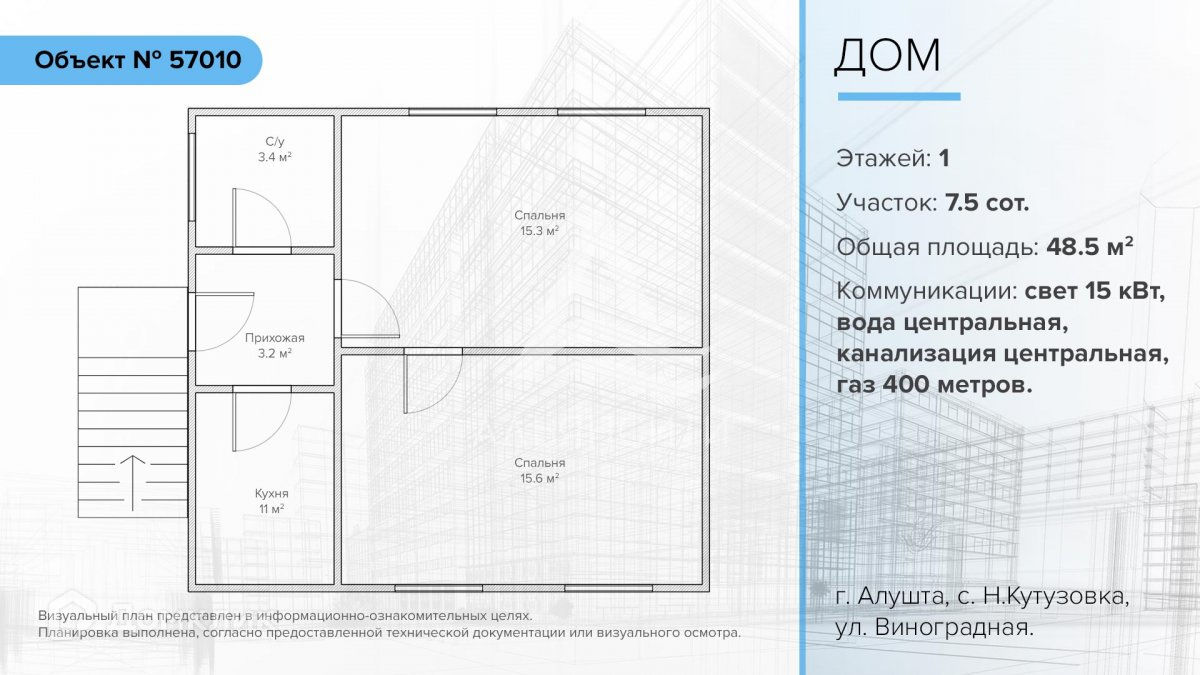 Продается 1-этажный дом в городе Алушта, село Нижняя Кутузовка, ул. Виноградная. Дом площадью 48.5 кв.м., на земельном участке 7.5 соток. Назначение: индивидуальное жилищное строительство.