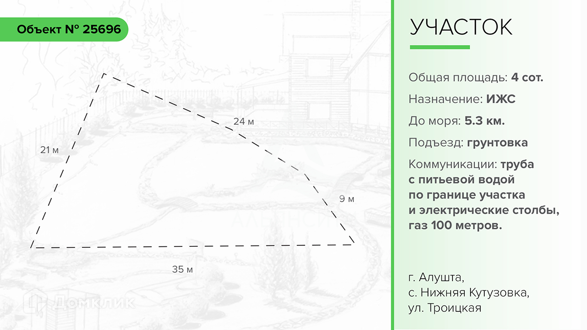 В продаже земельный участок в городе Алушта, село Нижняя Кутузовка, улица Троицкая. Общая площадь участка: 4 сотки. Назначение: индивидуальное жилищное строительство.