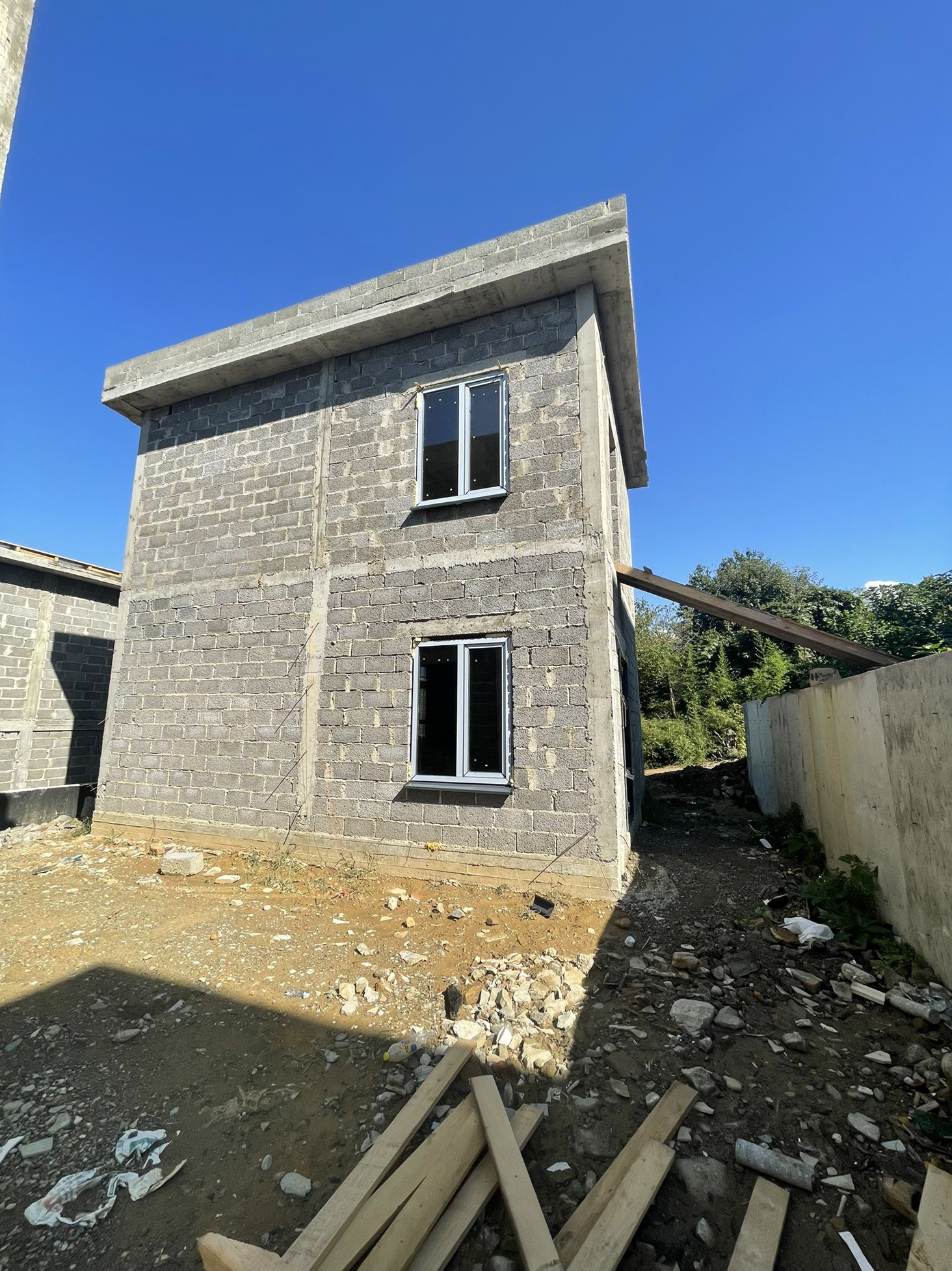 Двух этажный дом с панорамными окнами. Первый этаж кухня Гостиная. Второй этаж две спальни. Вид на море. Коммуникации: электричество, вода, канализация.